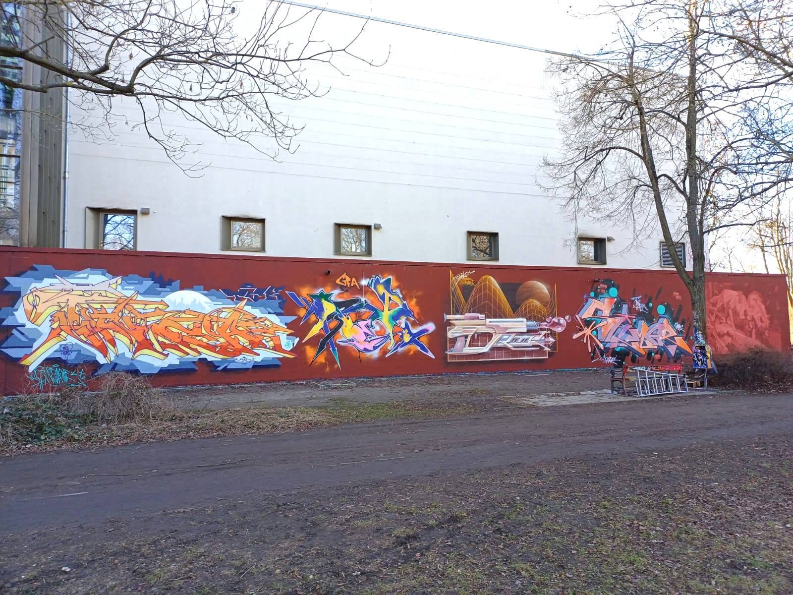 The graffiti from left to right were made by INKA, MOKOE, KIMS and OLAF OBACHT aka GLURAK