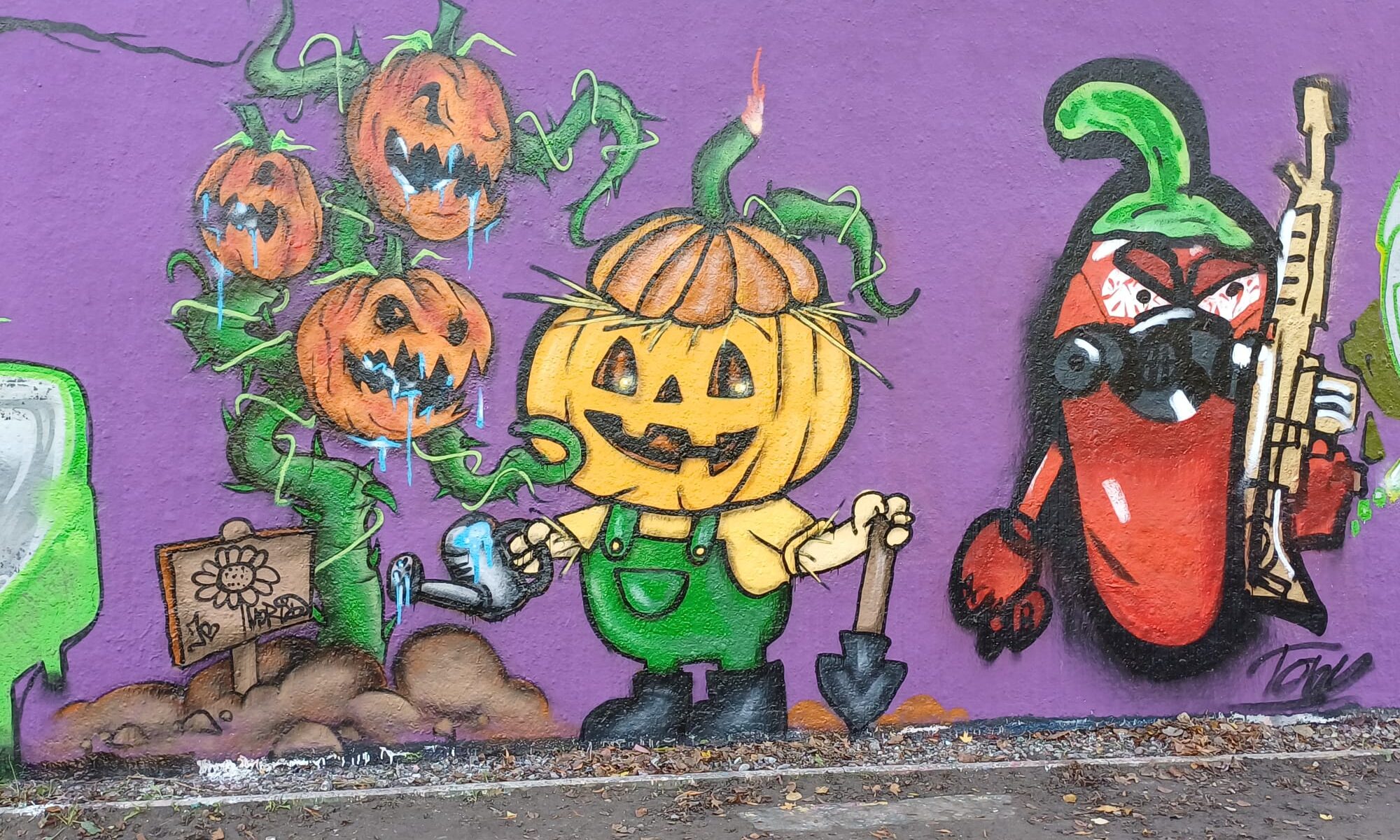 The creepy funny pumpkin gardener with his plants was created jointly by MORID and JEY, and the chili pepper with machine gun on the right is from TOWY