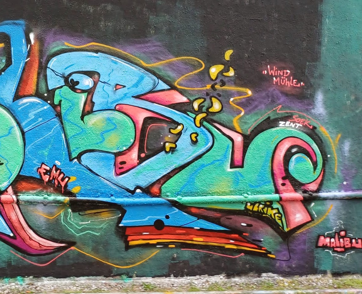 The artwork on the left is from SOEK and the graffiti on the right was made by OLAF OBACHT aka GLURAK