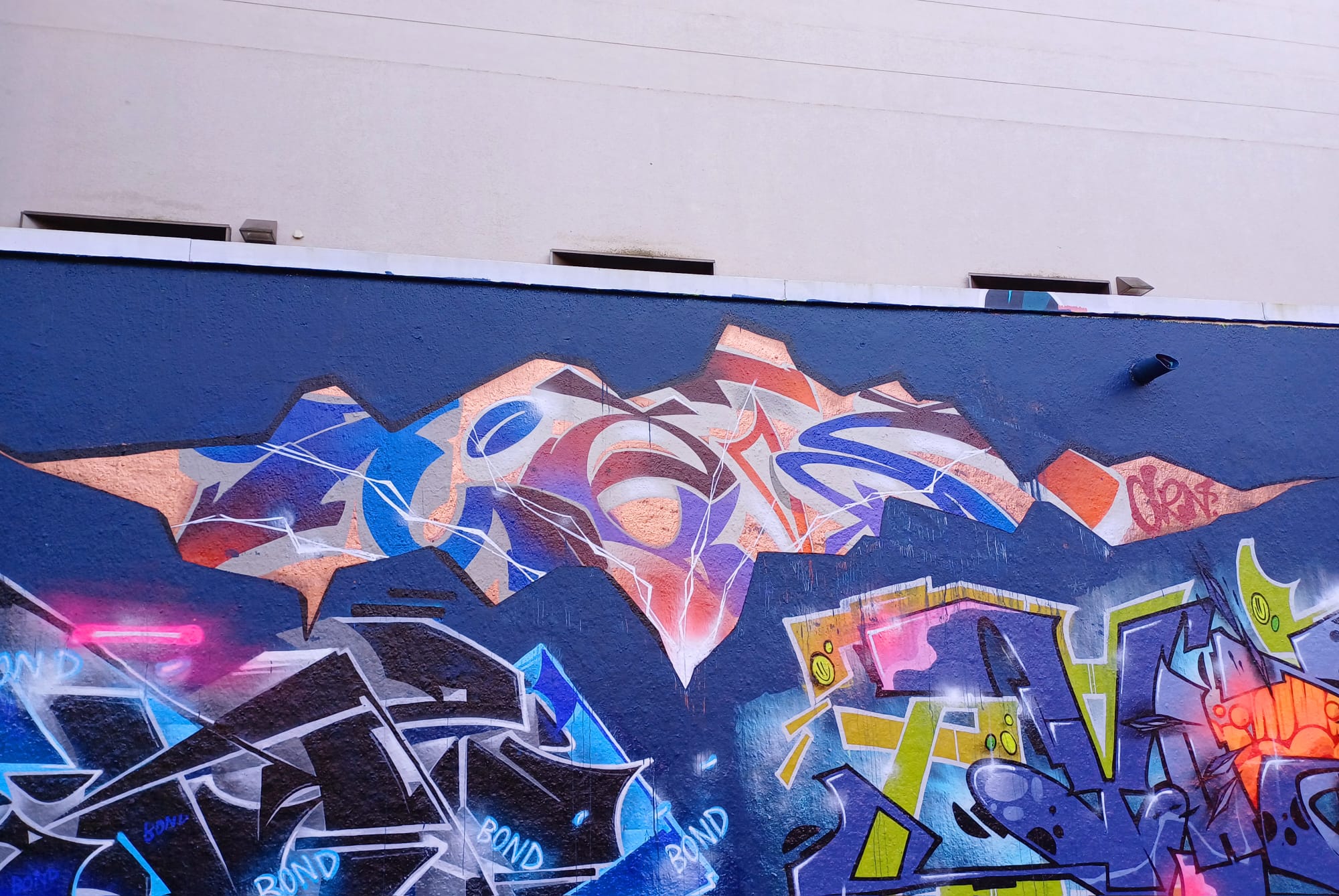 This great collaboration wall was made during the birthday session for BOND. The participating artists on the long wall from left to right are RAITZ, METS, JAZZ, STEN 9540, BOND, MOSHA, TANK, MOKOE and RAMBO. At the wall around the corner are graffiti by CHUK, ARGH and KIMS. Happy Birthday BOND!