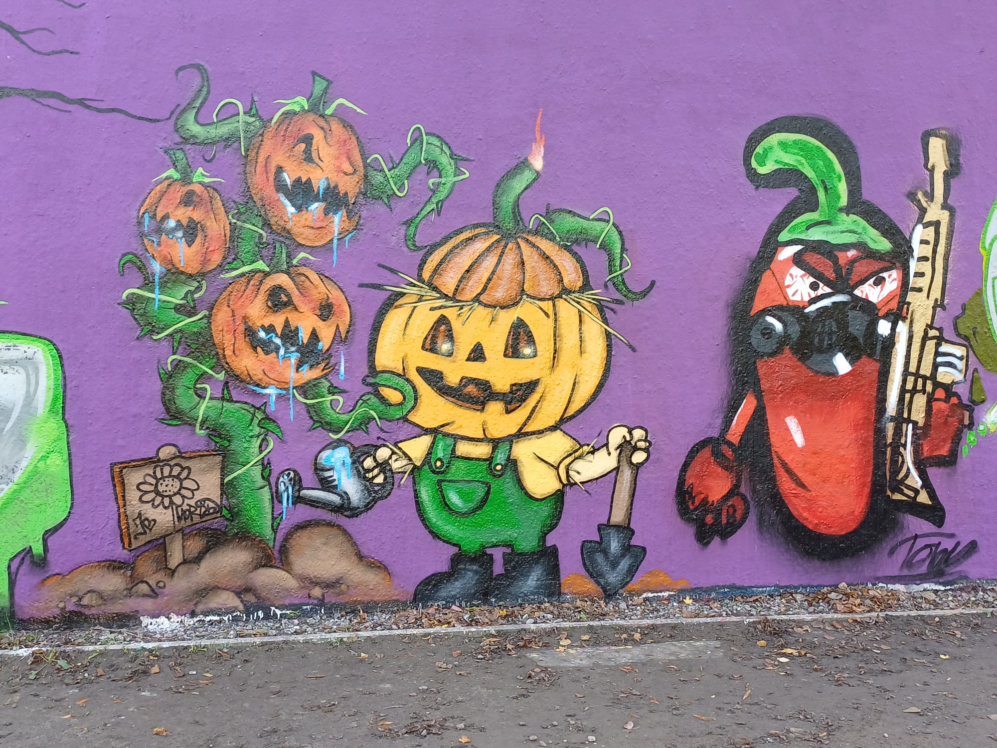 The creepy funny pumpkin gardener with his plants was created jointly by MORID and JEY, and the chili pepper with machine gun is from TOWY