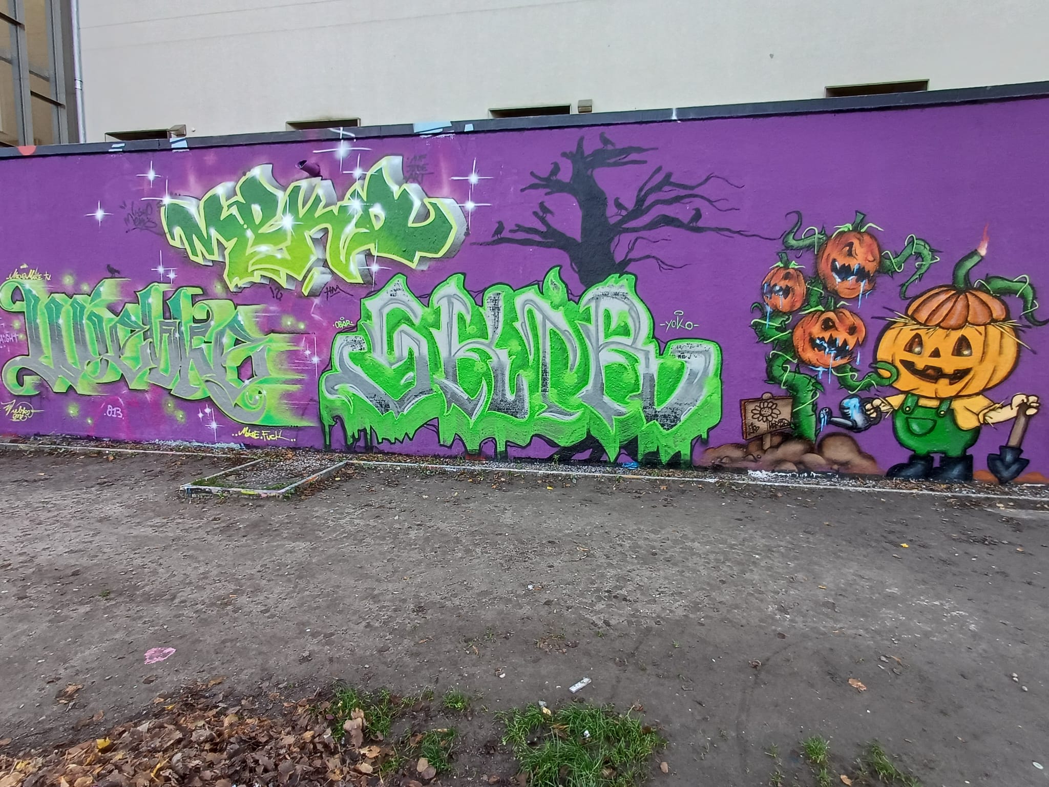 This great Halloween Wall was created by members of the HM CREW aka HIGH MIGHT and the AJA CREW aka AUFJEDEART. The graffiti and characters from left to right were made by HIM, WIEBKE, MEKO, SKIR, MORID, JEY, TOWY, HAEM, SMILE and FEZAR