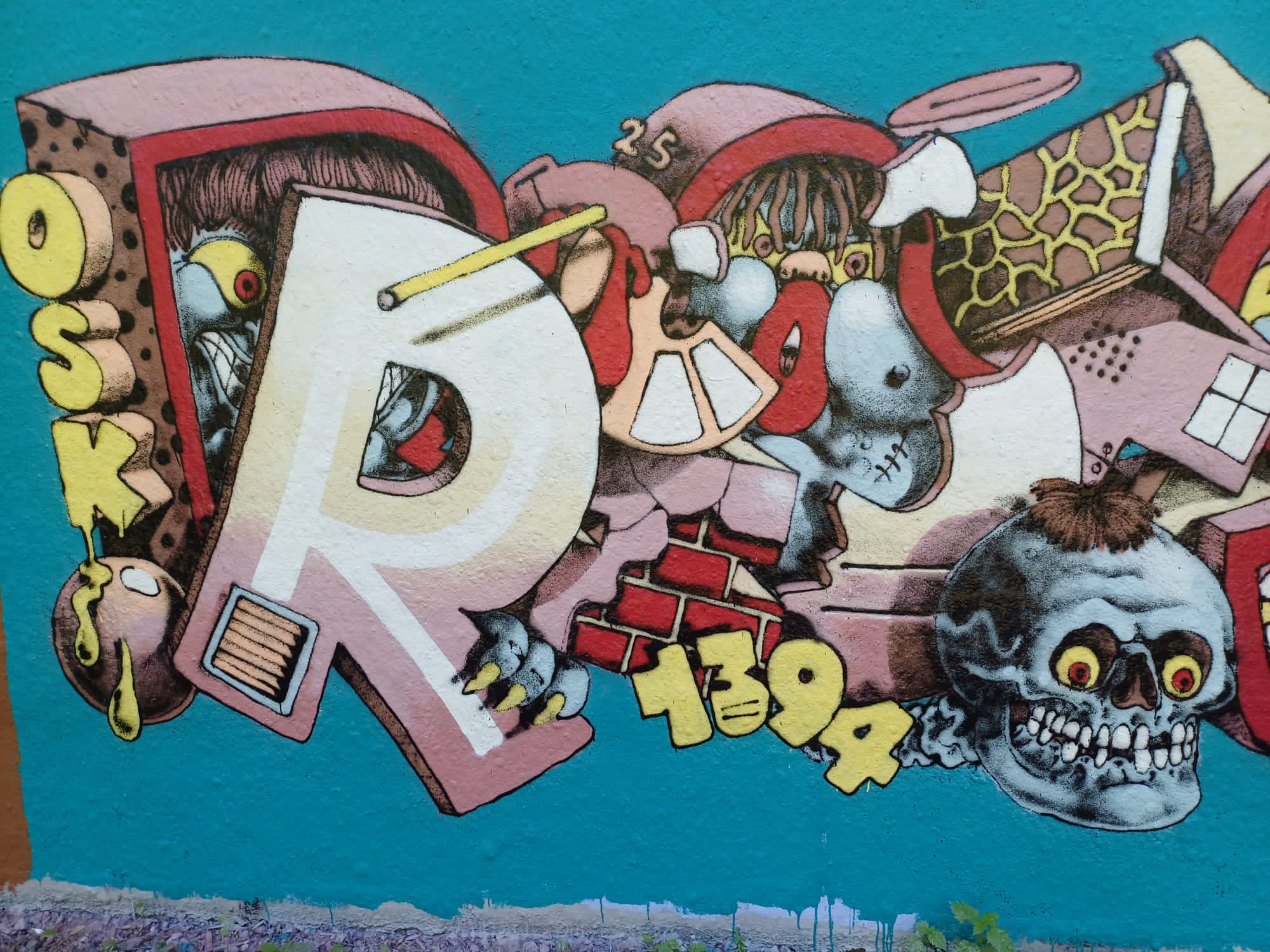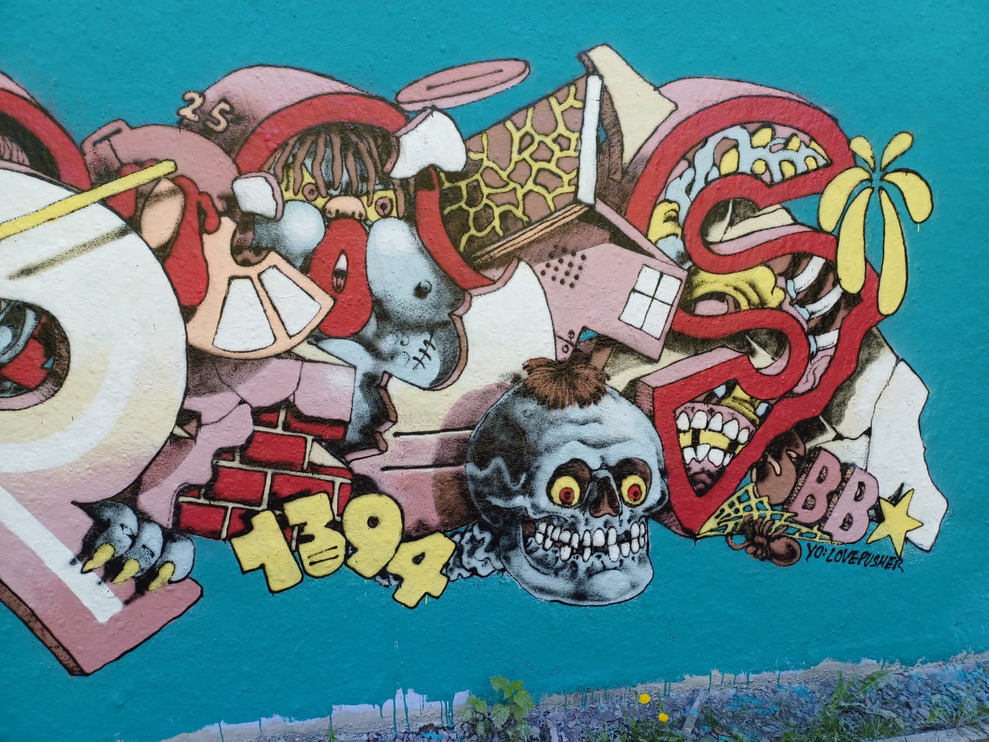 The artworks on this wall were made for the birthday of the artist SUPPE. The creators from left to right are RIOT 1394, DHOS 218, DANK, SUPPE, TADEL, ROY ROBOTICS and GLURAK.