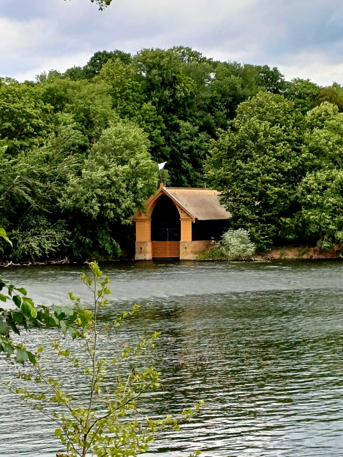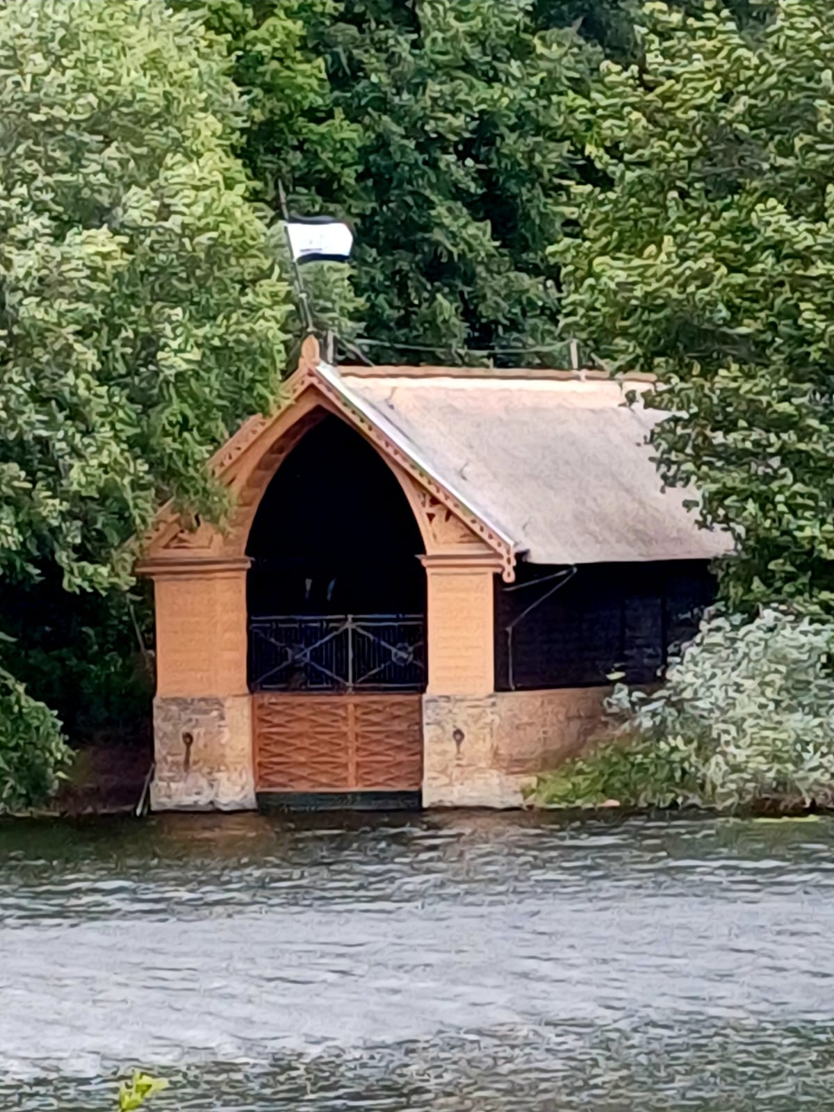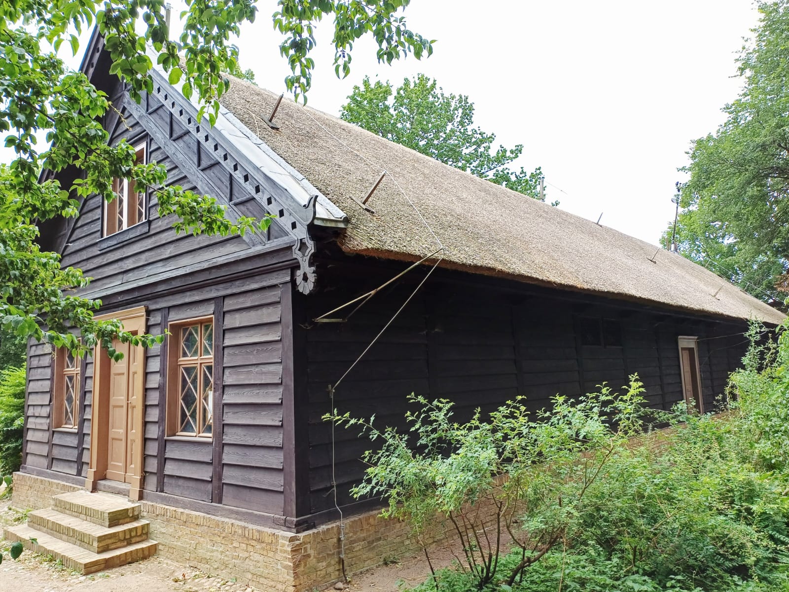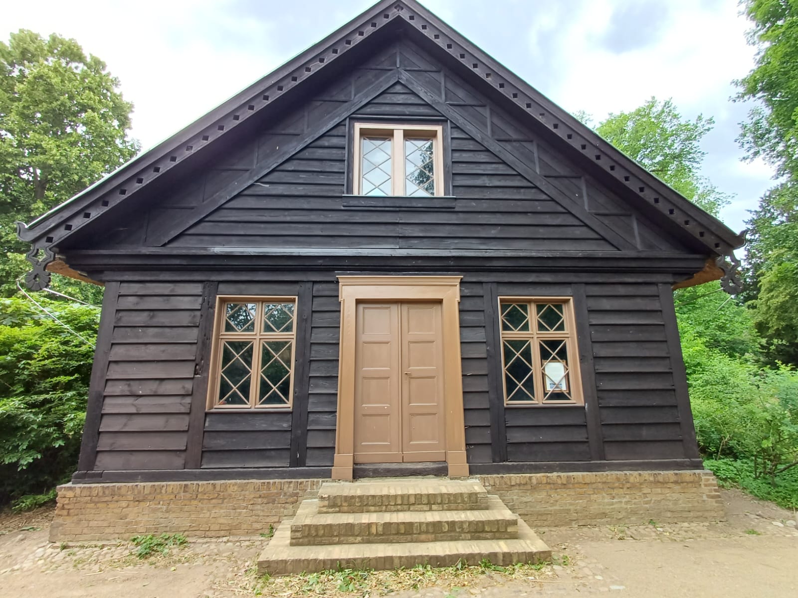 Such a prestigious, three-masted frigate reconstruction on a smaller scale of 1:3 was in need of suitable winter quarters. For this purpose, a boathouse was built at the south bank of Peacock Island according to designs by the court building supervisor ALBERT DIETRICH SCHADOW. The „Royal Louise“ was already able to move i during the winter season 1832/33. This hall building is a wood-boarded, half-timbered construction with a high, thatched, trussed roof that rises above the brickwork of the harbor basin. Particularly striking is the gable facing the water to the southwest, with its large entry gate framed with elaborate carving.