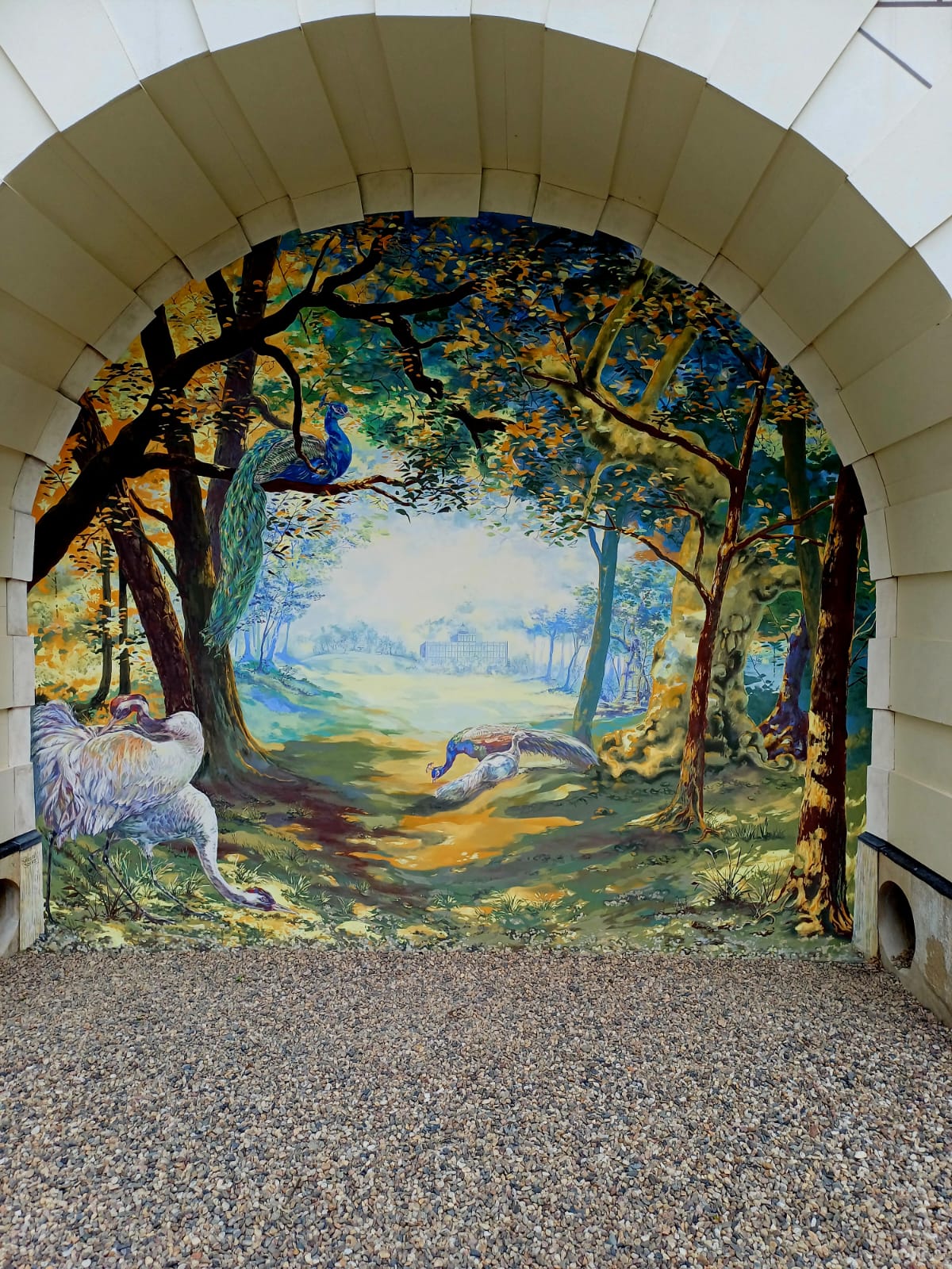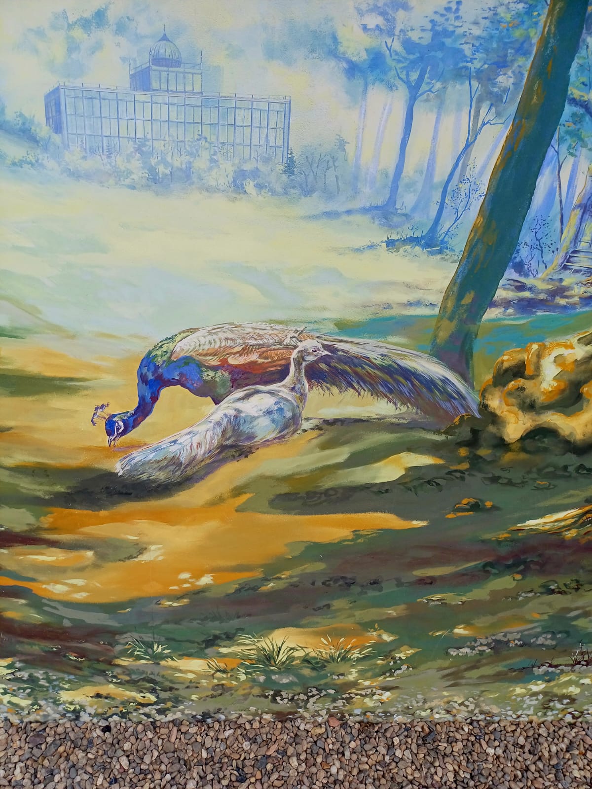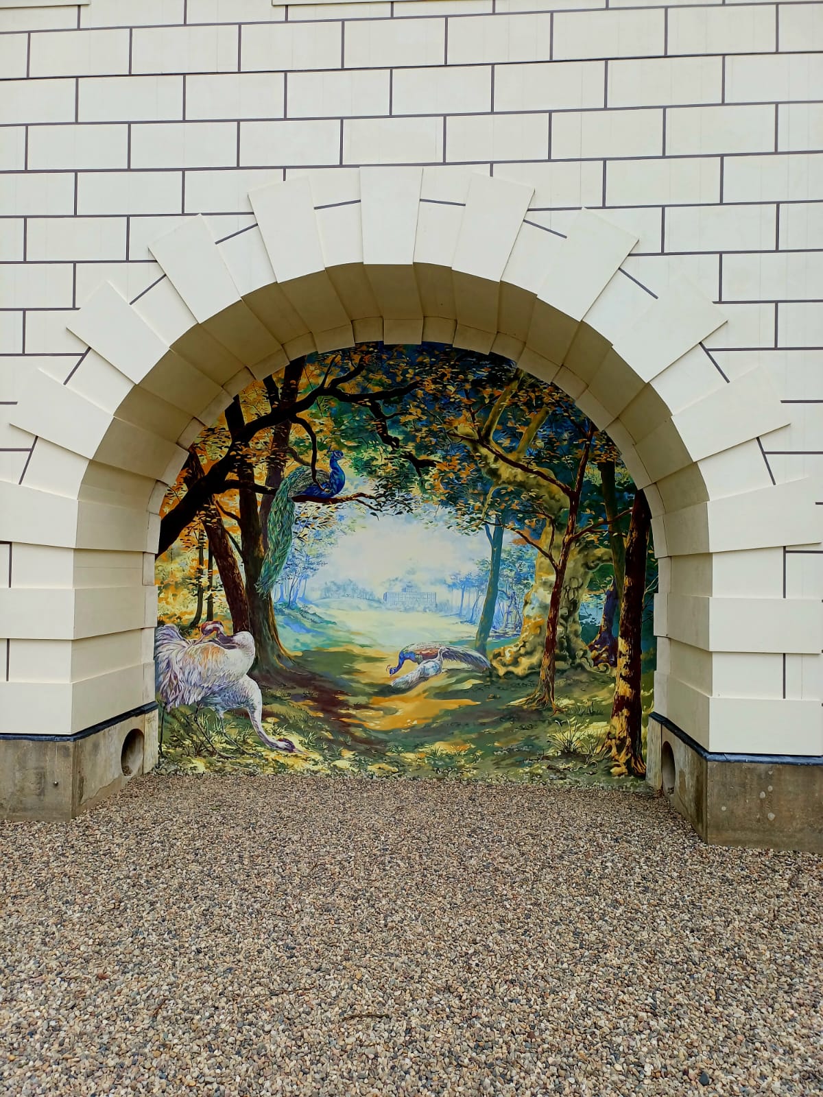 The artist duo VIDEO.SCKRE about their artwork: After an intensive research and preparation phase, we were able to start designing the archway at Pfaueninsel Castle at the end of April 2025. After our design won the competition last year, we were all the more excited about the final design. Like the previous designs, the archway was to offer a view into a fictional landscape. We were particularly inspired by Karl Blechen’s “Forest Landscape in Spandau.” Our idea was for the viewer to look out from a late summer forest onto a clearing. The central axis of view is the island’s former palm house and a feeding shelter, which also no longer exists. While peacocks inhabit the island today, there used to be other species as well, including cranes. The pair of cranes serves as an introductory element to the landscape for the viewer. In order to achieve the most homogeneous coloration and long-lasting UV resistance possible, we opted for mineral paints from Keim. Painting on Peacock Island was a valuable and very special experience for us. The atmosphere of the island, its animal inhabitants, and the changing light conditions have left a lasting impression on us and our mural painting.  –  VIDEO.SCKRE