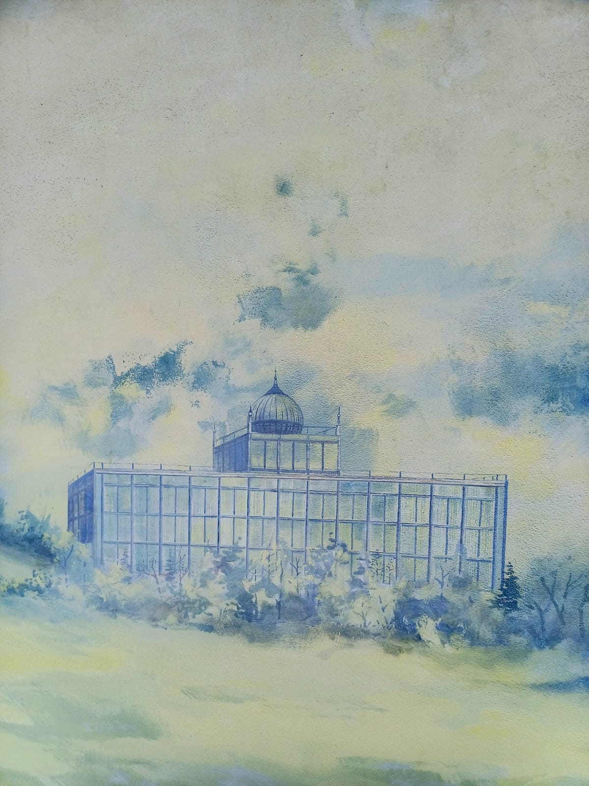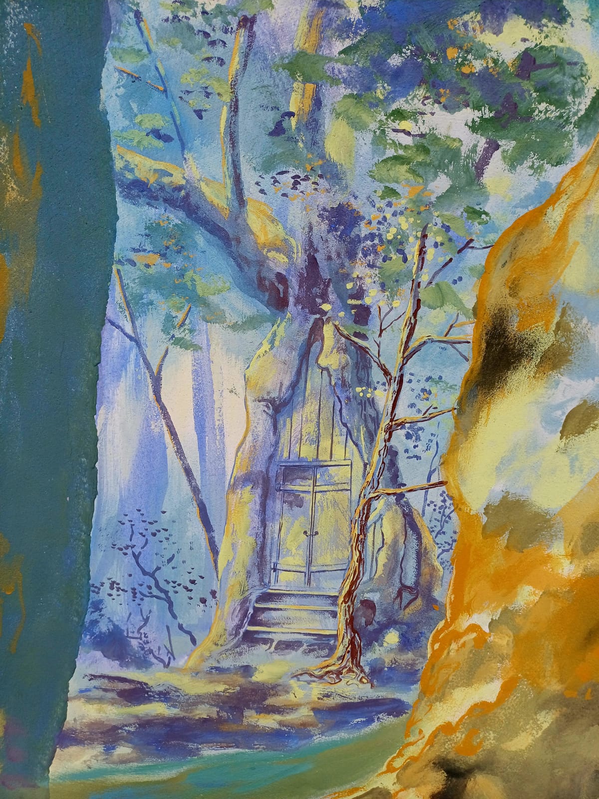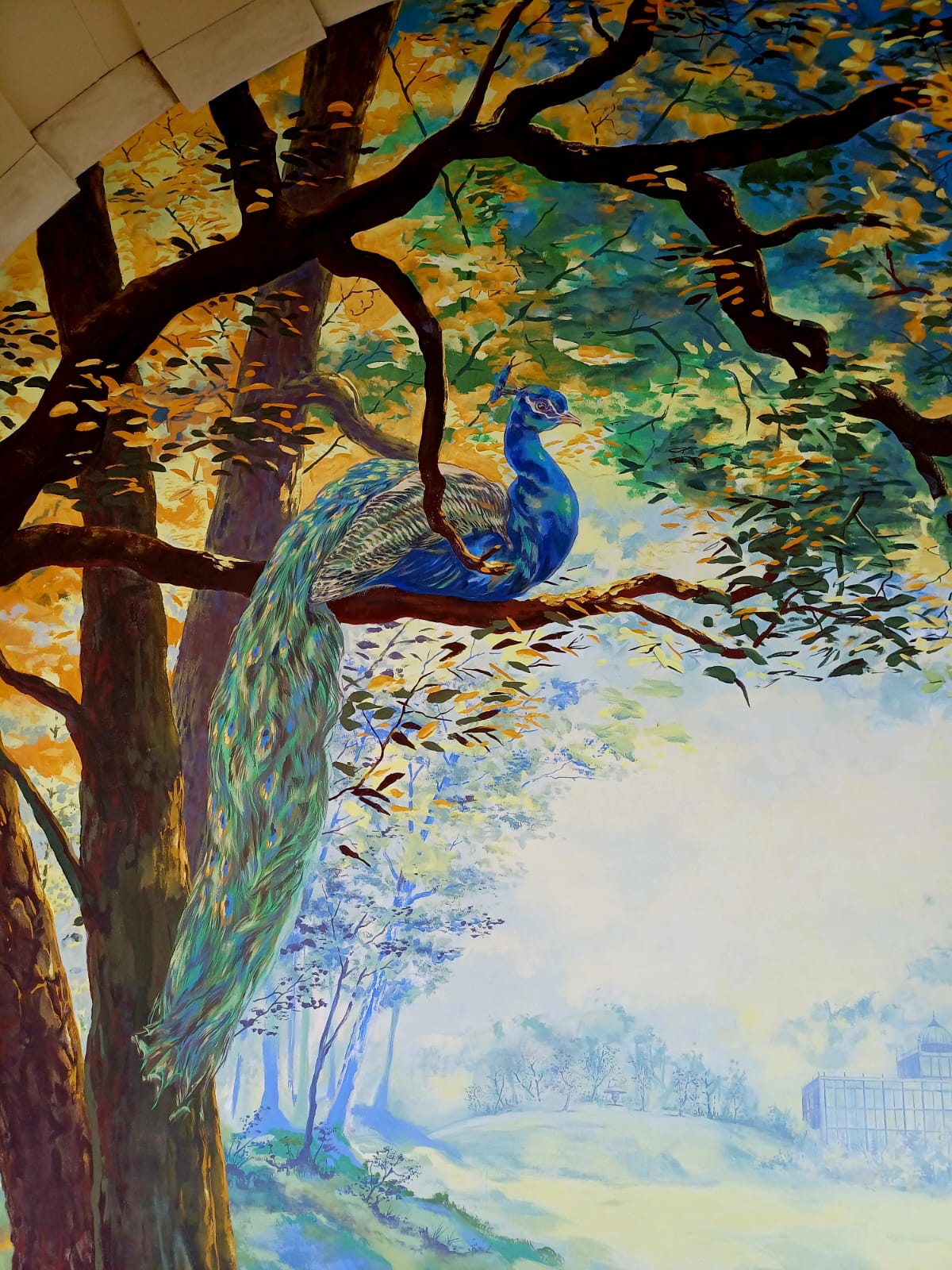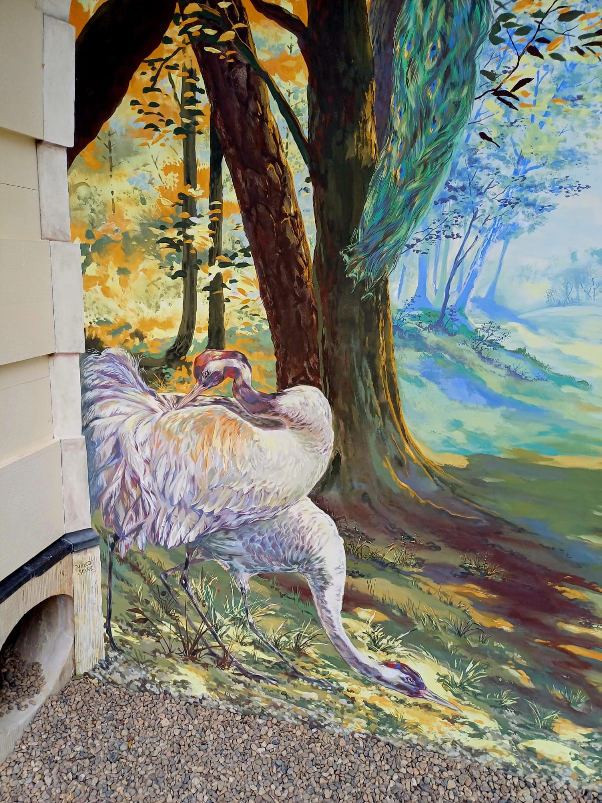 The artist duo VIDEO.SCKRE about their artwork: After an intensive research and preparation phase, we were able to start designing the archway at Pfaueninsel Castle at the end of April 2025. After our design won the competition last year, we were all the more excited about the final design. Like the previous designs, the archway was to offer a view into a fictional landscape. We were particularly inspired by Karl Blechen’s “Forest Landscape in Spandau.” Our idea was for the viewer to look out from a late summer forest onto a clearing. The central axis of view is the island’s former palm house and a feeding shelter, which also no longer exists. While peacocks inhabit the island today, there used to be other species as well, including cranes. The pair of cranes serves as an introductory element to the landscape for the viewer. In order to achieve the most homogeneous coloration and long-lasting UV resistance possible, we opted for mineral paints from Keim. Painting on Peacock Island was a valuable and very special experience for us. The atmosphere of the island, its animal inhabitants, and the changing light conditions have left a lasting impression on us and our mural painting.  –  VIDEO.SCKRE