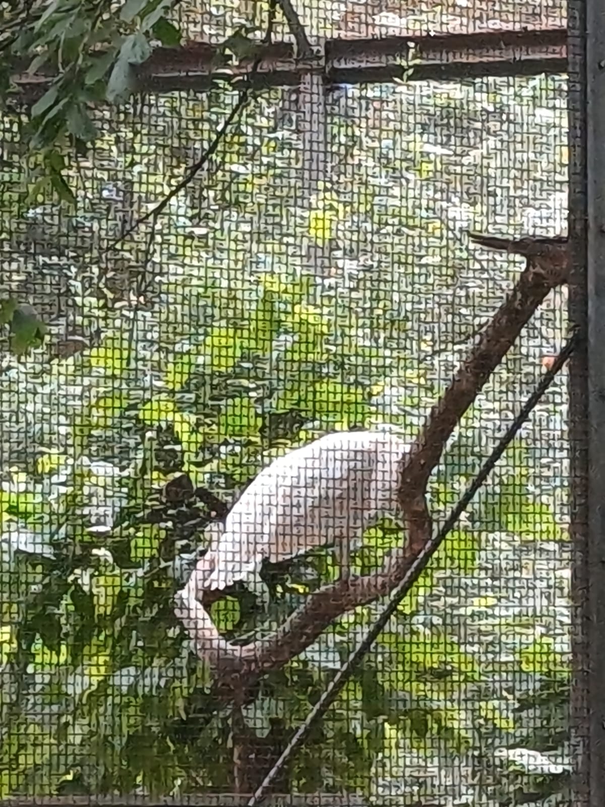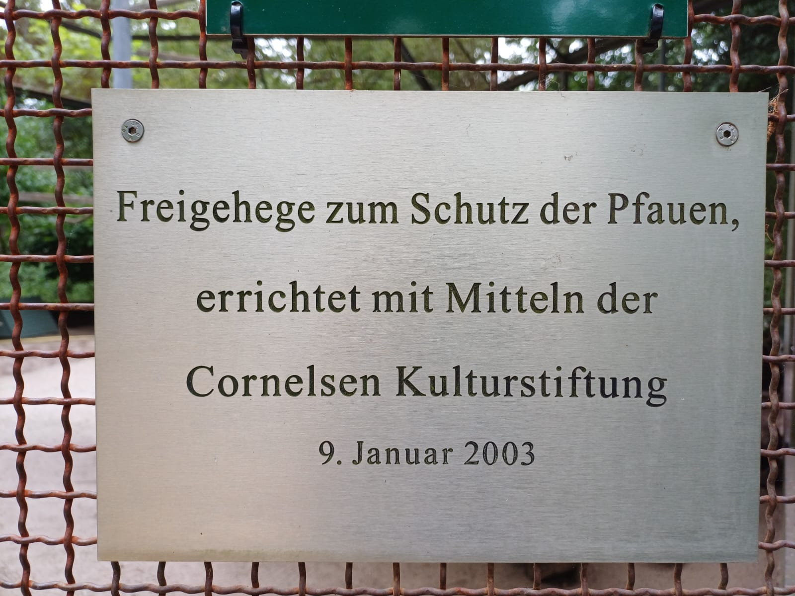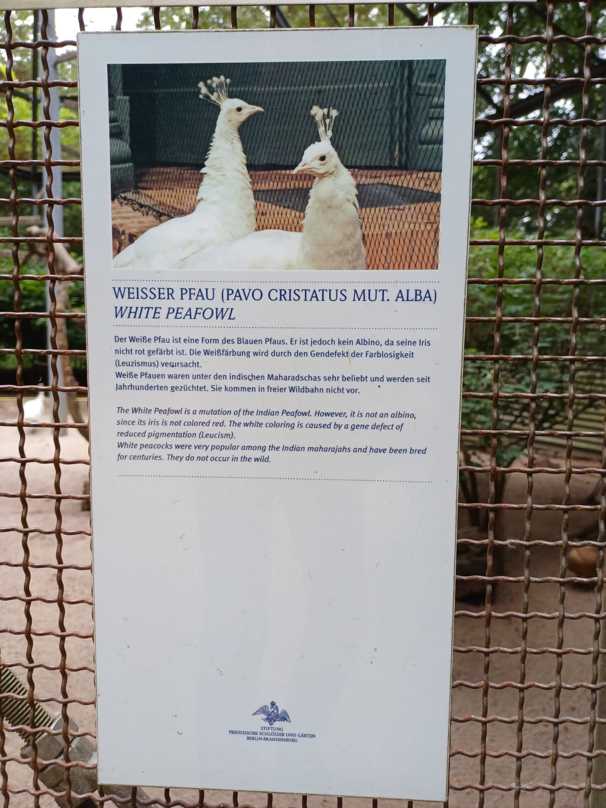 Outdoor enclosure for the protection of peacocks, built with funds from the Cornelsen Cultural Foundation on 9 January 2003. The White Peafowl is a mutation of the Indian Peafowl. However, it is not an albino, since its iris is not colored red. The white coloring caused by a gene defect of reduced pigmentation (Leucism). White peacocks were very popular among the Indian maharajahs and have been bred for centuries. They do not occur in the wild.