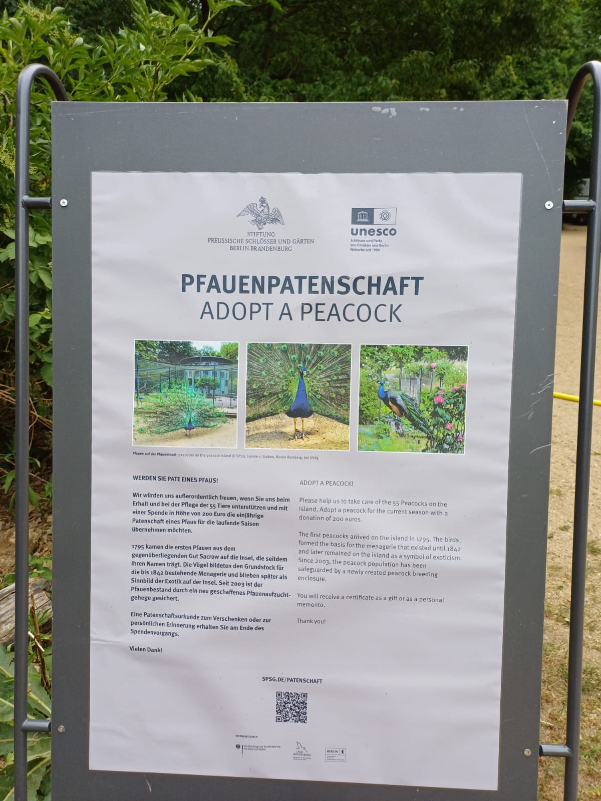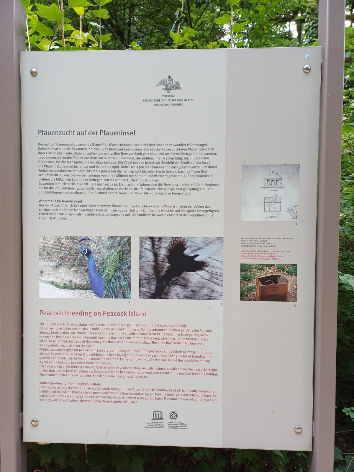 Please help us to take care of the 55 Peacocks on the Island. Adopt a peacock for the current season with a donation of 200 euros. The first peacocks arrived on the island in 1795. The birds formed the basis for the menagerie that existed until 1842 and later remained on the island as a symbol of exoticism. Since 2003, the peacock population has been safeguarded by a newly created peacock breeding enclosure. You will receive a certificate as a gift or as a personal memento. You can get all information via spsg.de/unterstuetzen-foerdern/patenschaften.