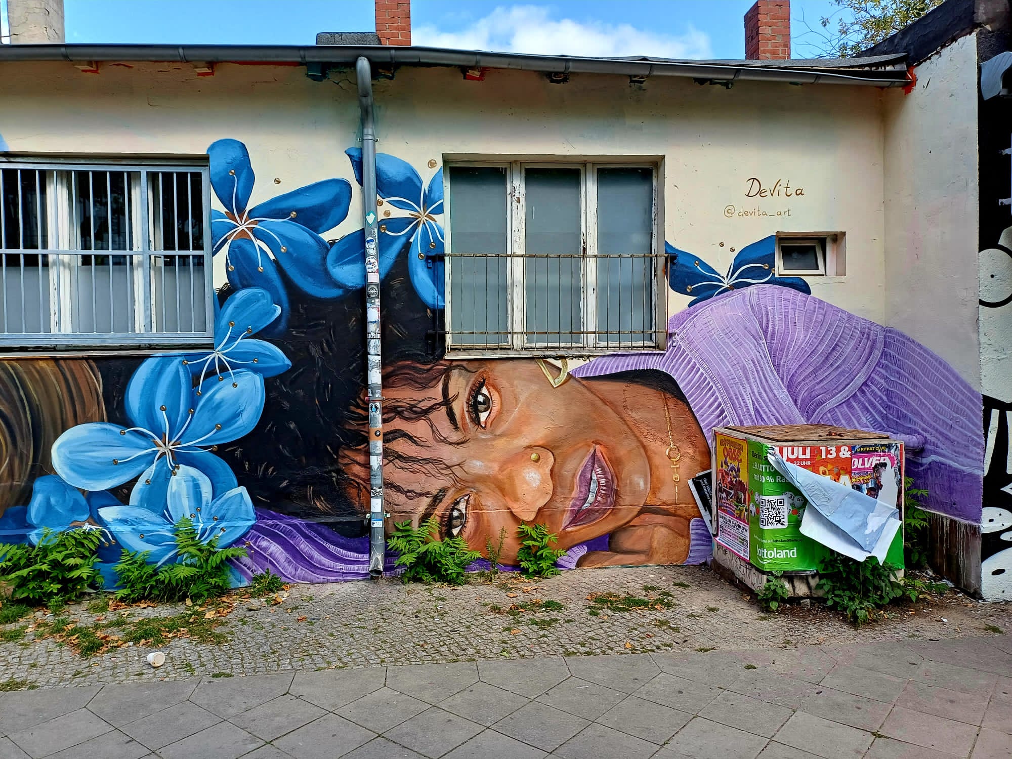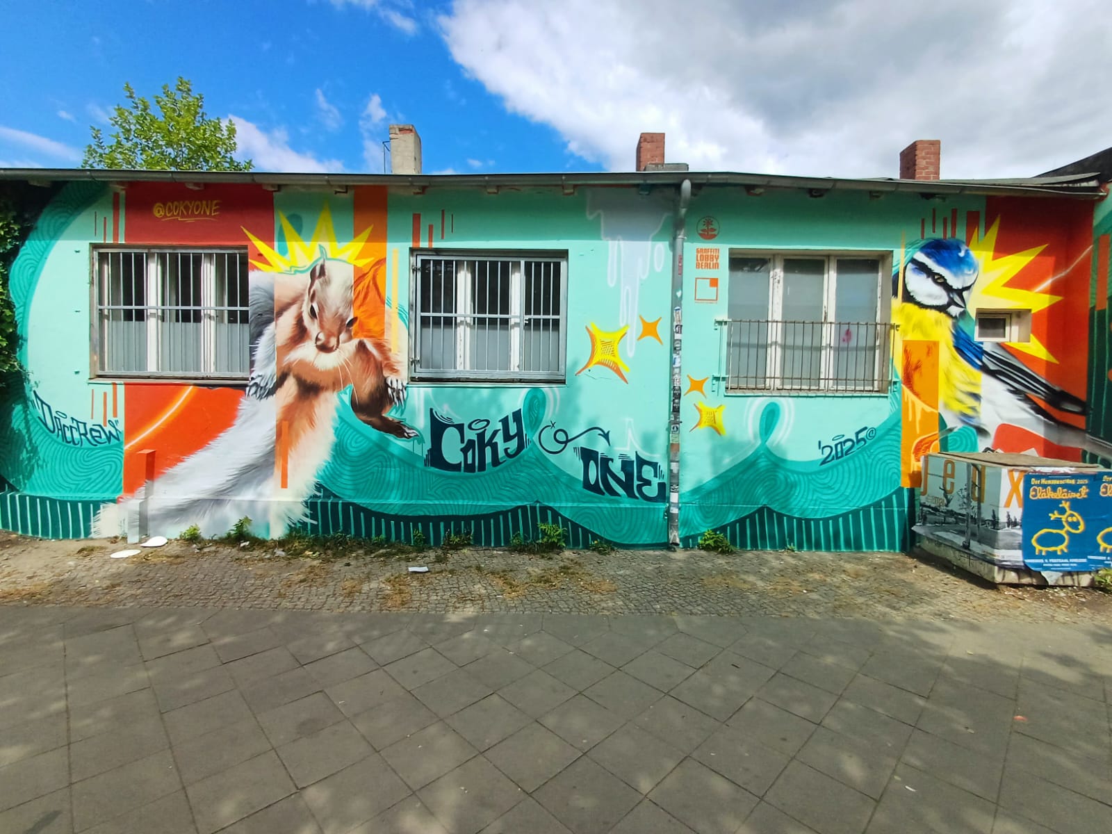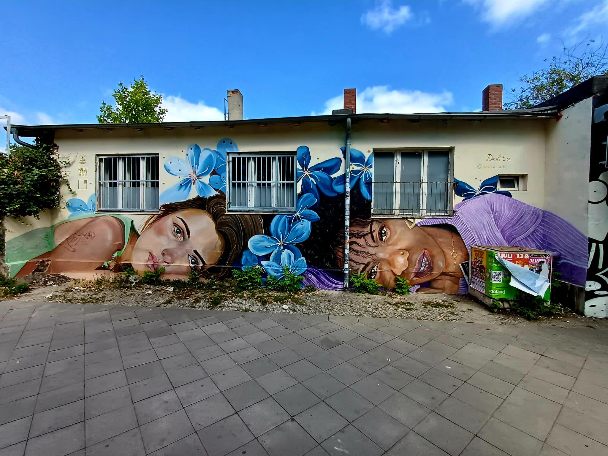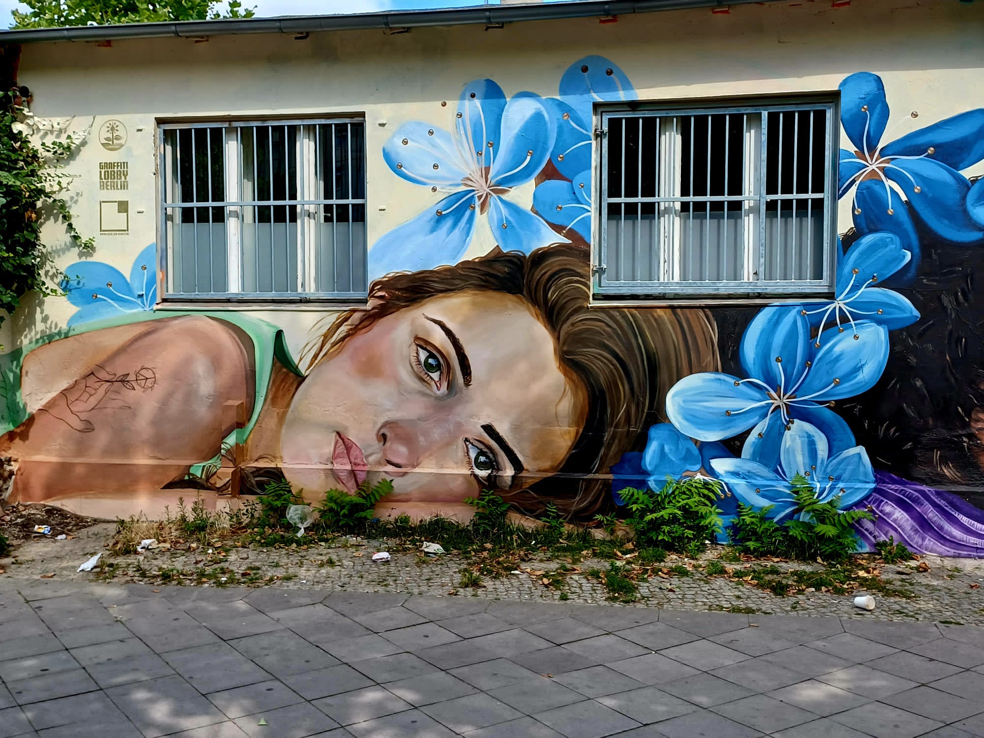 On this small building right next to the Mauerpark, you will regularly find fantastic works of art by changing great artists. We divided the small buildings into 3 pages and each page shows a history of that part of the wall. We have the left area with the Blumenwunder Project, the middle part and the right area. In the following you can see the artworks on the left part of the building which is also the club house of the association Freunde des Mauerparks. On the front are works from NEWEN VILU and TRANSLARTOR, also an artwork from ALEAVE on the side wall of the building. Those artworks are part of the „Blumenwunder“ and were supported and currated by LIEBE ZUR KUNST, a cool art project by EMILY STRANGE. She also contributed additional photos from the making of. As well big thanks to JURIJ PADERIN from the GRAFFITI LOBBY BERLIN who connected the artists and made this colorful adventure possible.