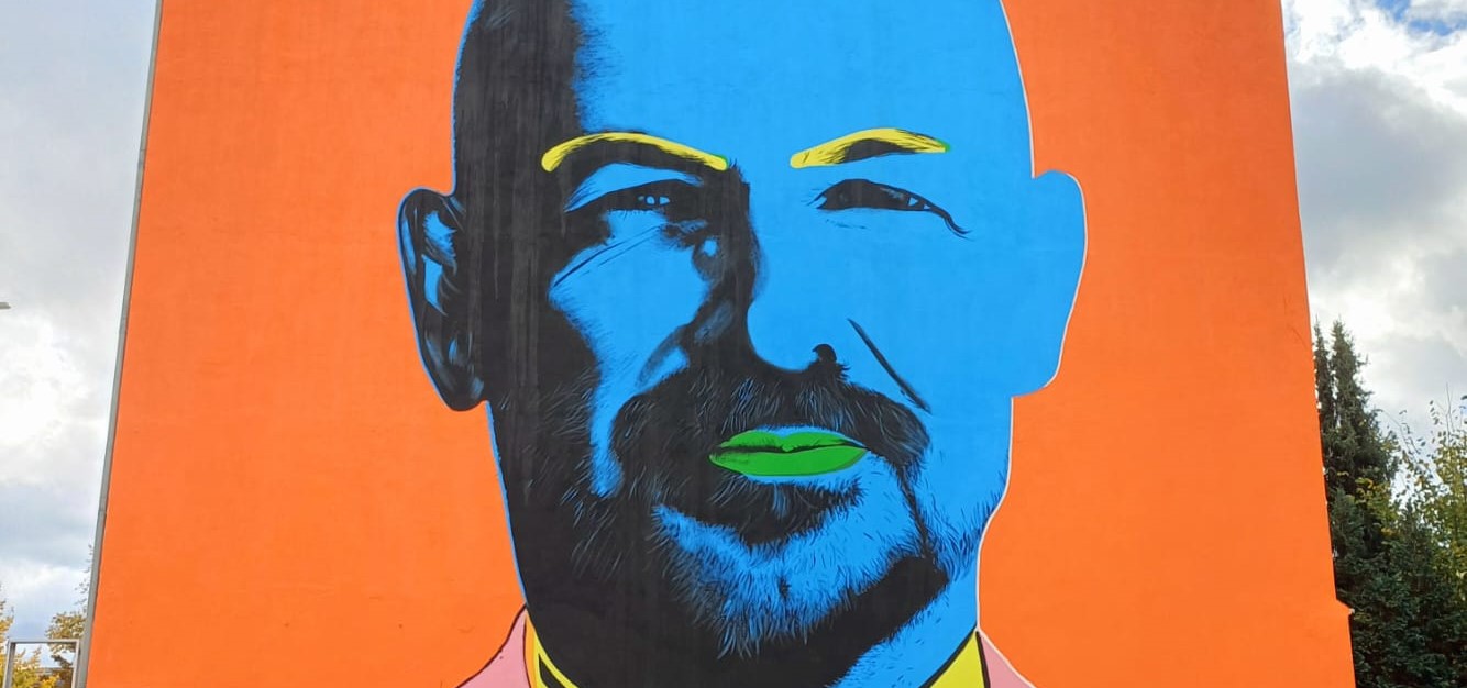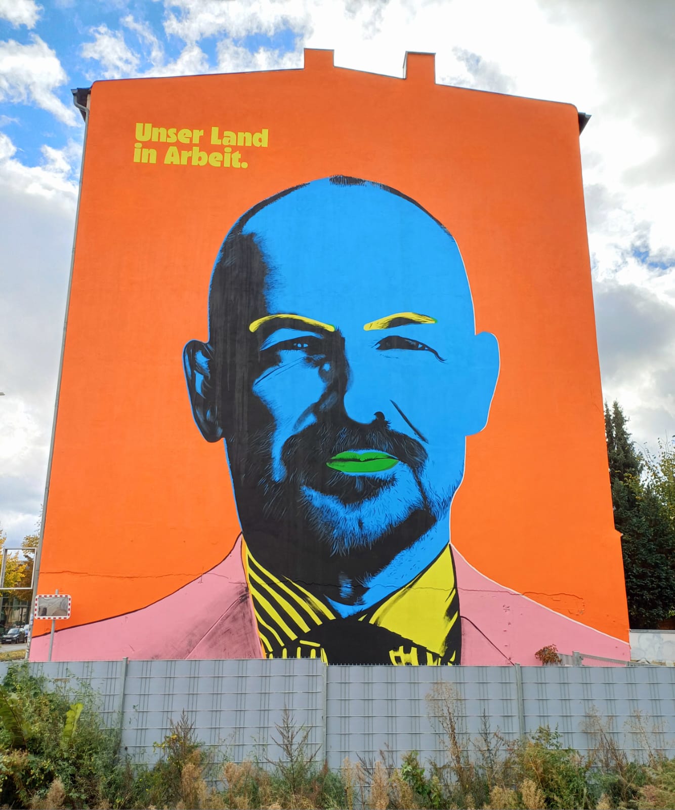 This mural was commissioned by the Federal Ministry of Labor and Social Affairs and is part of the campaign „Unser Land in Arbeit“, or in English „Our Country at Work“. The large mural in pop-up style shows the hairdresser Andrè Goerner, who runs the salon at Behren Street 72 in the Adlon Hotel. In the ministry’s project, his work and activities are presented as a prime example of how „work“ can be fun and flourish when you have found your passion and keep on going.