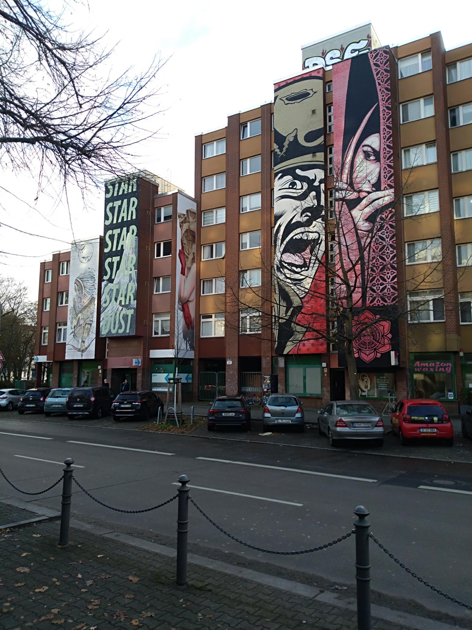 The mural on the left with the the native character is from WORD TO MOTHER, the one on the right with the Star Dust writing is from CYRCLE. Next to that one around the corner there is as well the third mural of the series made by CHRISTIAN BOEHMER.