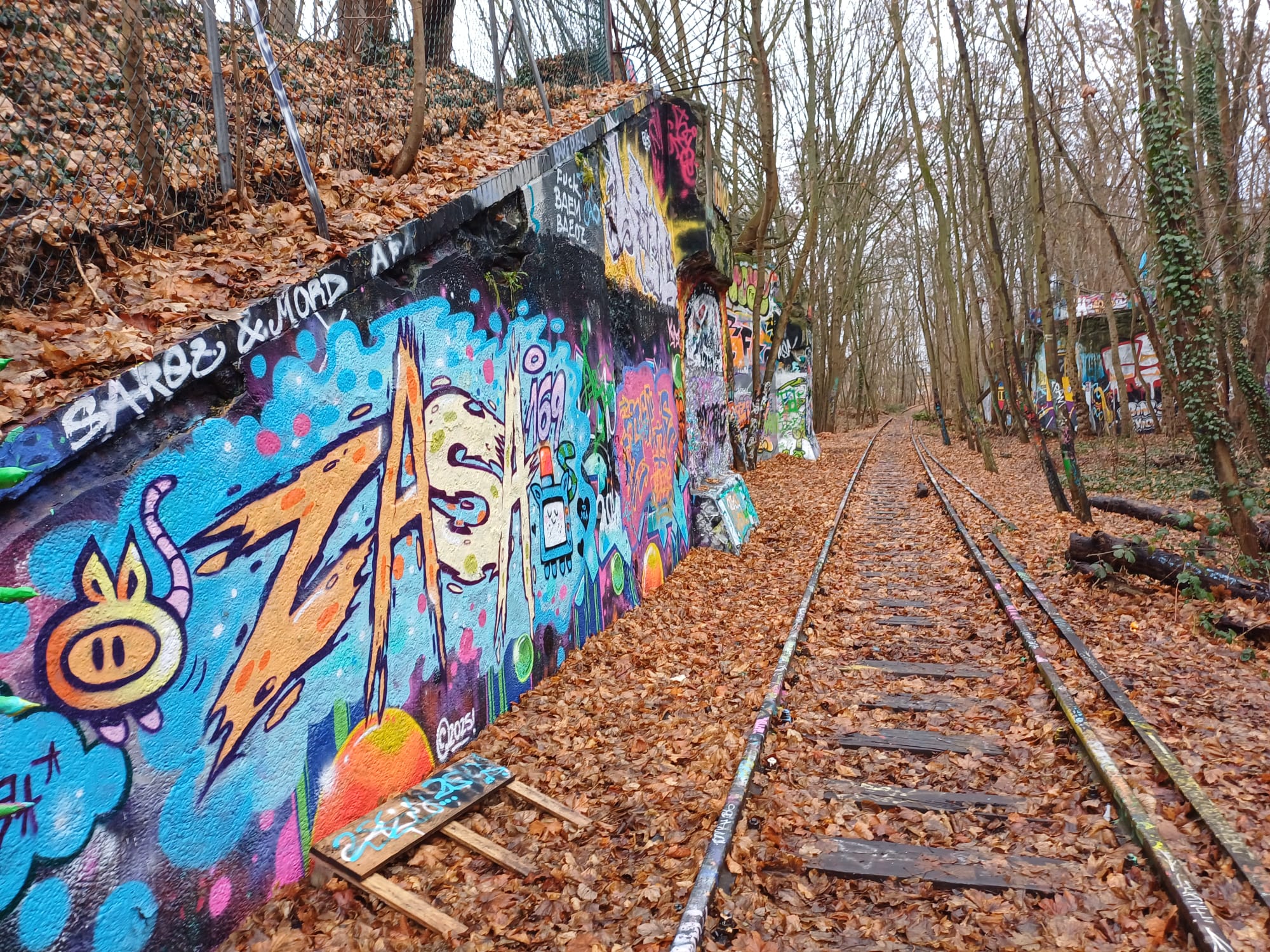 Today I walked from the Zehlendorf S-Bahn station along the Anhaltiner Street parallel to the railway line in the direction of Mexico Platz. Next to the railway line, I found a tunnel under the railway line through the other side. There were many gardens, wild trees and wild growth bush. I also found a certain disused railroad track in the direction of the Zehlendorf S-Bahn station. As well I discovered a distant iron bridge that probably only existed for pedestrians and cyclists. The bridge overpass was demolished. Only the concrete walls were left and served as graffiti surface. This huge overgrown wild tree and bridge area is located between Berlepschstraße 32 and the railway line on the east. On the other side of the railway line it is around Anhaltiner Street number 9.  This spray place is also called the „Canion“. –  Holger Peter