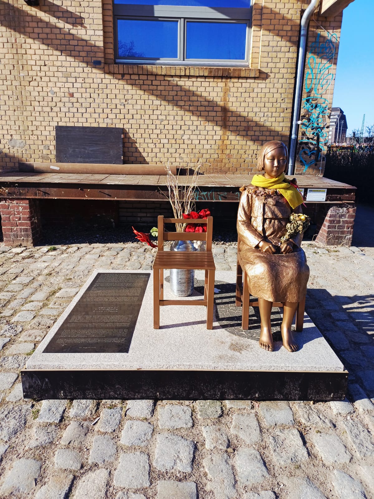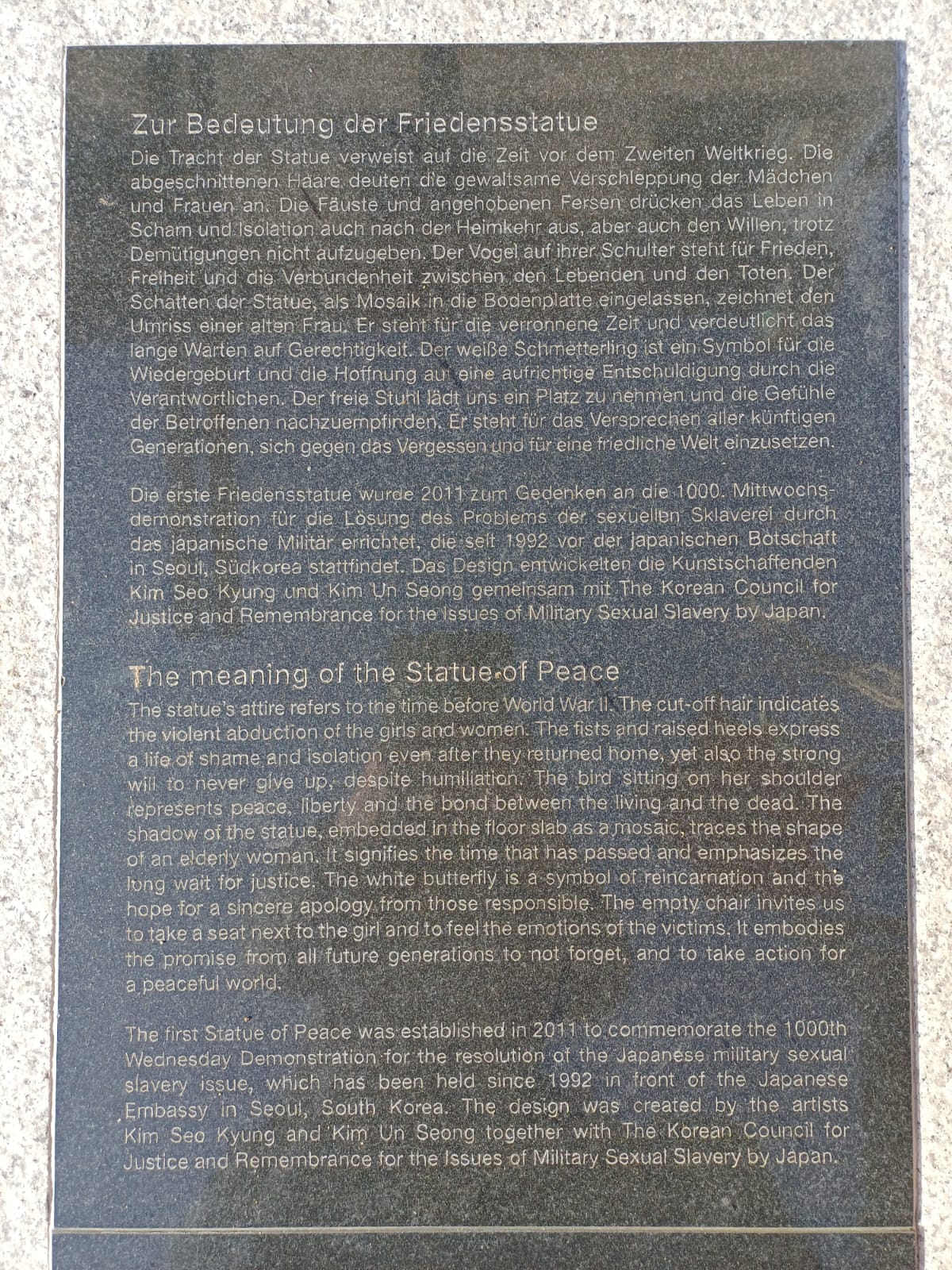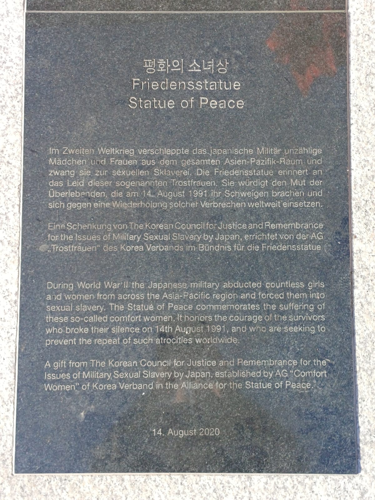 During World War II the Japanese military abducted countless girls and women from across the Asia-Pacific region and forced them into sexual slavery. The Statue of Peace commemorates the suffering of these so-called comfort women. It honors the courage of the survivors who broke their silence on 14th August 1991, and who are seeking to prevent the repeat of such atrocities worldwide. A gift from The Korean Council for Justice and Remembrance for the Issues of Military Sexual Slavery by Japan, established by AG „Comfort Women“ of Korea Verband in the Alliance for the Statue of Peace.  –  14th August 2020