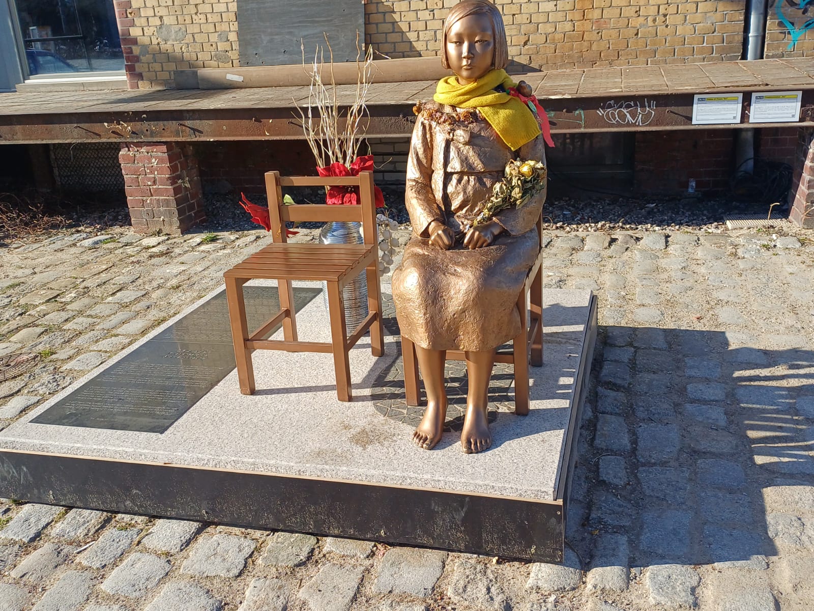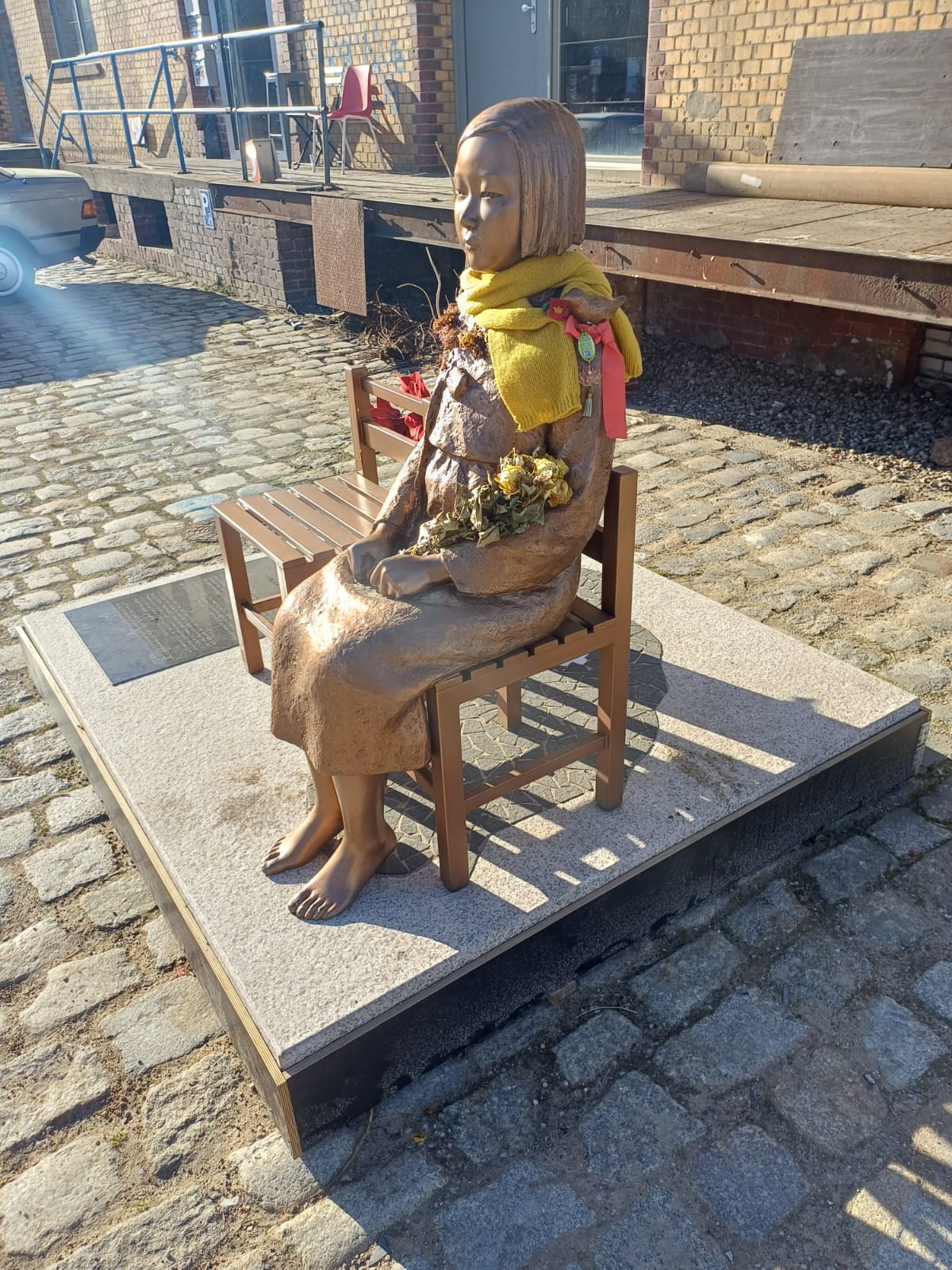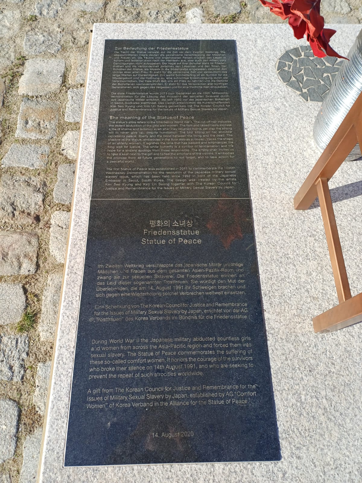 During World War II the Japanese military abducted countless girls and women from across the Asia-Pacific region and forced them into sexual slavery. The Statue of Peace commemorates the suffering of these so-called comfort women. It honors the courage of the survivors who broke their silence on 14th August 1991, and who are seeking to prevent the repeat of such atrocities worldwide. A gift from The Korean Council for Justice and Remembrance for the Issues of Military Sexual Slavery by Japan, established by AG „Comfort Women“ of Korea Verband in the Alliance for the Statue of Peace.  –  14th August 2020