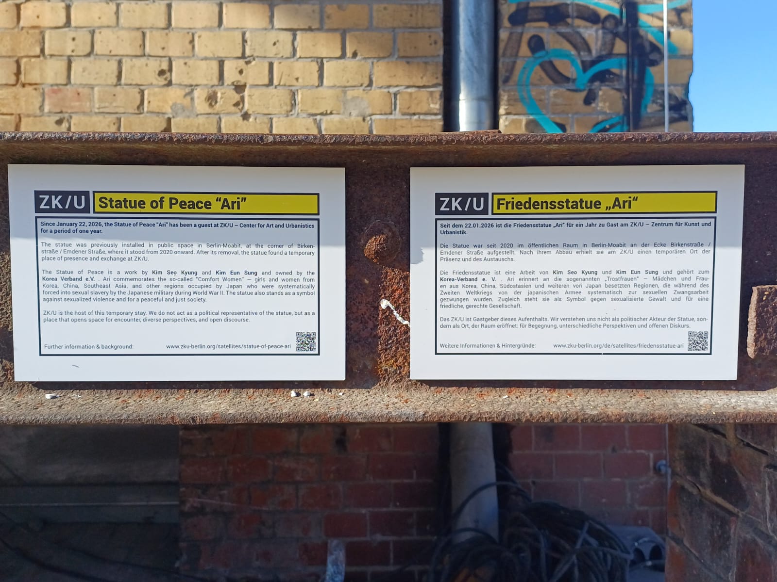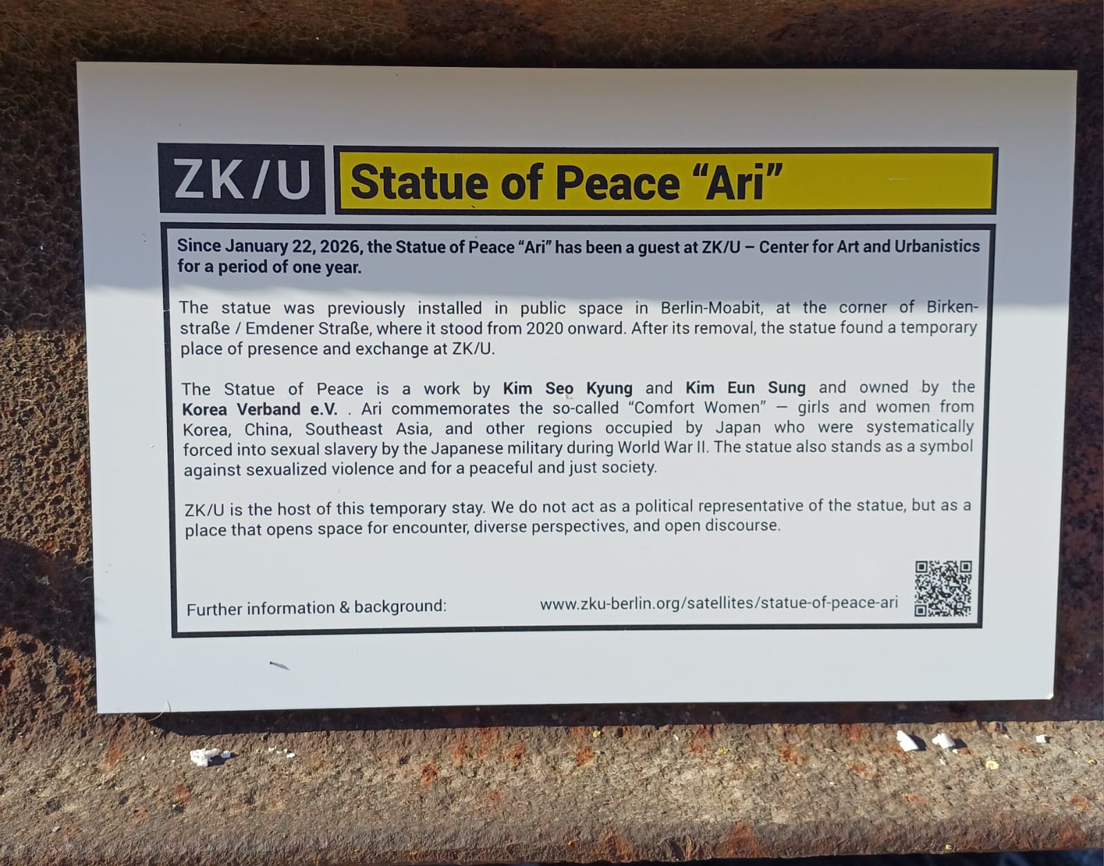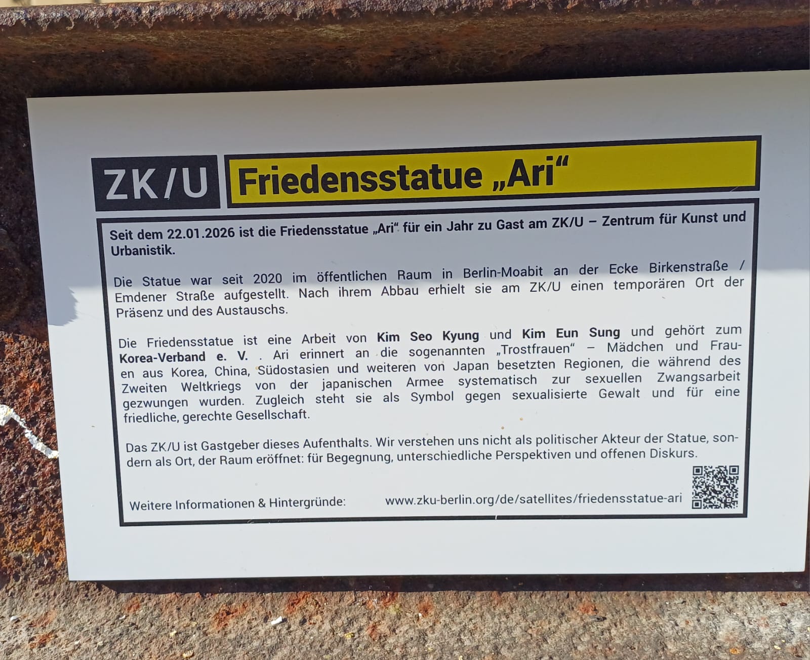 Since 22nd January 2026, the Statue of Peace „Ari“ has been a guest at ZK/U – Center for Art and Urbanistics for a period of one year. The statue was previously installed in public space in Berlin-Moabit, at the corner of Birken- straße / Emdener Straße, where it stood from 2020 onward. After its removal, the statue found a temporary place of presence and exchange at ZK/U. The Statue of Peace is a work by the artist duo and couple KIM SEO KYUNG and KIM EUN SUNG and owned by the KOREA VERBAND.