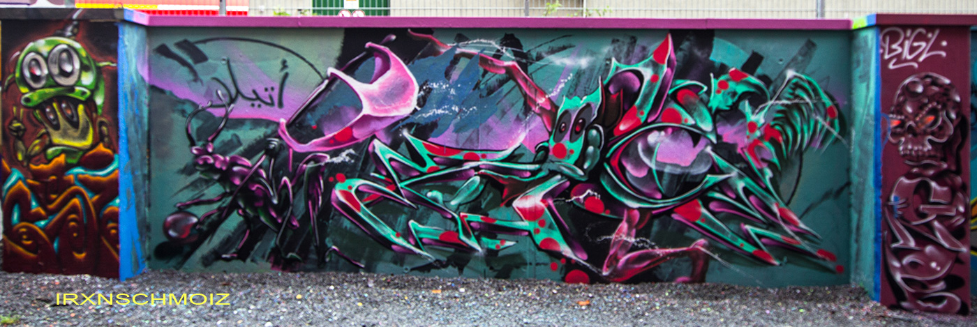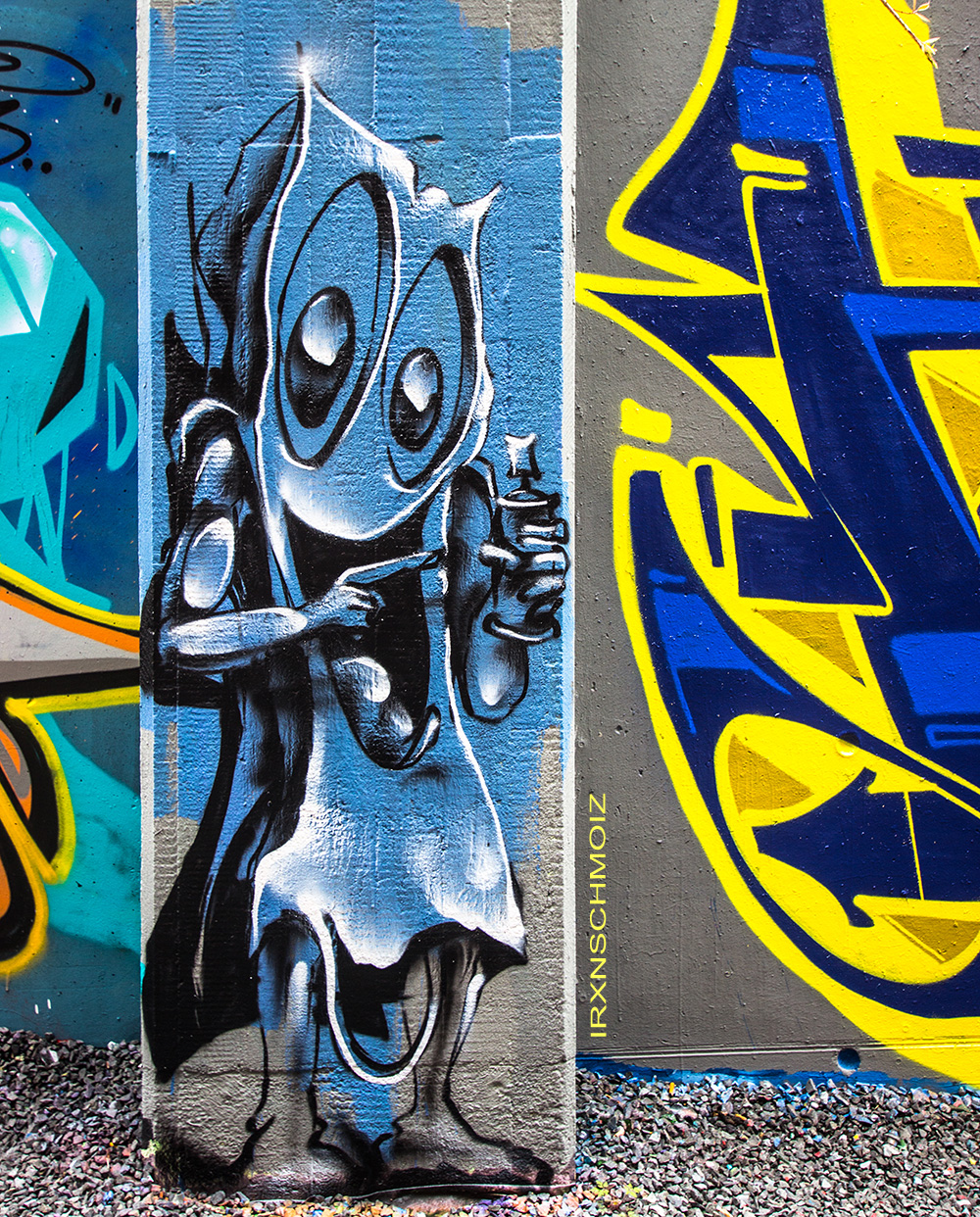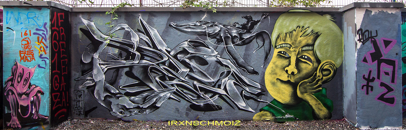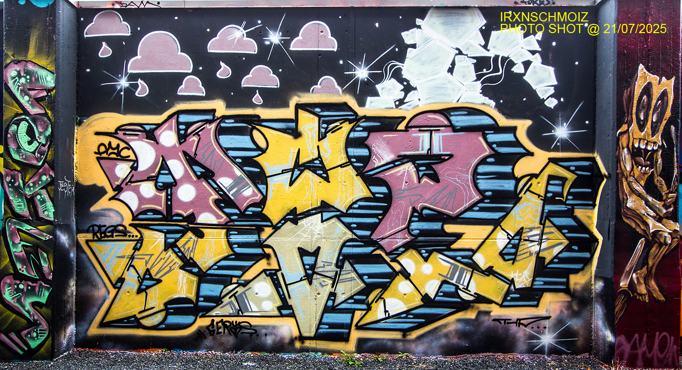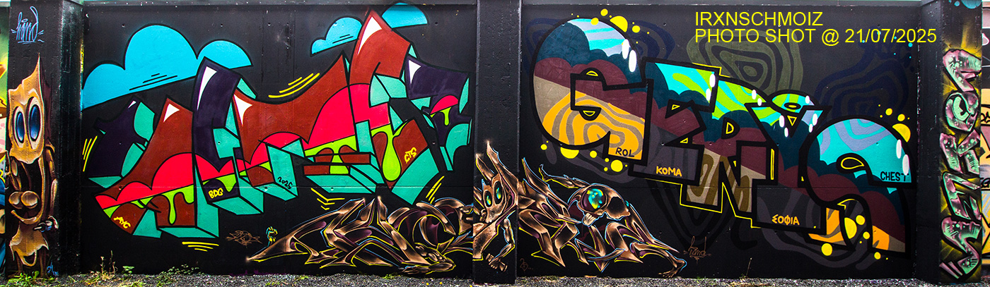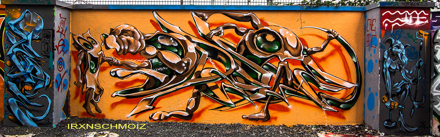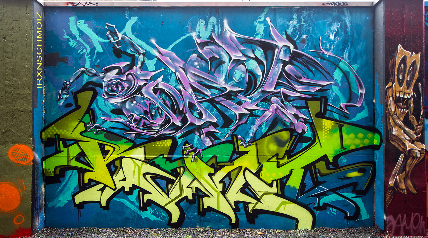 The graffiti on the upper left is from ACME, the graffiti on the upper right was made by GERYS abd the graffiti on the right pillar is from FOKES