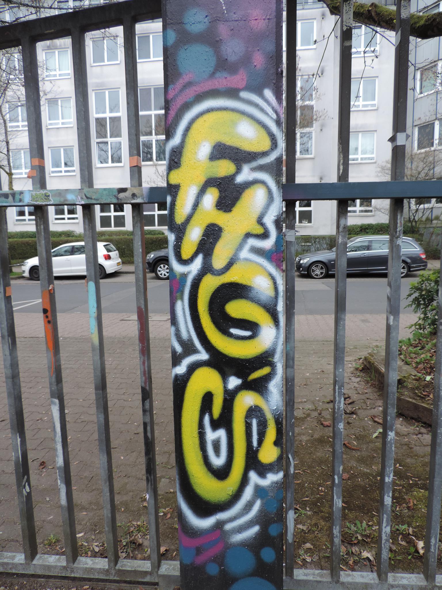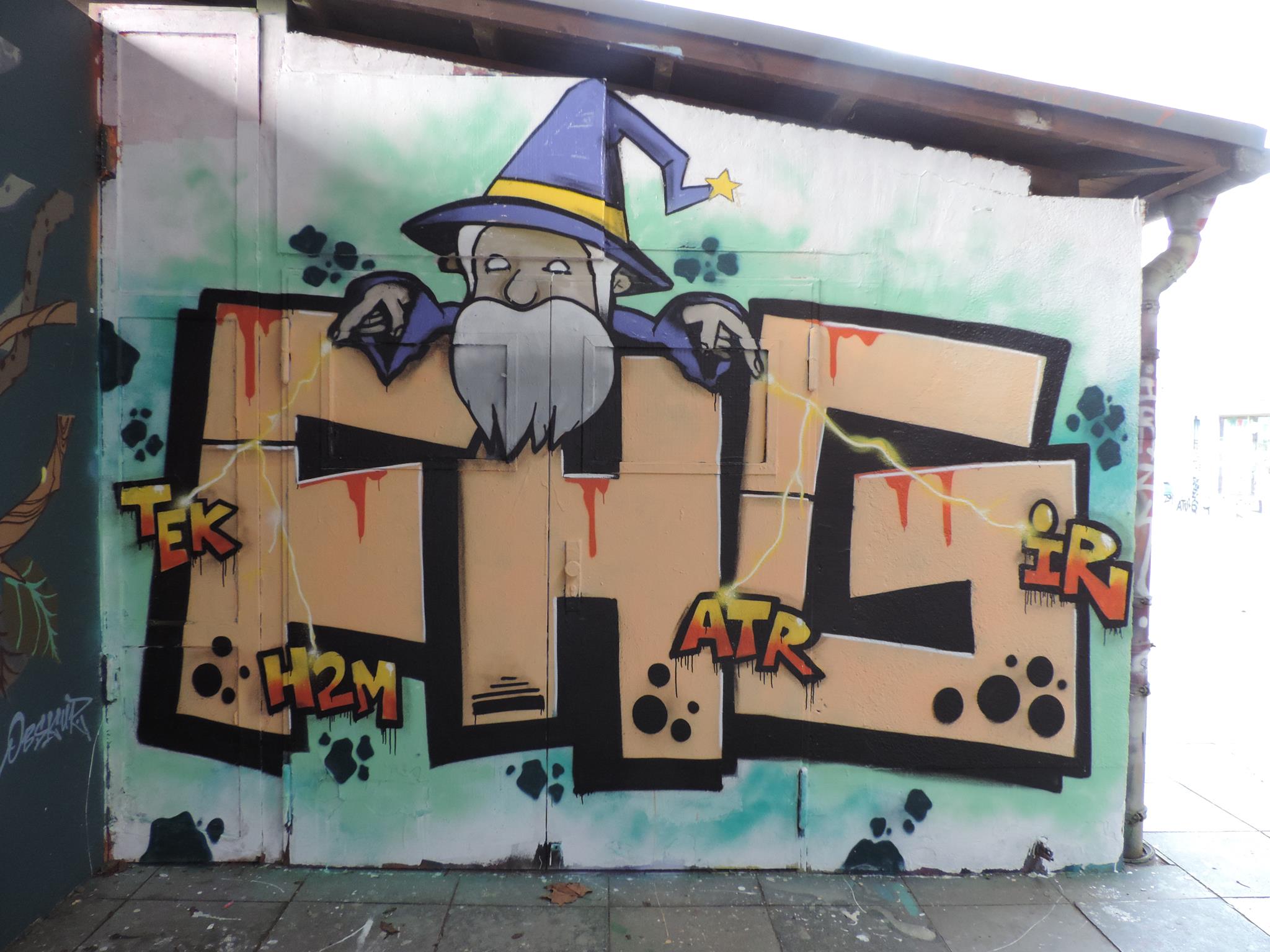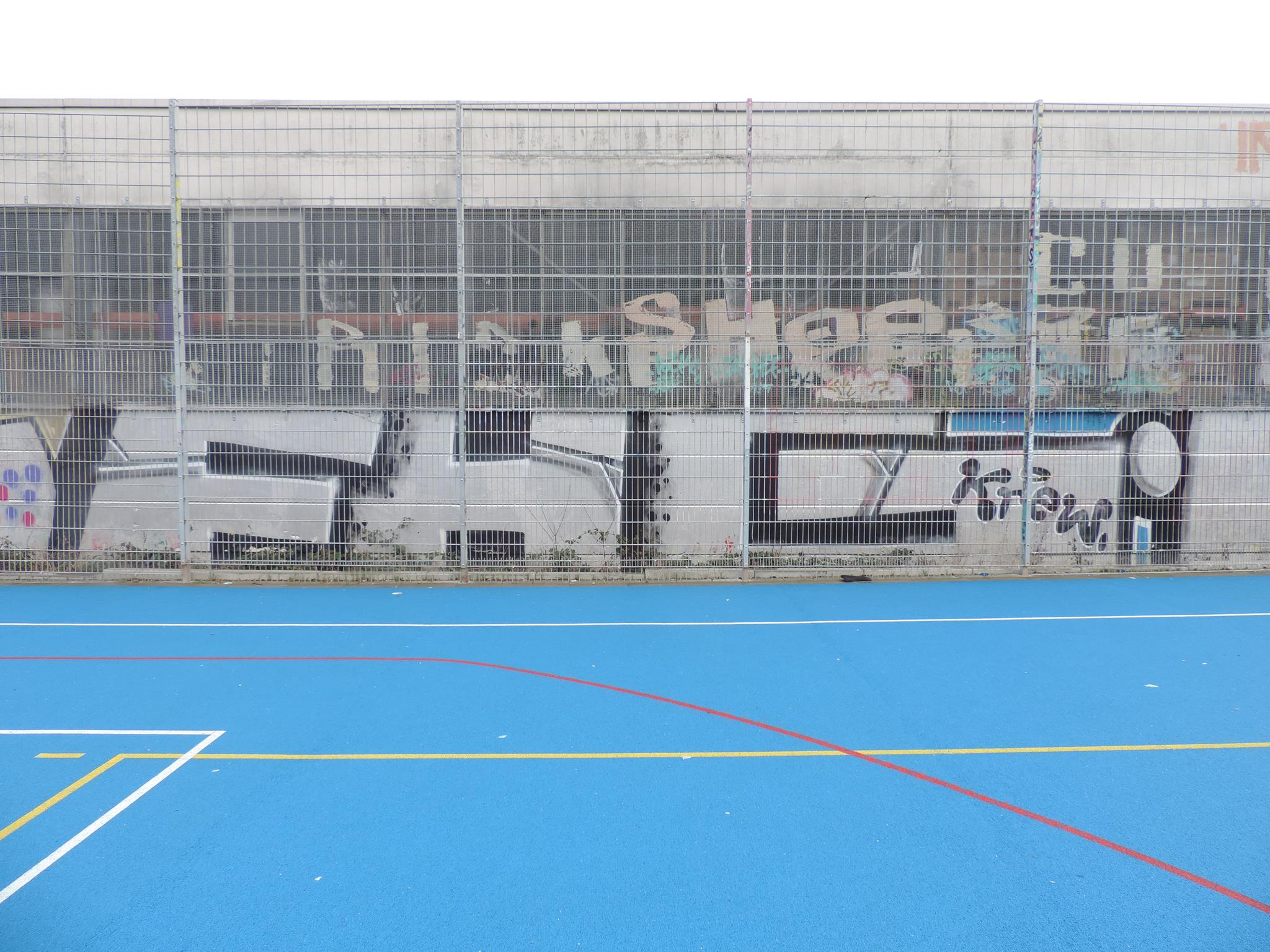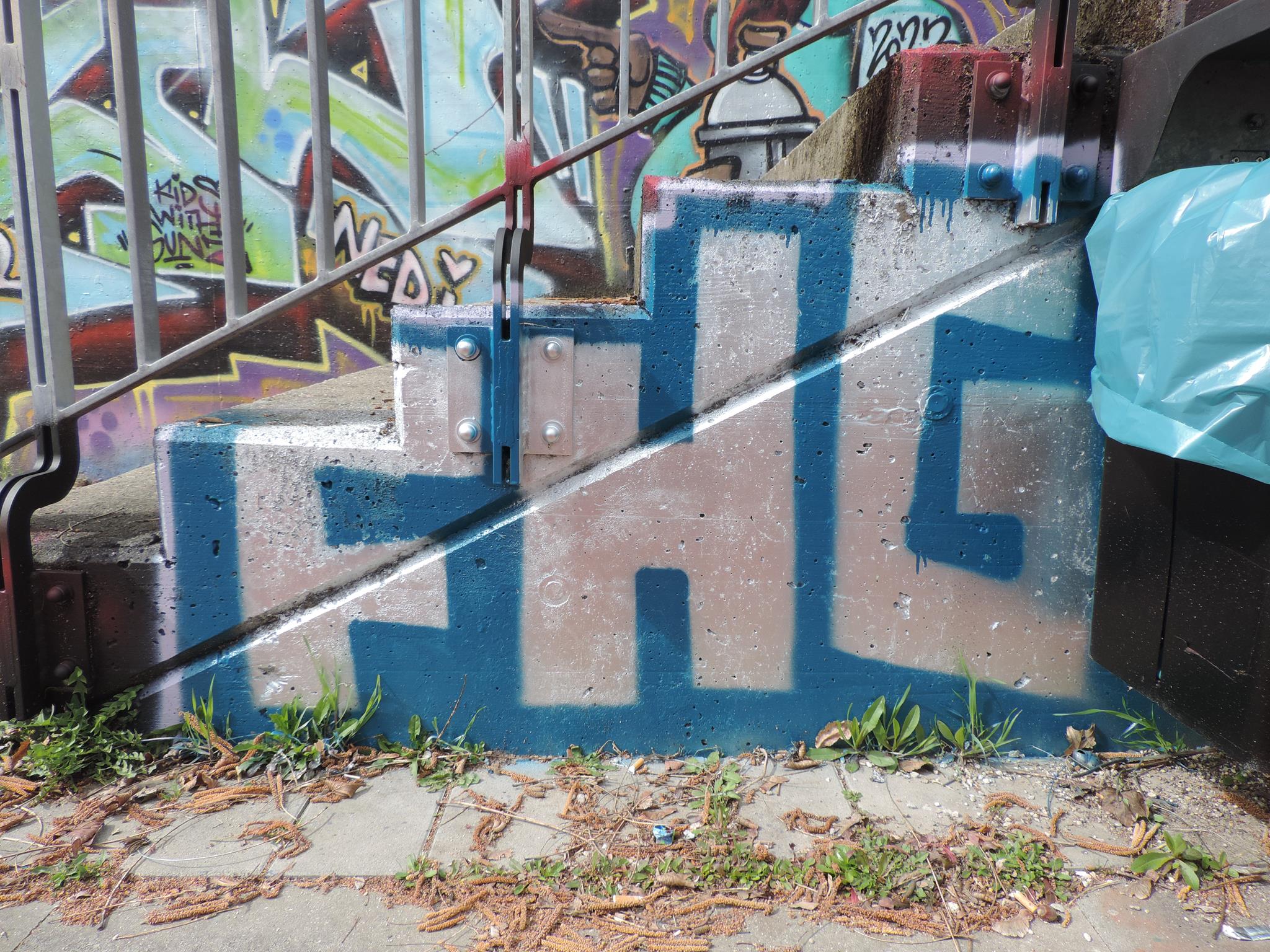 On the left behind the stairs is an artwork from SOUND, on the two garbage bins on the upper right and on the left bottom are two graffiti from the IR CREW and the red writing in the front middle is from the FHG CREW and on the front left you can see a graffiti from FE.