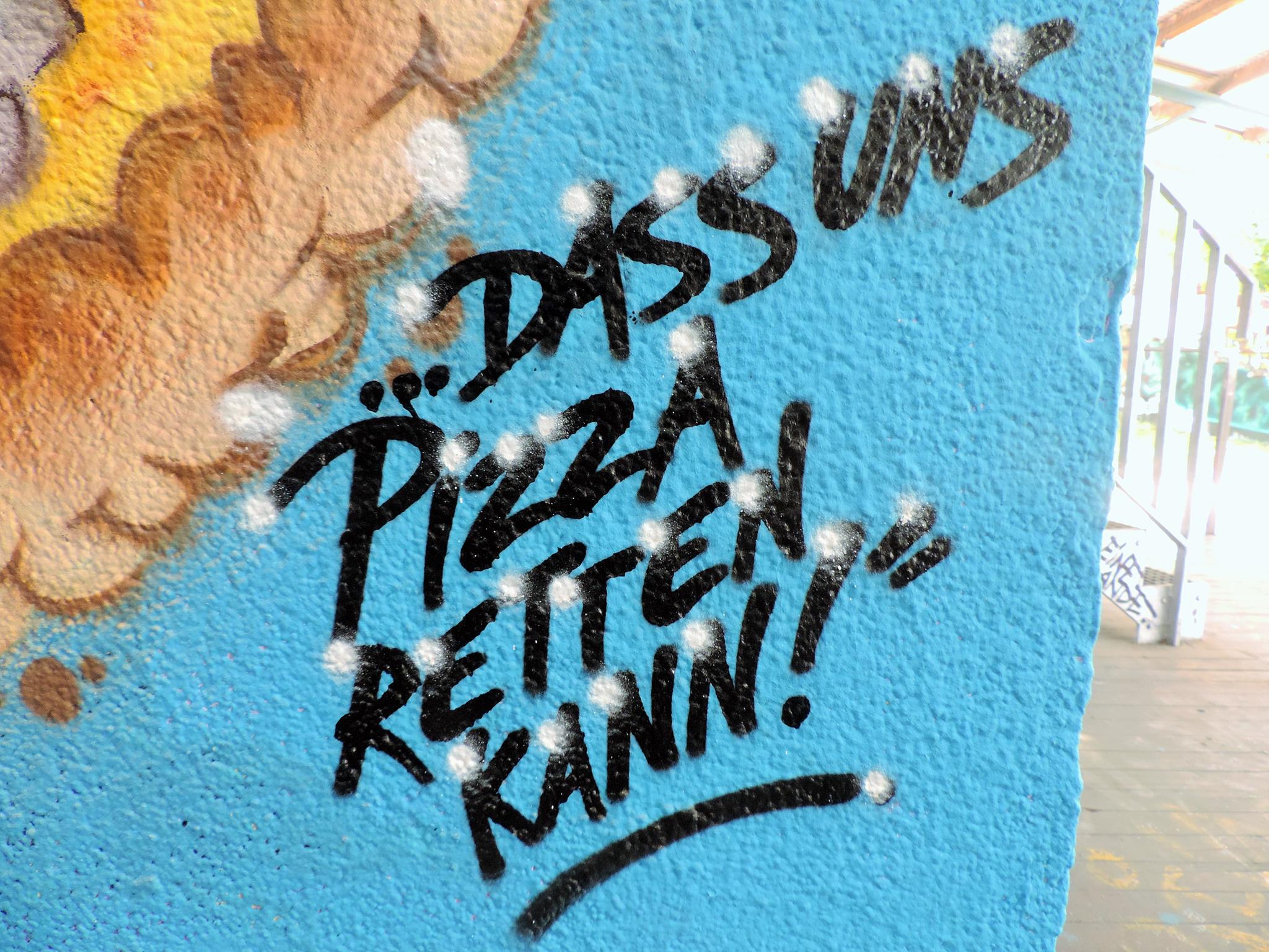 „Und ich glaube fest daran, dass uns Pizza retten kann!“  –  „And I strongly believe that pizza can save us!“