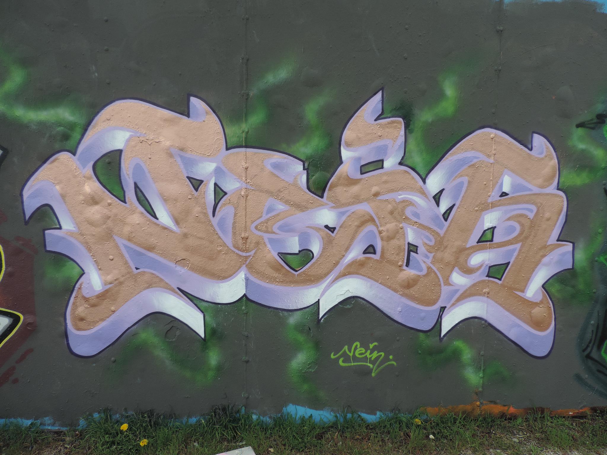 On the left is a graffiti from KICK, the piece in the middle is from NEIN and the graffiti on the right was made by ACES. Next to the stairs in the right corner is a graffiti from the IR CREW.