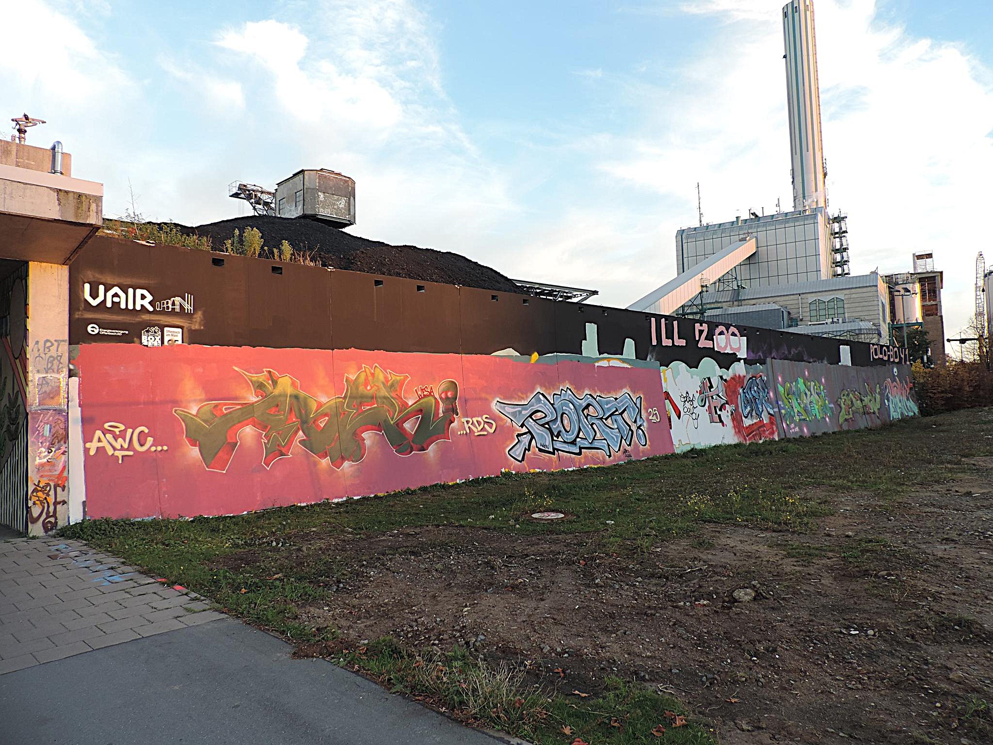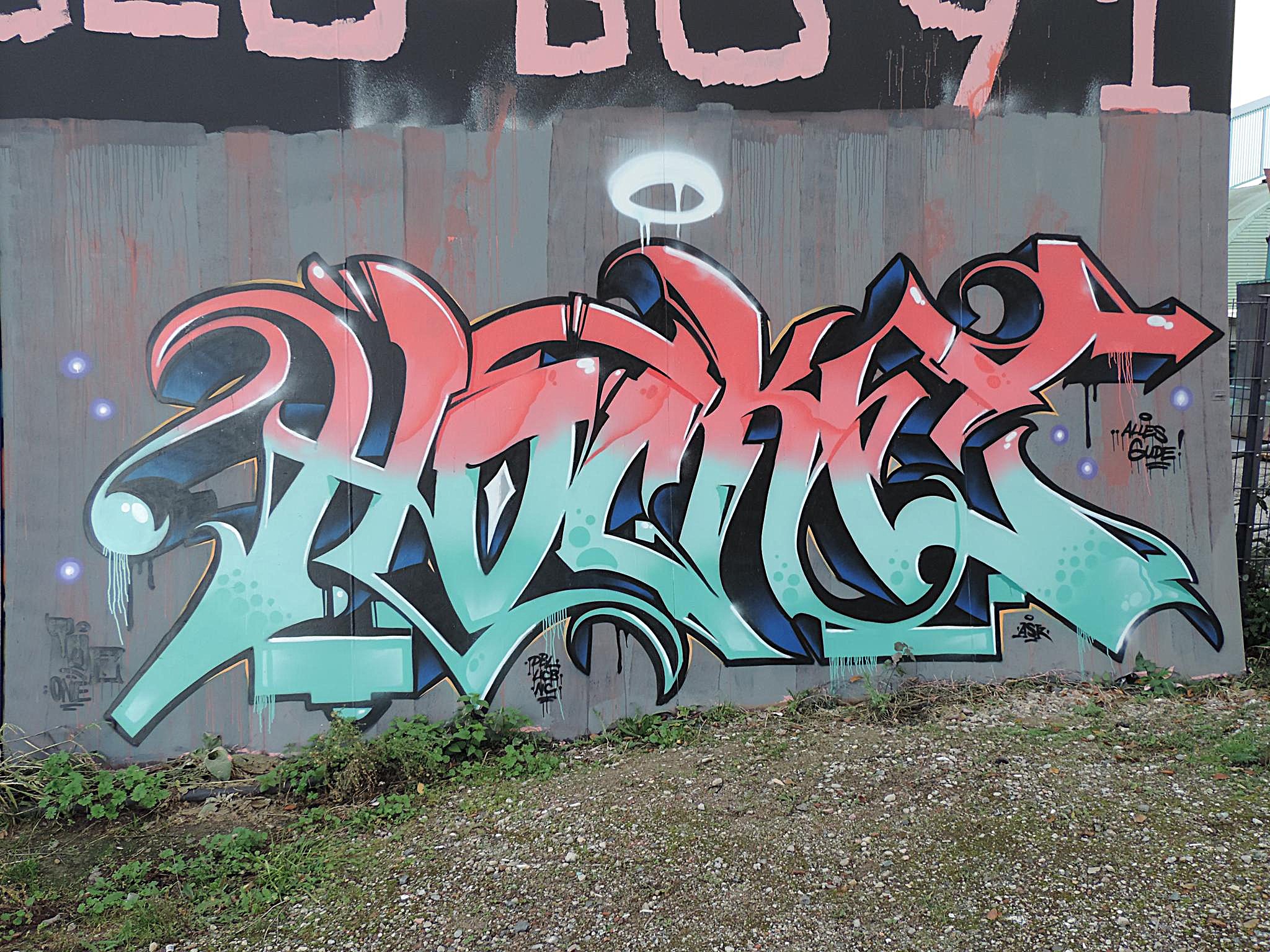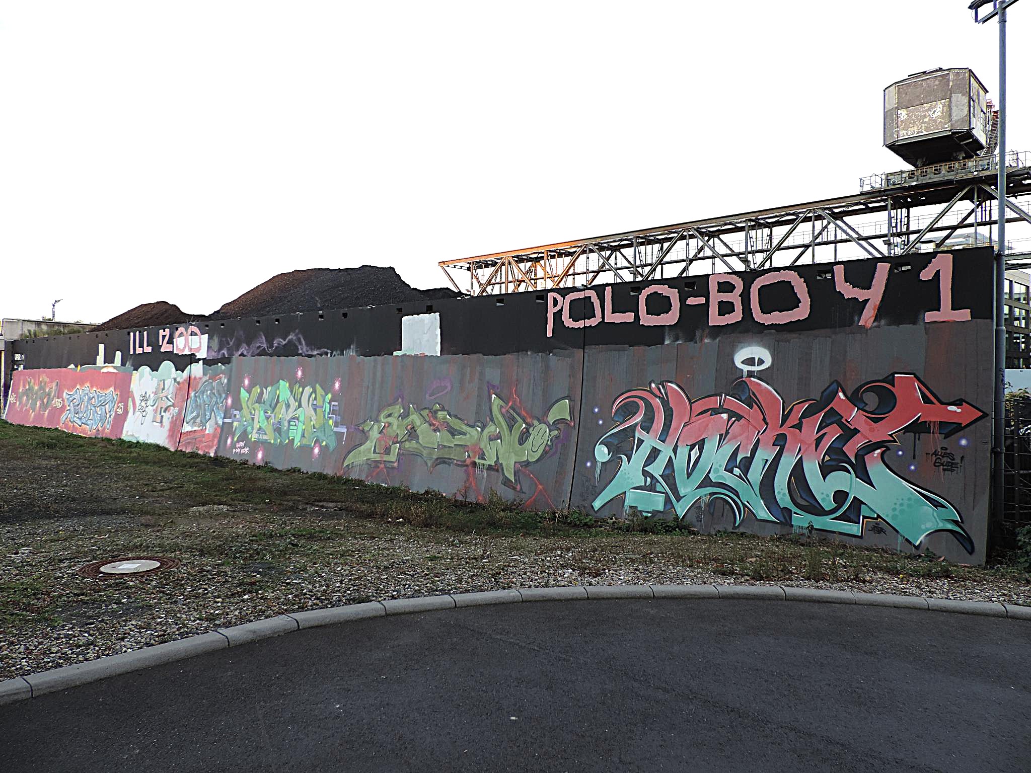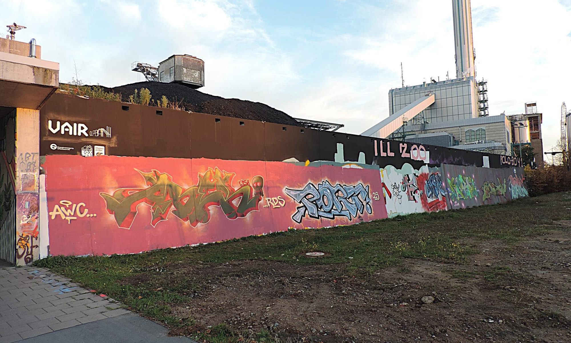 One more place to be creative and one more spot to spray without having to run away! On 7th June in 2025 the new Graffiti Hall in Offenbach at Mainkai was opened, a legal wall where artists can freely do their thing. While the area around the harbor island in Offenbach is being expanded and modernized piece by piece, new open spaces and walls for urban art also show up. At the promenade along the harbor basin THEKRA JAZIRI aka JAZIRKUS had already created a beautiful long artwork. If you walk through this passageway towards the west, you will find the new creative space just around the corner. Or if you are coming from the west, then you will find it in front of the passageway. The wall, which is almost 100 meters long and four meters high, offers a legal space for graffiti artists to freely express their creativity. The coal storage facility with ship loading behind the wall is also architecturally very interesting, and a huge horizontal cargo crane towers above it, adding to the fascinating image. The whole thing was initiated by the artists DOUBLE D and ARTMOS4, who invited 10 other graffiti artists for the opening jam to give the wall some stunning pieces right from the start. Since then, the façade has been open to everyone and everybody can legally spray paint and engage in artistic activities there.
