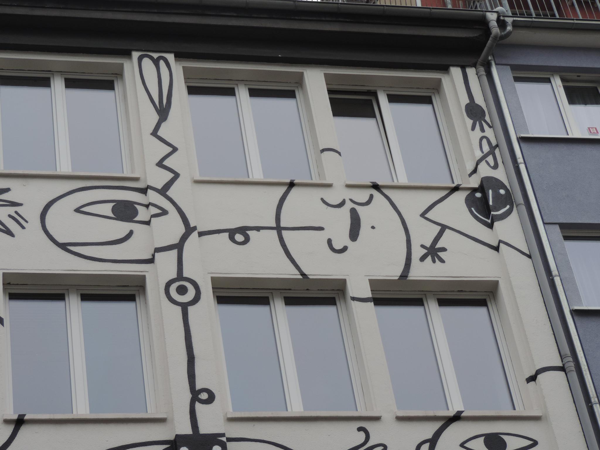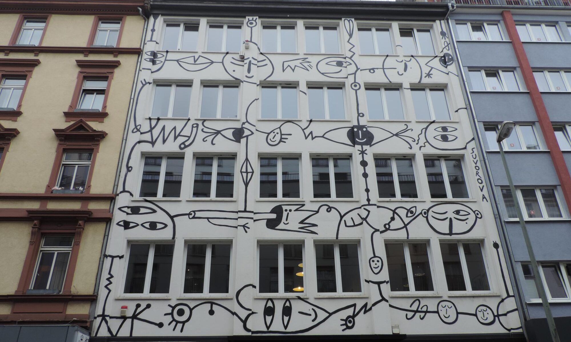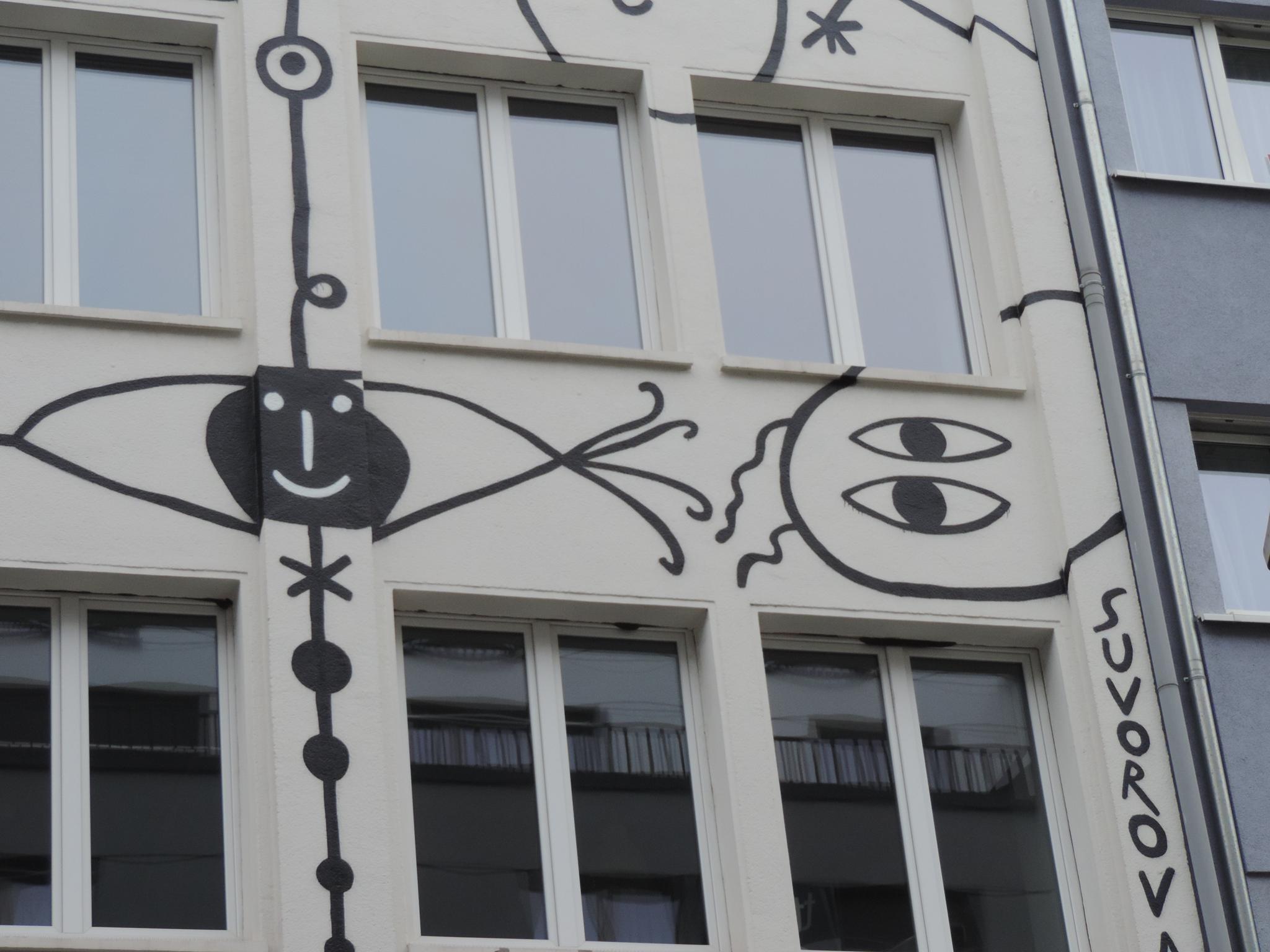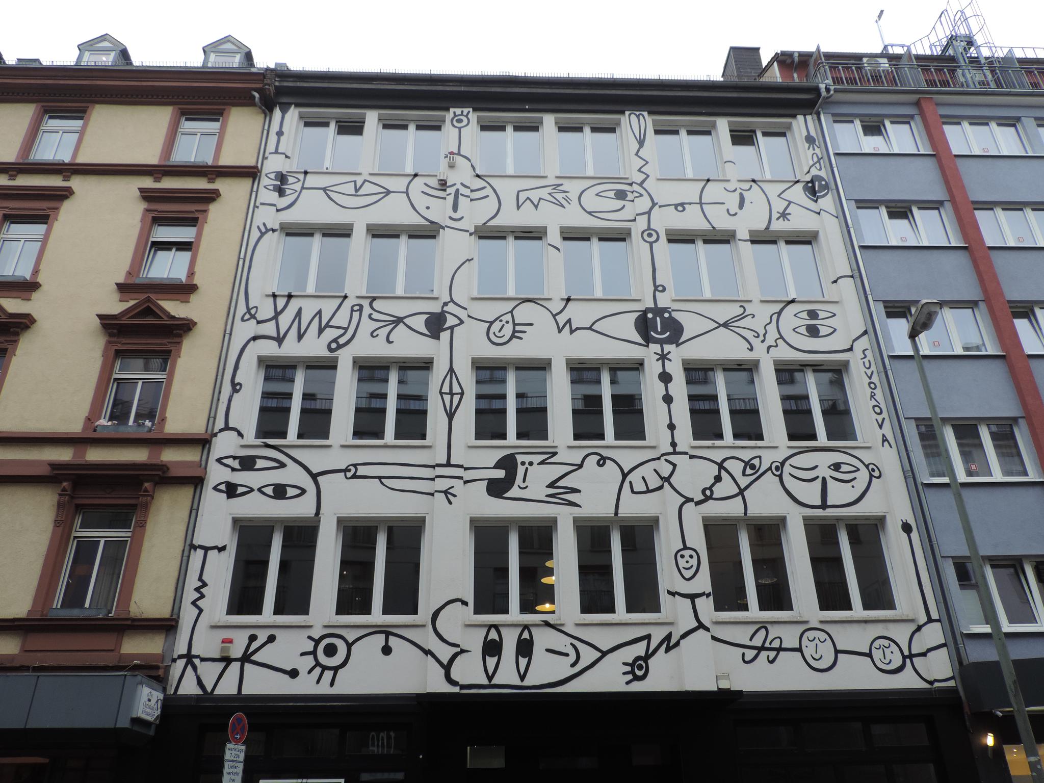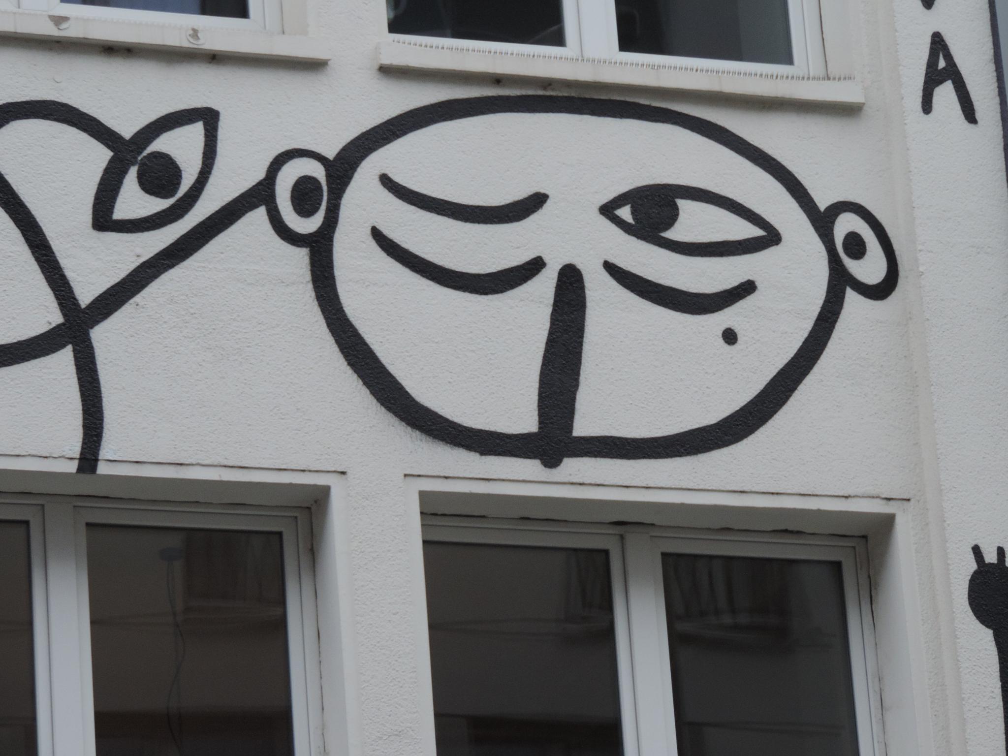 The artist KRISTINA SUVOROVA, also known as KRISTINA SUPERNOVA, originally comes from the Lithuanian city of Rietavas. From 2014, she lived in Frankfurt for several years and now has a studio in Berlin. In 2021, she created this beautiful mural titled „Von Augen und Gesichtern“, or in English „Of Eyes and Faces“, on the building housing the SCHIERKE SEINECKE gallery and its offshoot RUNDGÄNGER. When you admiring the mural, it is definitely recommended to have a visit to the current exhibitions there. As the name of the huge artwork suggests, the large building facade depicts many faces with numerous eyes, painted in a simple, almost childlike style reminiscent of the cryptic Brazilian pixação, but more humorous and whimsical.