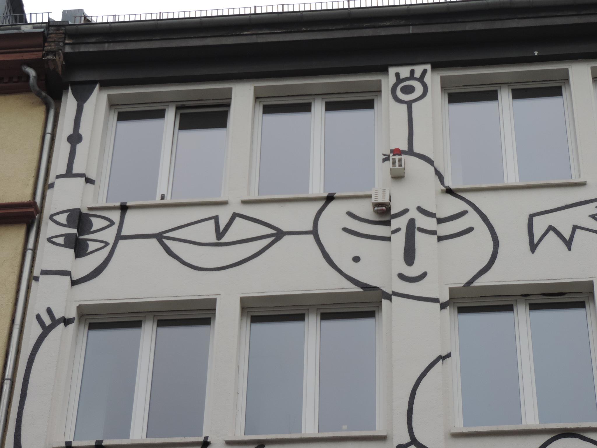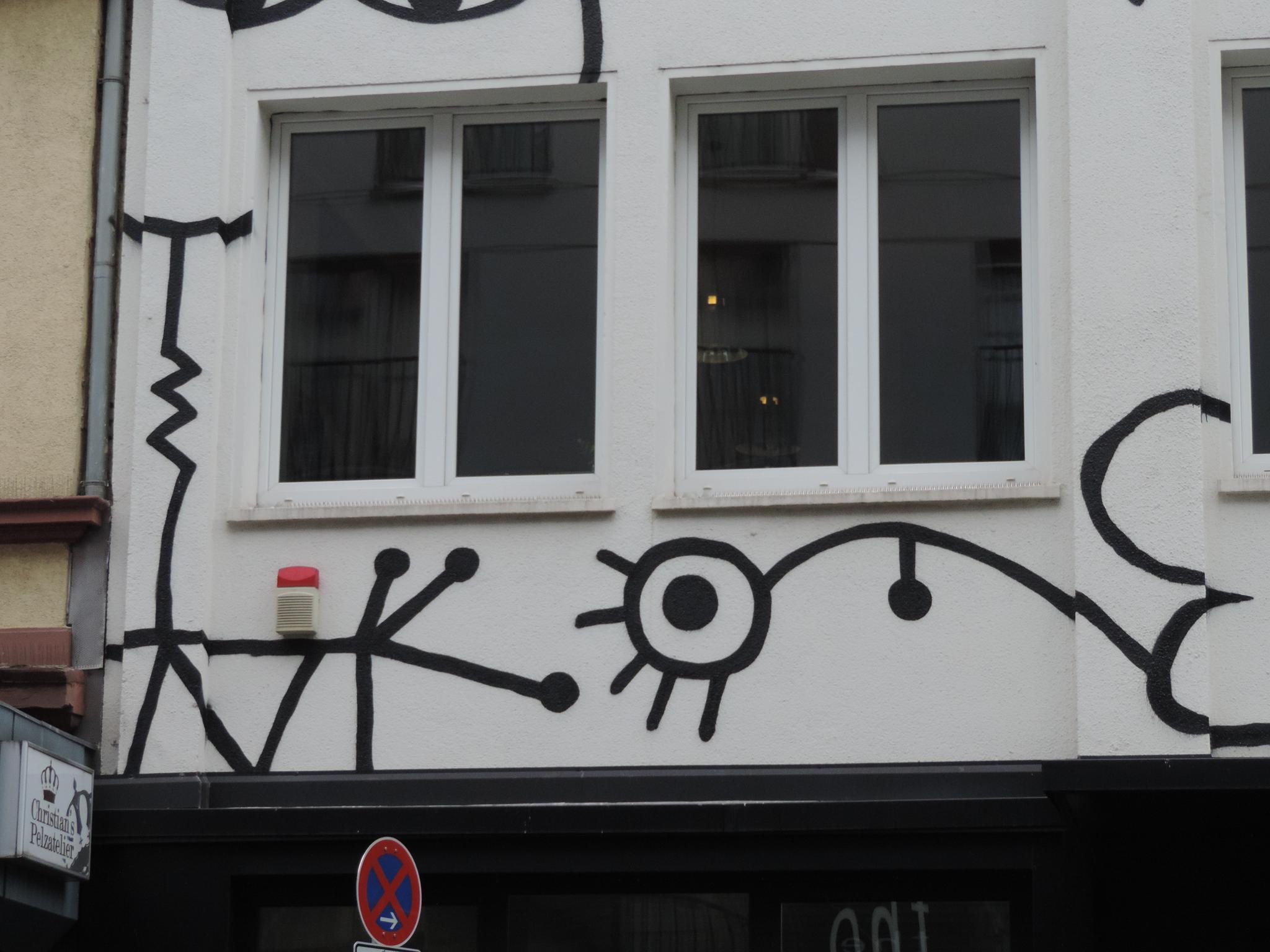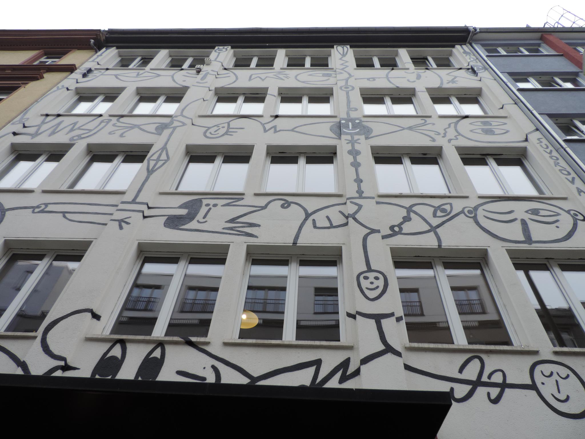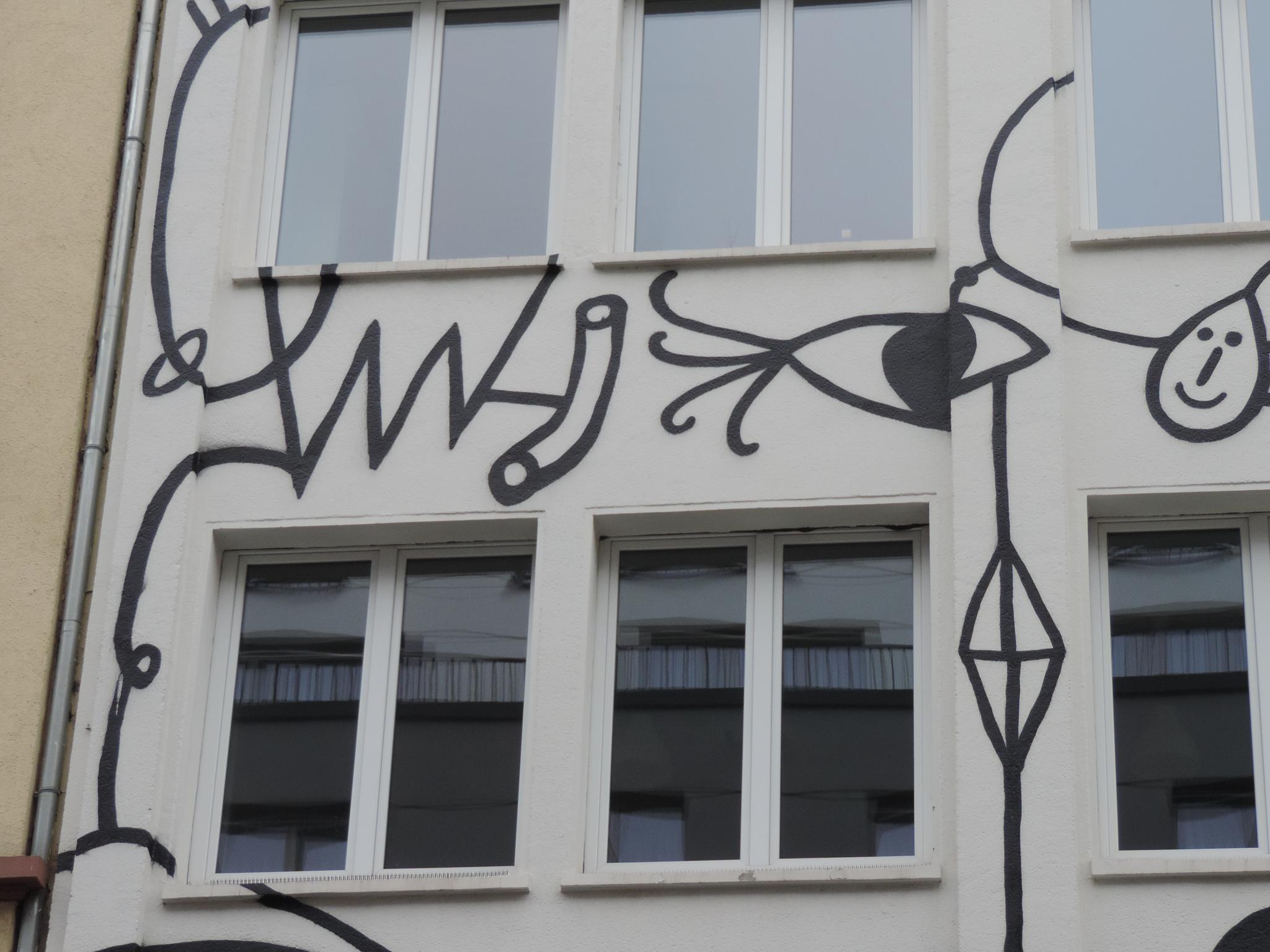 The artist KRISTINA SUVOROVA, also known as KRISTINA SUPERNOVA, originally comes from the Lithuanian city of Rietavas. From 2014, she lived in Frankfurt for several years and now has a studio in Berlin. In 2021, she created this beautiful mural titled „Von Augen und Gesichtern“, or in English „Of Eyes and Faces“, on the building housing the SCHIERKE SEINECKE gallery and its offshoot RUNDGÄNGER. When you admiring the mural, it is definitely recommended to have a visit to the current exhibitions there. As the name of the huge artwork suggests, the large building facade depicts many faces with numerous eyes, painted in a simple, almost childlike style reminiscent of the cryptic Brazilian pixação, but more humorous and whimsical.