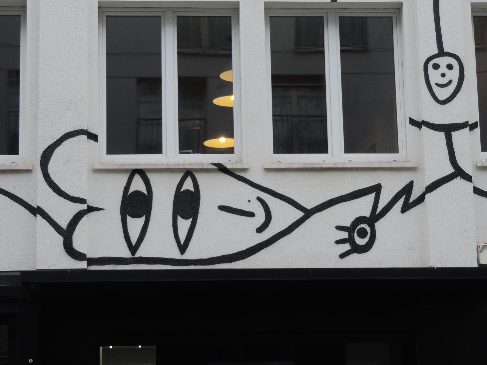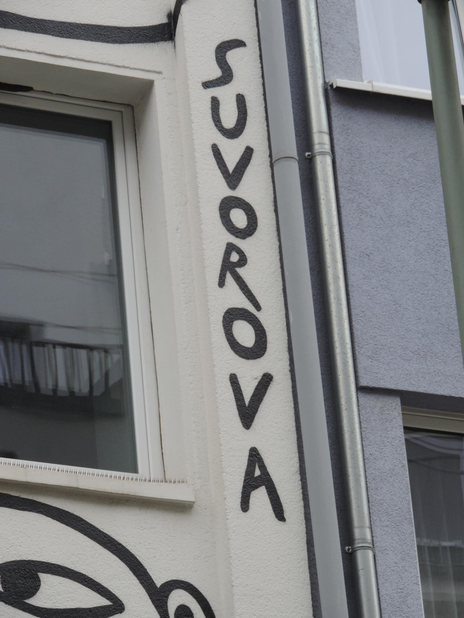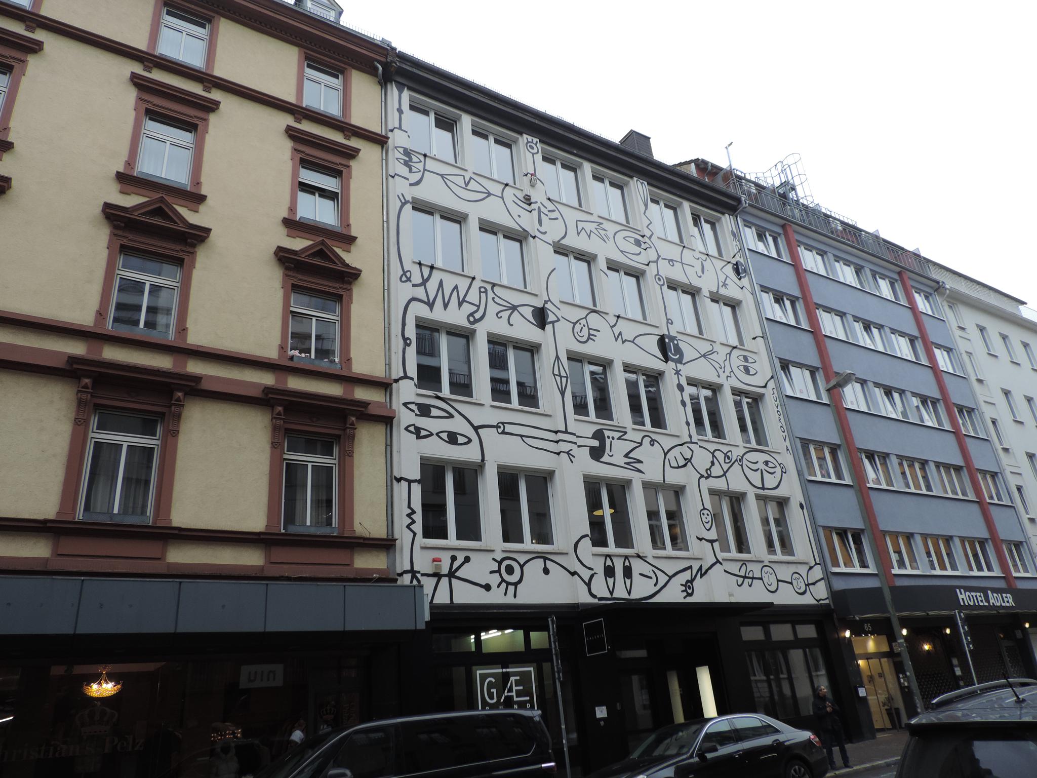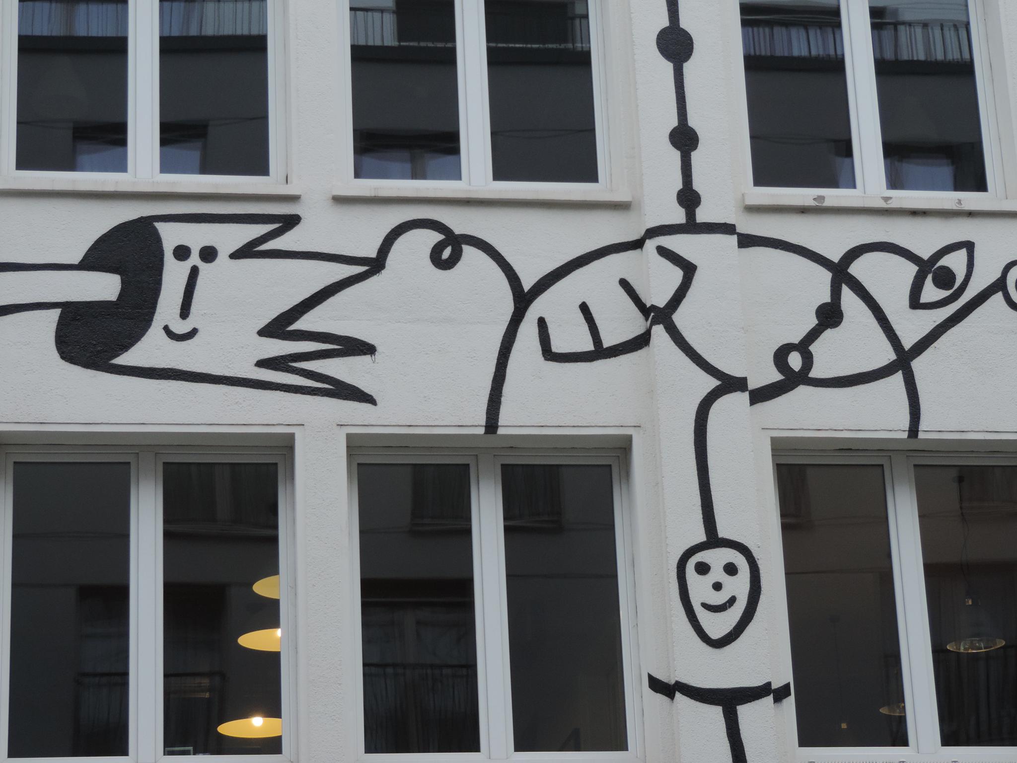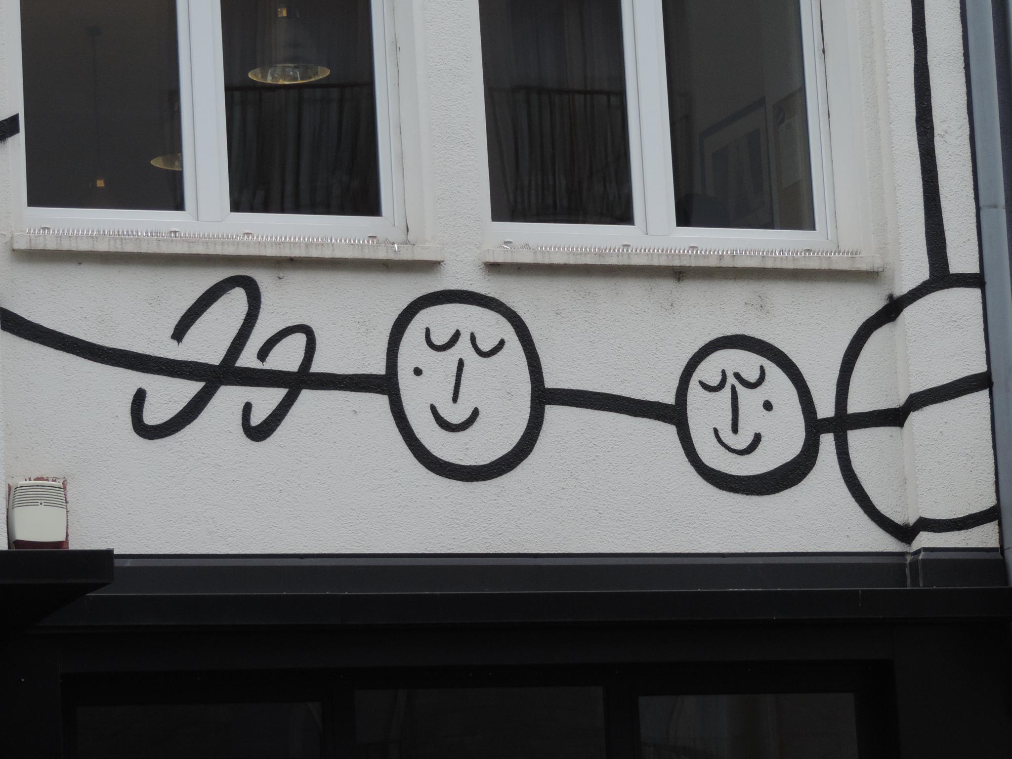 The artist KRISTINA SUVOROVA, also known as KRISTINA SUPERNOVA, originally comes from the Lithuanian city of Rietavas. From 2014, she lived in Frankfurt for several years and now has a studio in Berlin. In 2021, she created this beautiful mural titled „Von Augen und Gesichtern“, or in English „Of Eyes and Faces“, on the building housing the SCHIERKE SEINECKE gallery and its offshoot RUNDGÄNGER. When you admiring the mural, it is definitely recommended to have a visit to the current exhibitions there. As the name of the huge artwork suggests, the large building facade depicts many faces with numerous eyes, painted in a simple, almost childlike style reminiscent of the cryptic Brazilian pixação, but more humorous and whimsical.