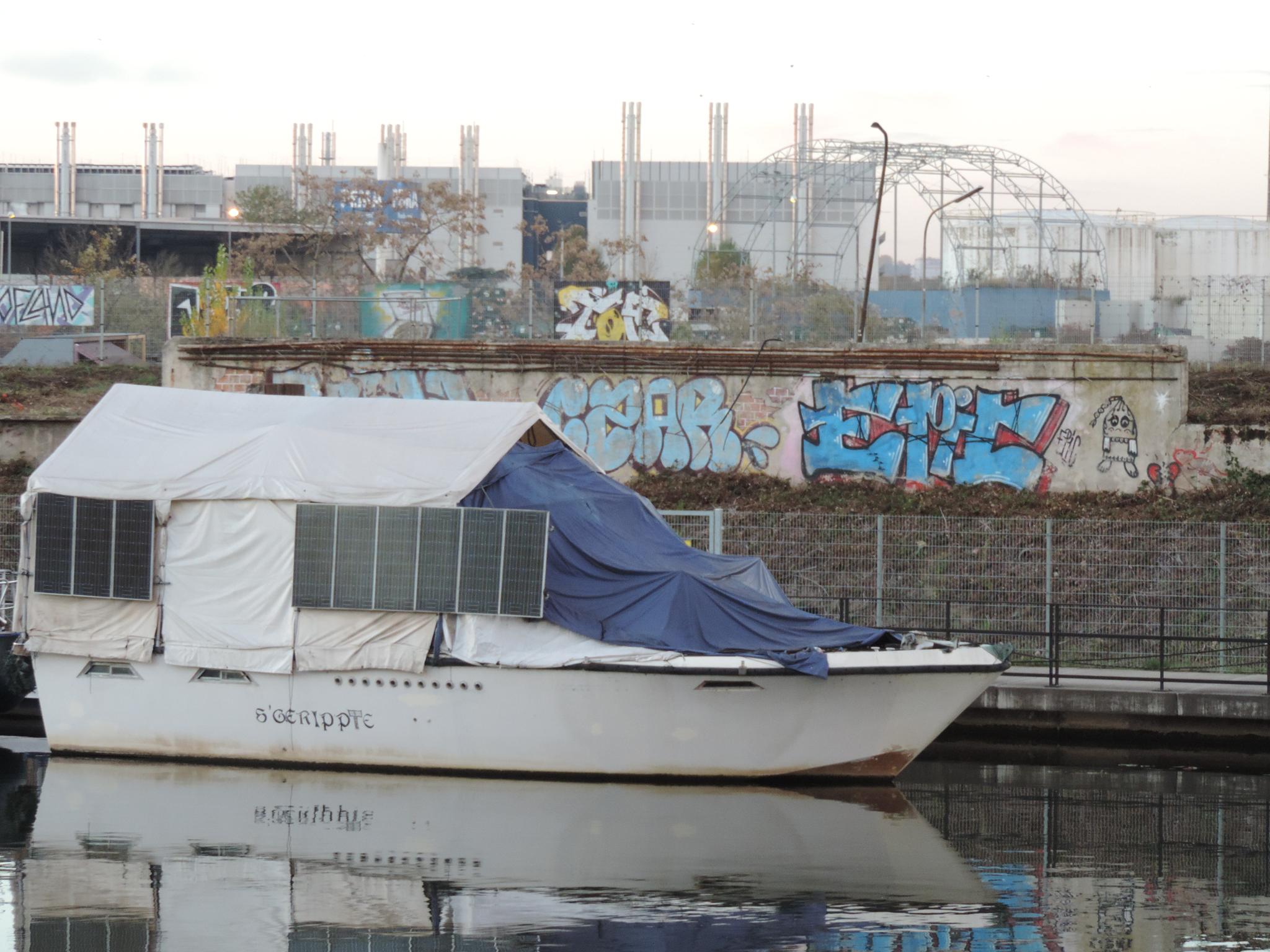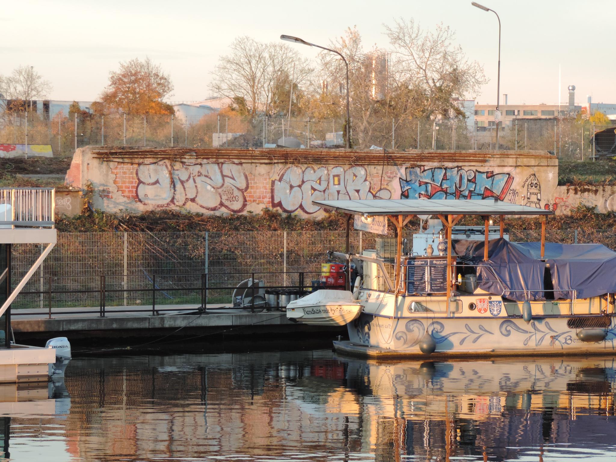 The artworks above on the fence are on the OFLAND SKATEPARK and on the left in the water behind the boat is another boat which is a legendary water vehicle, the so called BEMBEL BOOT. If this painted little ship is not around on the Main river, you can find it resting here.