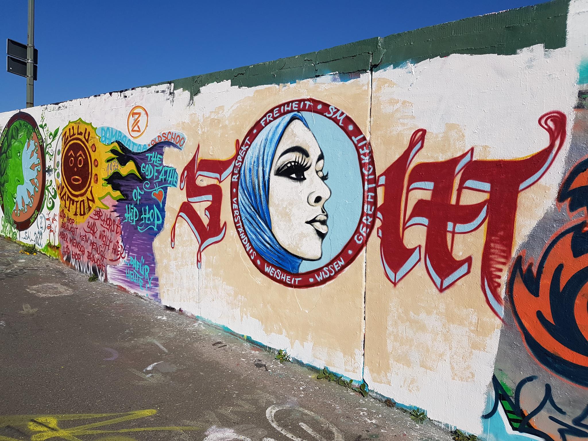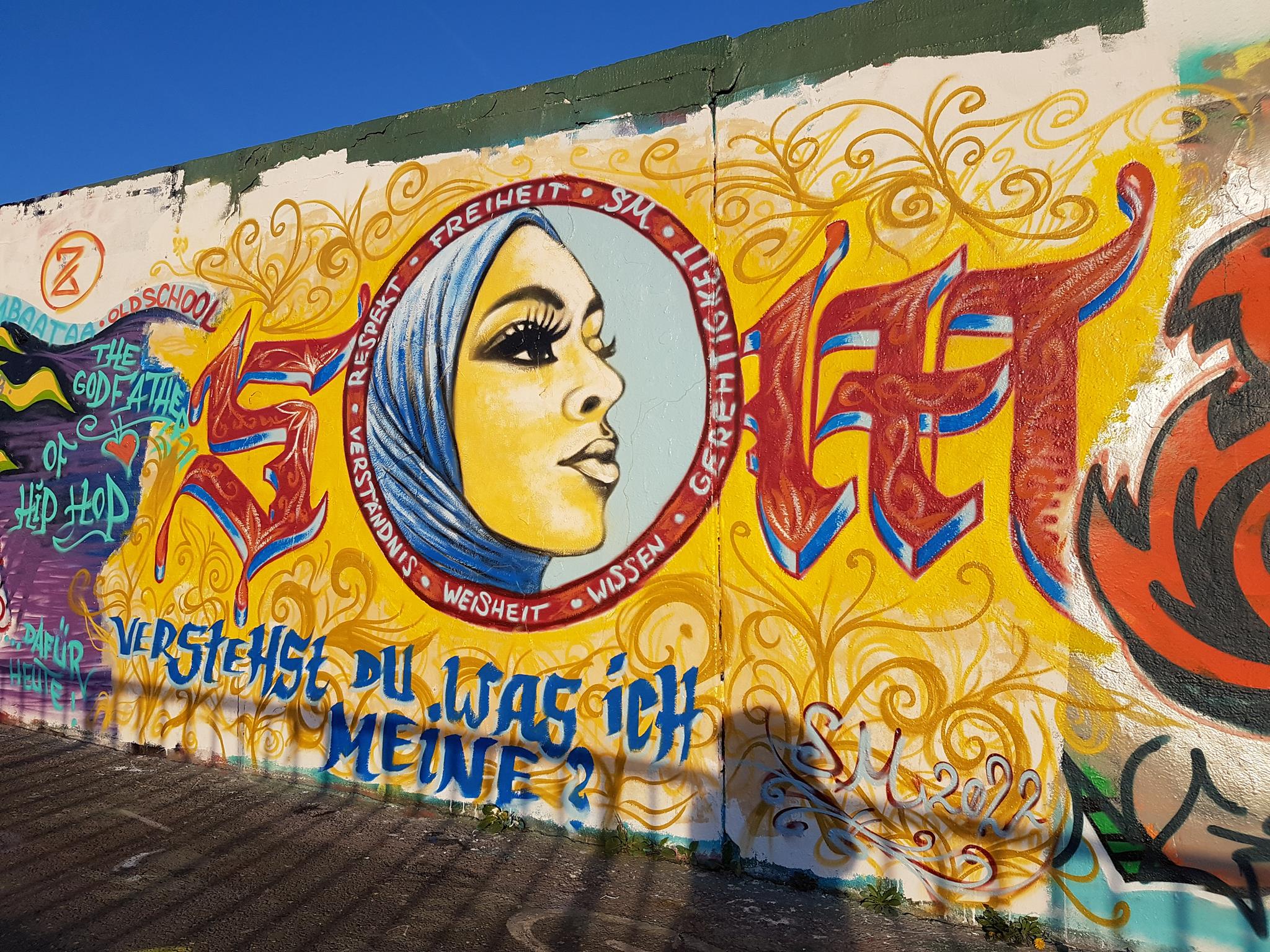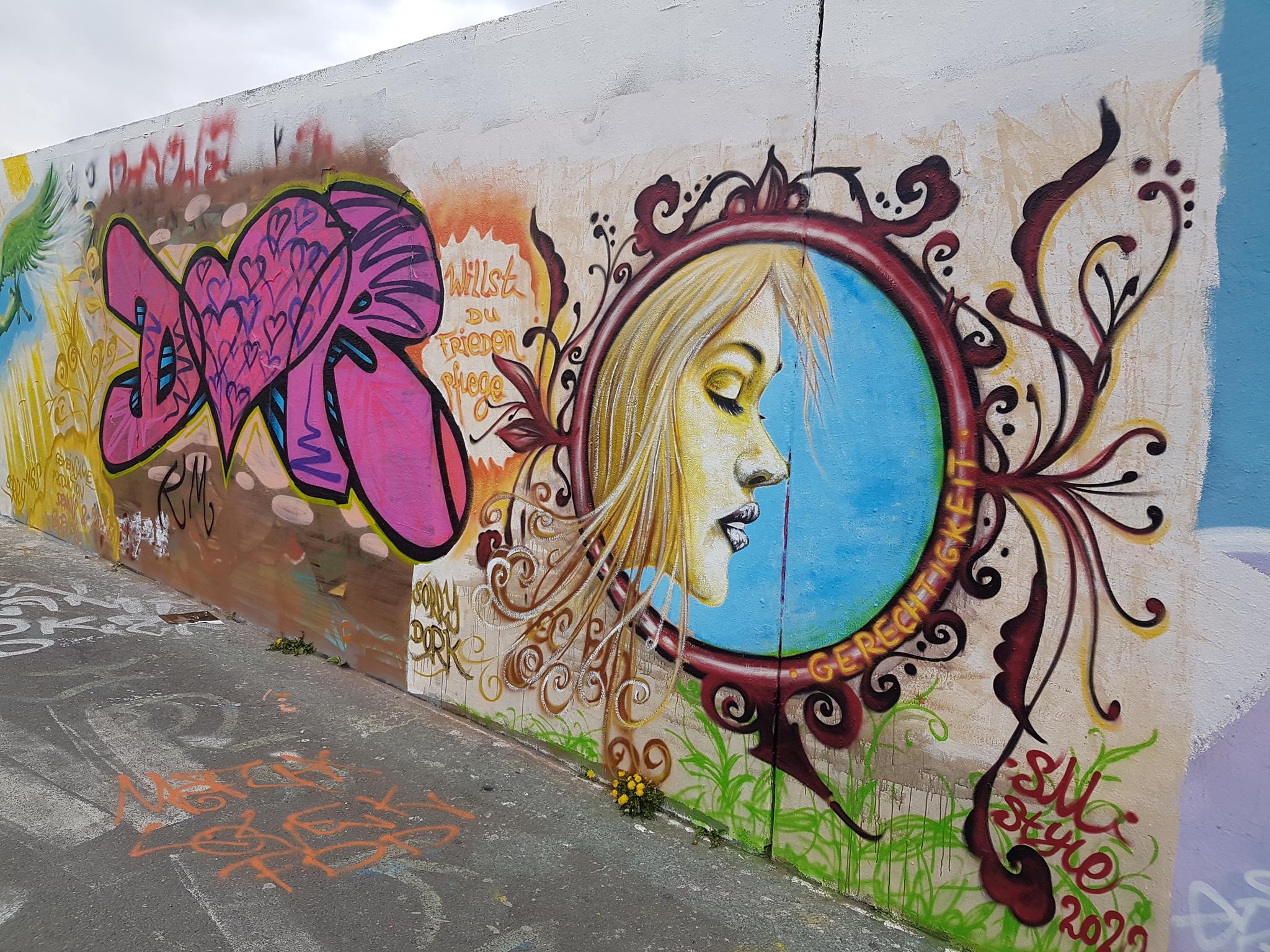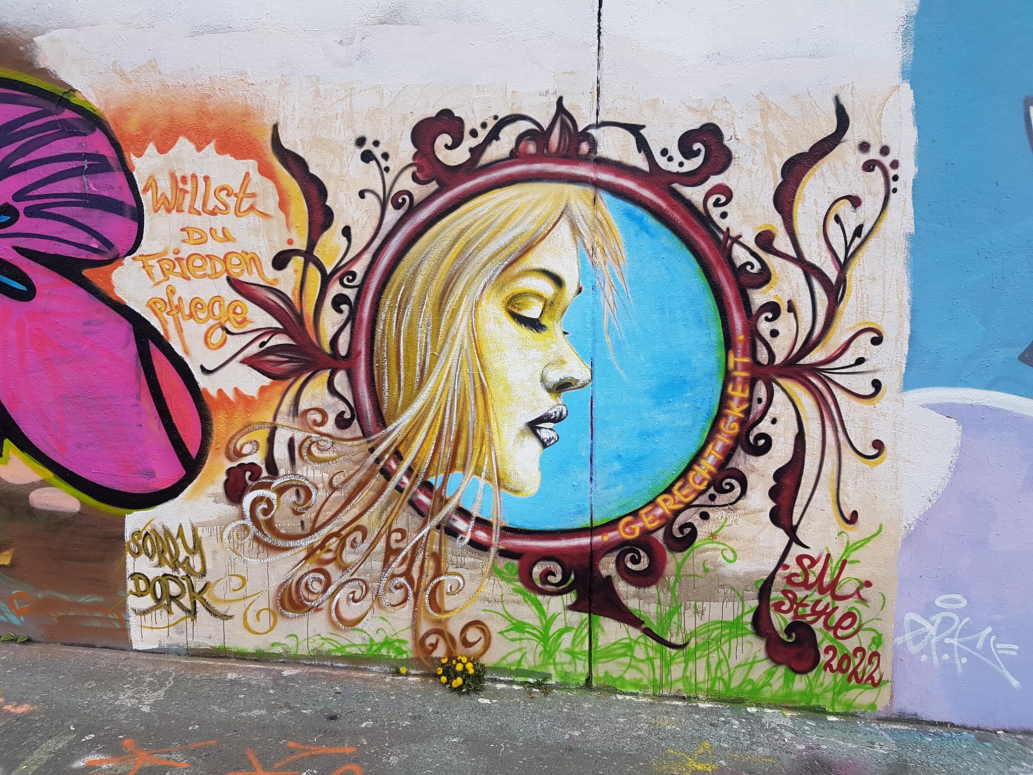 „Willst du Frieden – pflege Gerechtigkeit“ would mean in English „If you want peace then cultivate justice“. The half part of the graffiti on the left was from DORK