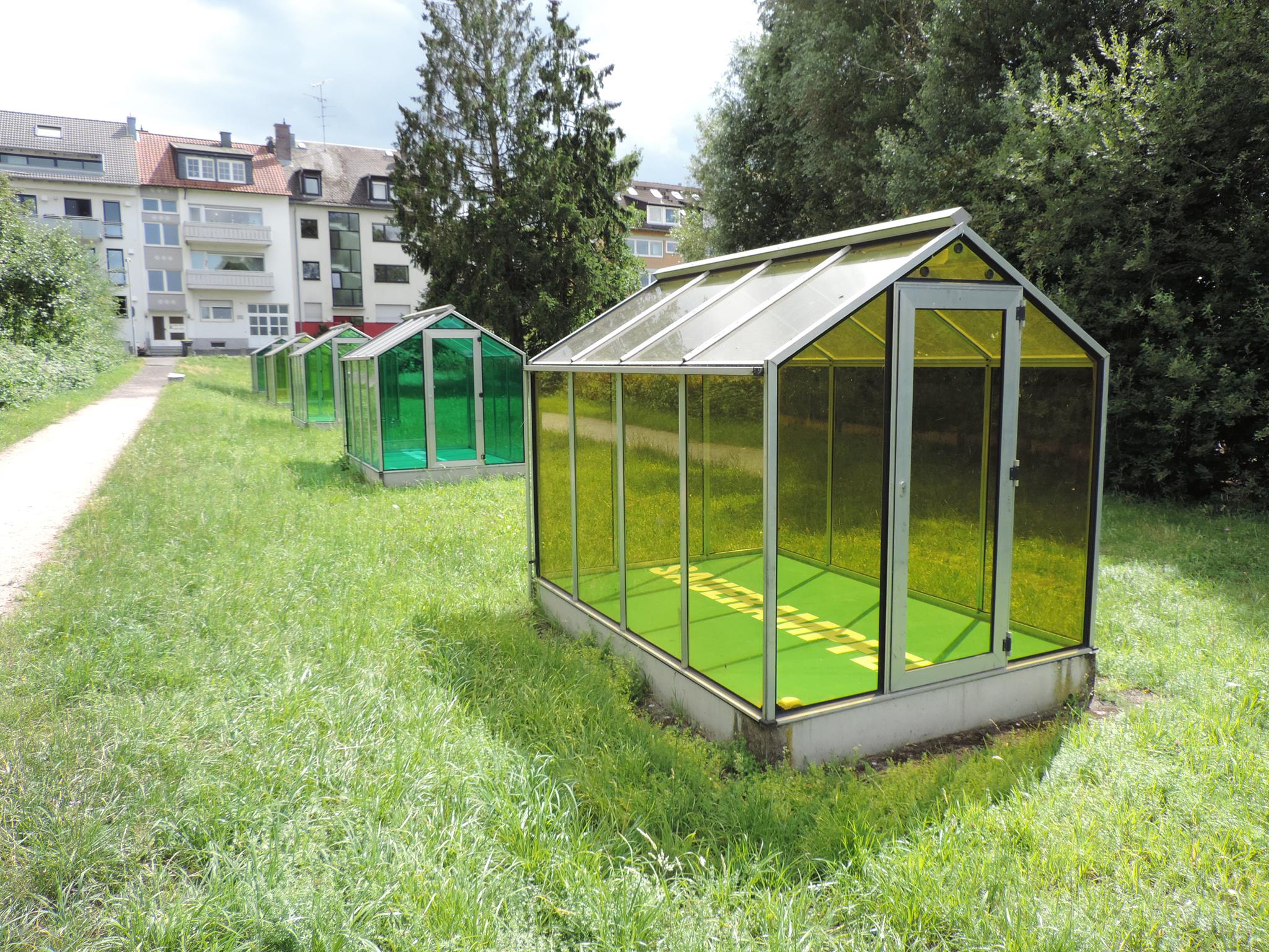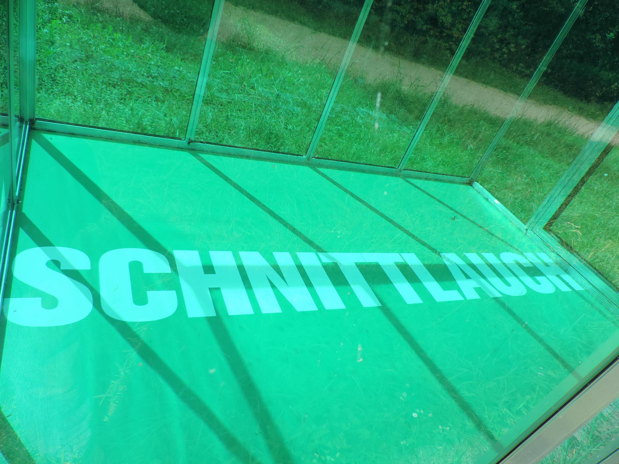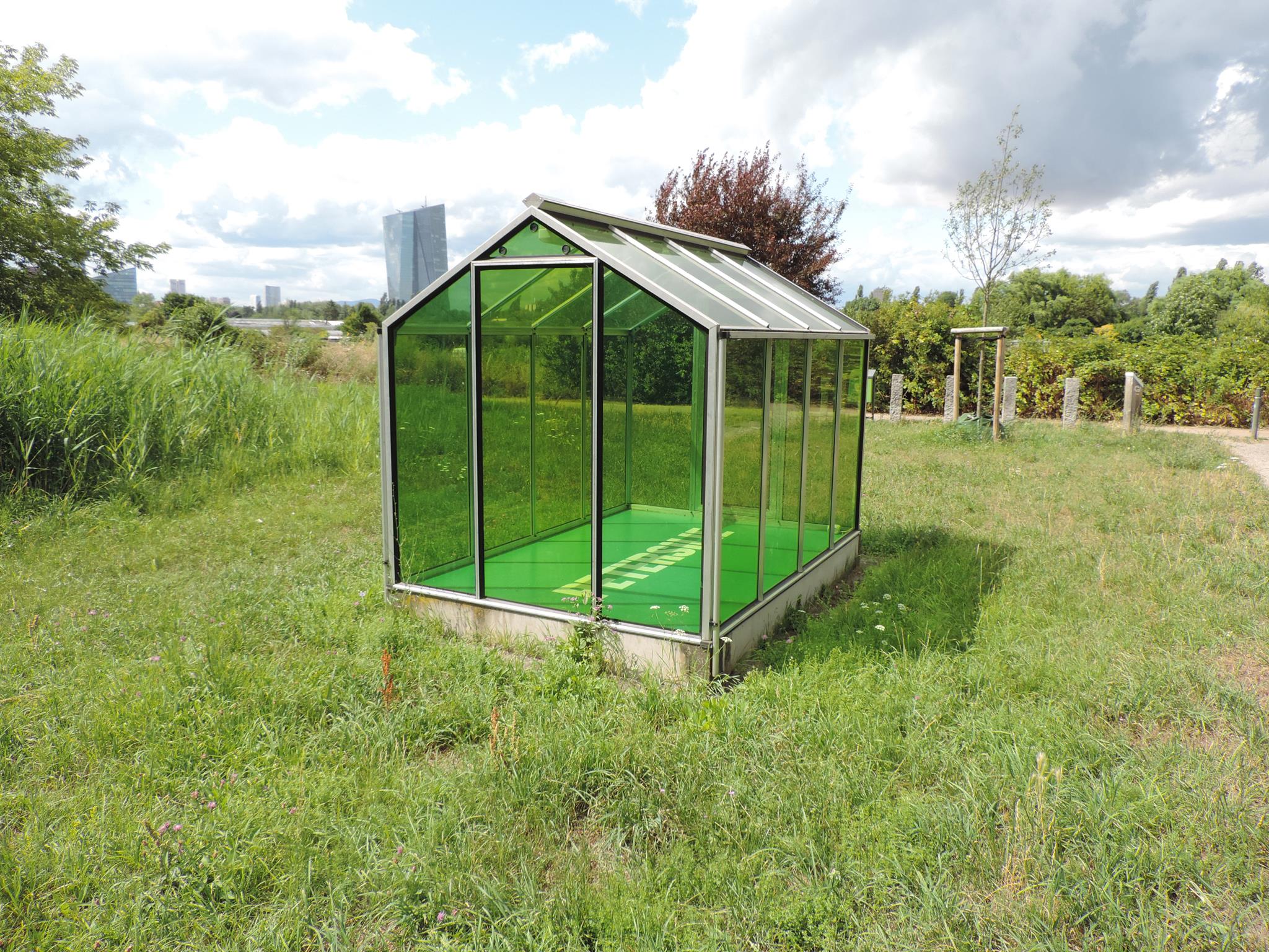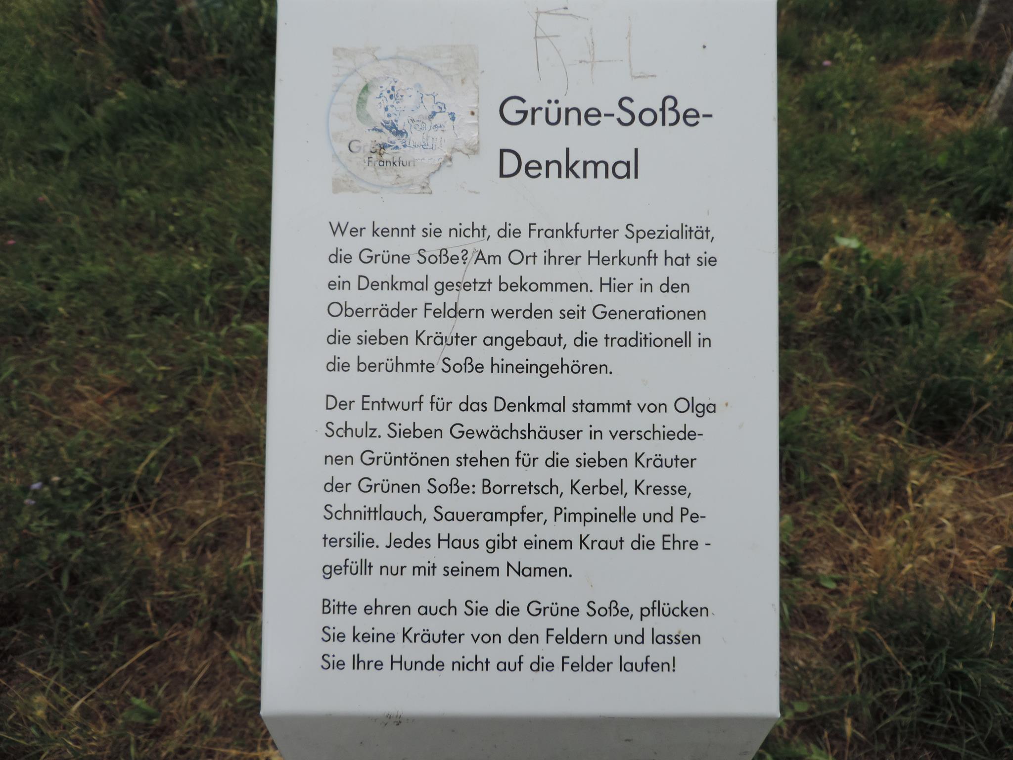Who doesn’t know the Frankfurt specialty, „Grüne Soße“, or in English „Green Sauce“? It has been memorialized at the place of its origin. The seven herbs that traditionally go into the famous sauce have been grown here in the fields of Oberrad for generations. The design for the monument was created by OLGA SCHULZ. Seven greenhouses in different shades of green stand for the seven herbs of the green sauce: Borretsch, Kerbel, Kresse, Schnittlauch, Sauerampfer, Pimpinelle und Petersilie. In English: Borage, Chervil, Cress, Chives, Sorrel, Burnet and Parsley. Each house honors one herb – filled only with its name. Please also honor the green sauce, do not pick herbs from the fields and do not let your dogs run into the fields!