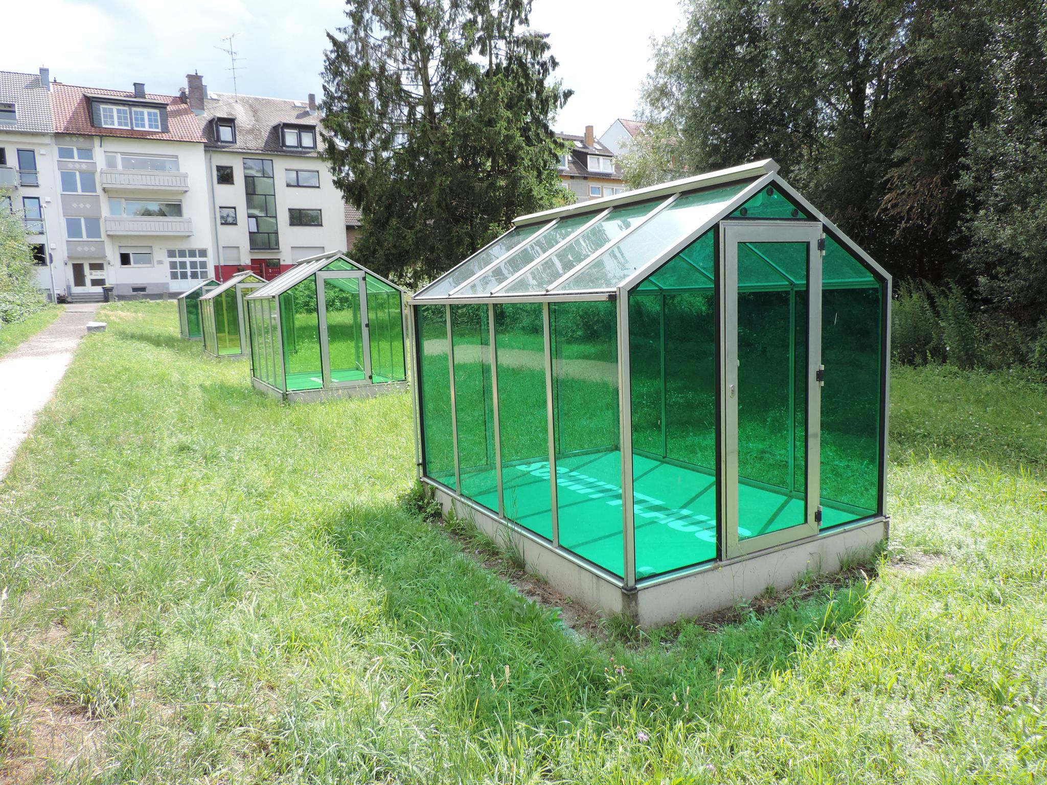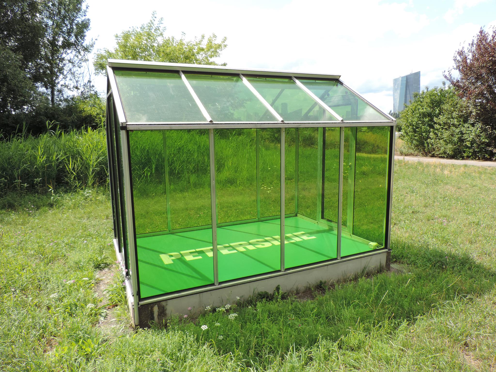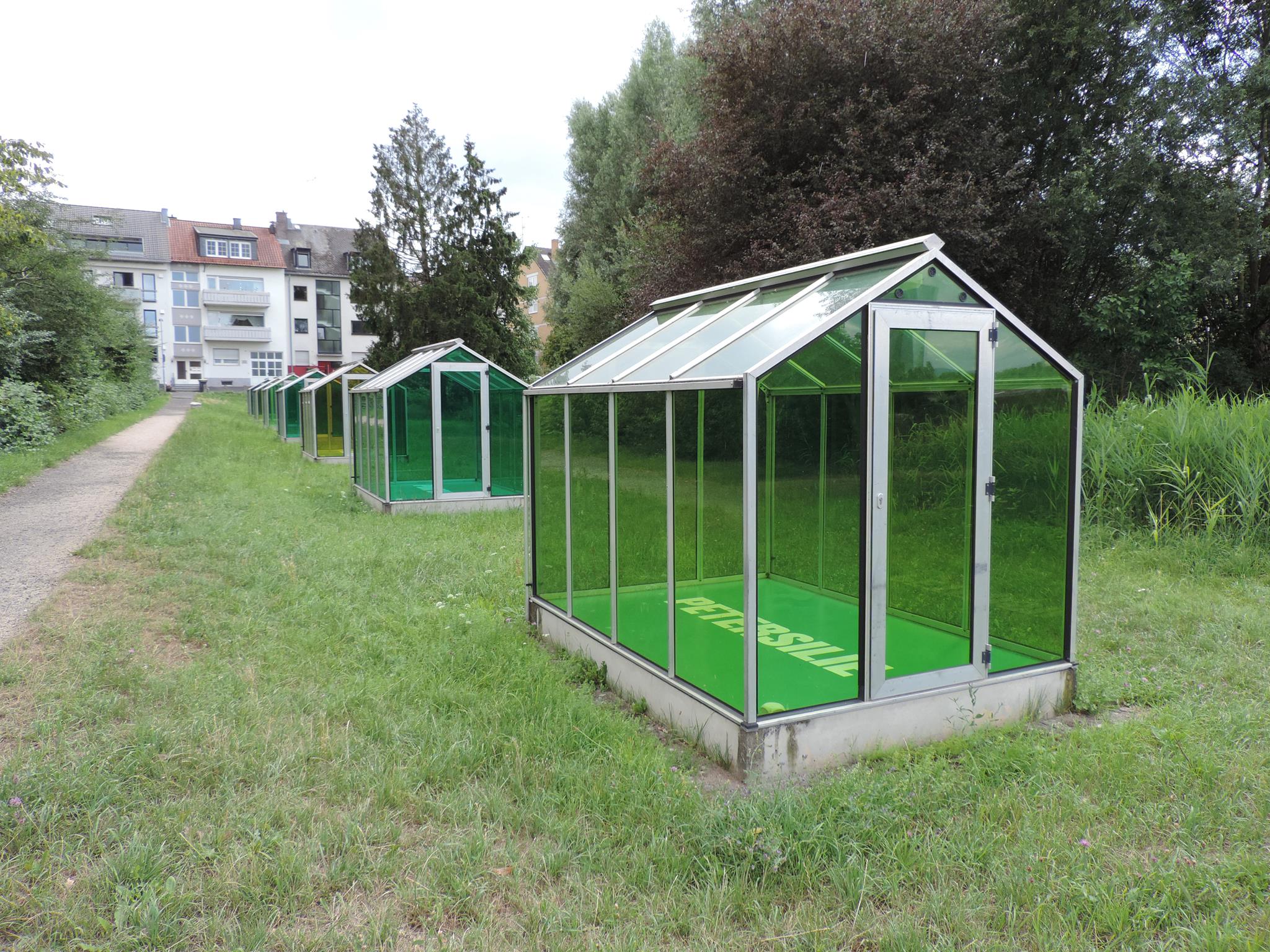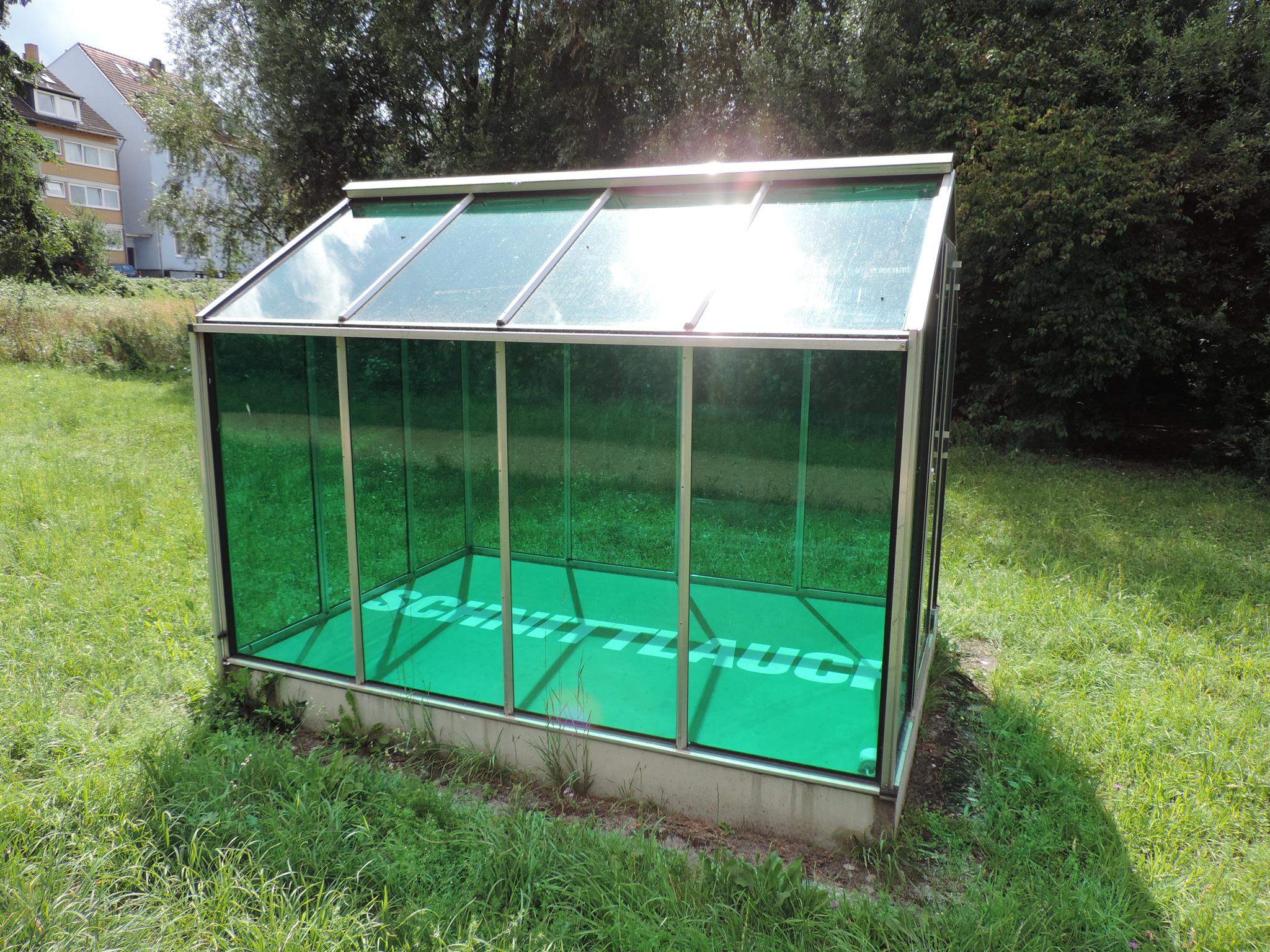 Who doesn’t know the Frankfurt specialty, „Grüne Soße“, or in English „Green Sauce“? It has been memorialized at the place of its origin. The seven herbs that traditionally go into the famous sauce have been grown here in the fields of Oberrad for generations. The design for the monument was created by OLGA SCHULZ. Seven greenhouses in different shades of green stand for the seven herbs of the green sauce: Borretsch, Kerbel, Kresse, Schnittlauch, Sauerampfer, Pimpinelle und Petersilie. In English: Borage, Chervil, Cress, Chives, Sorrel, Burnet and Parsley. Each house honors one herb – filled only with its name. Please also honor the green sauce, do not pick herbs from the fields and do not let your dogs run into the fields!