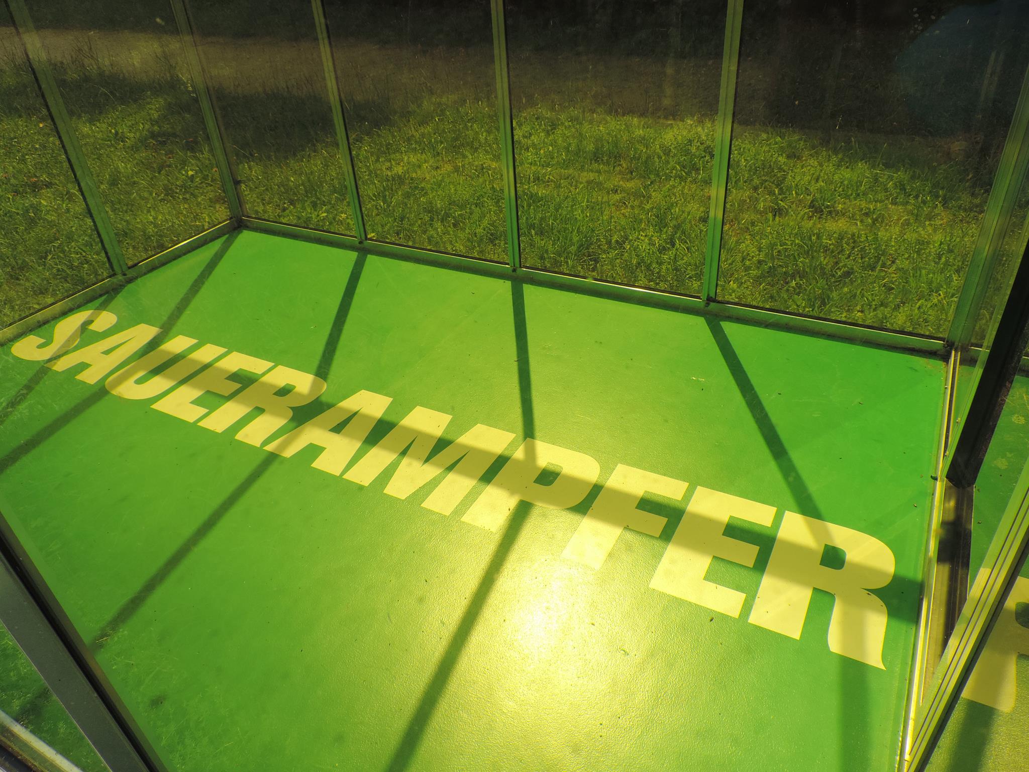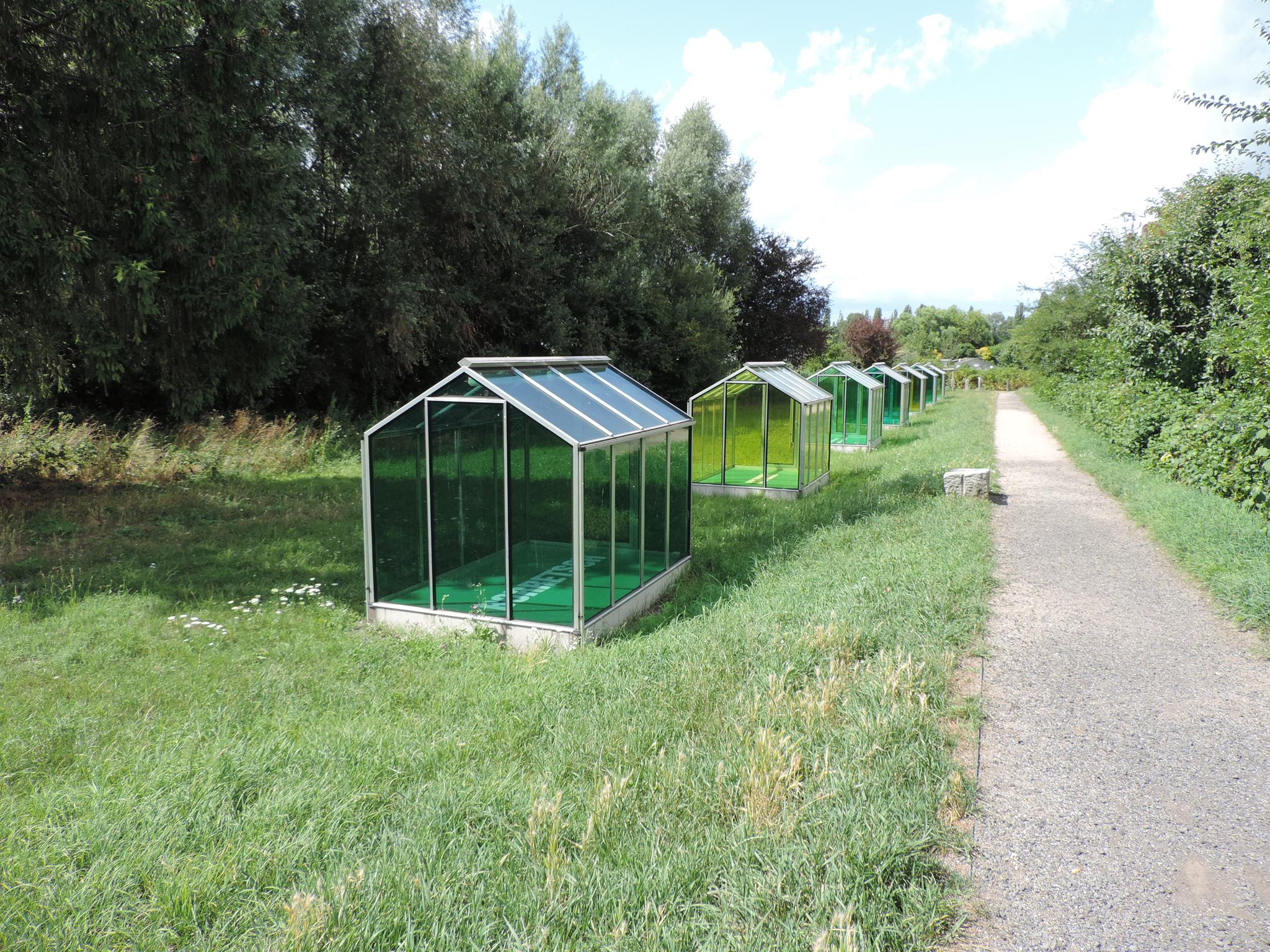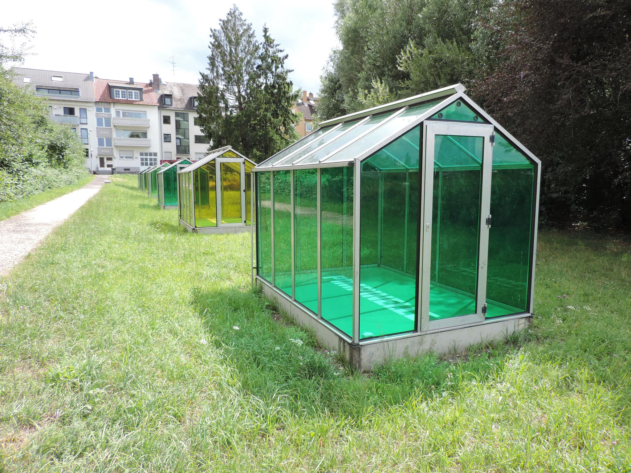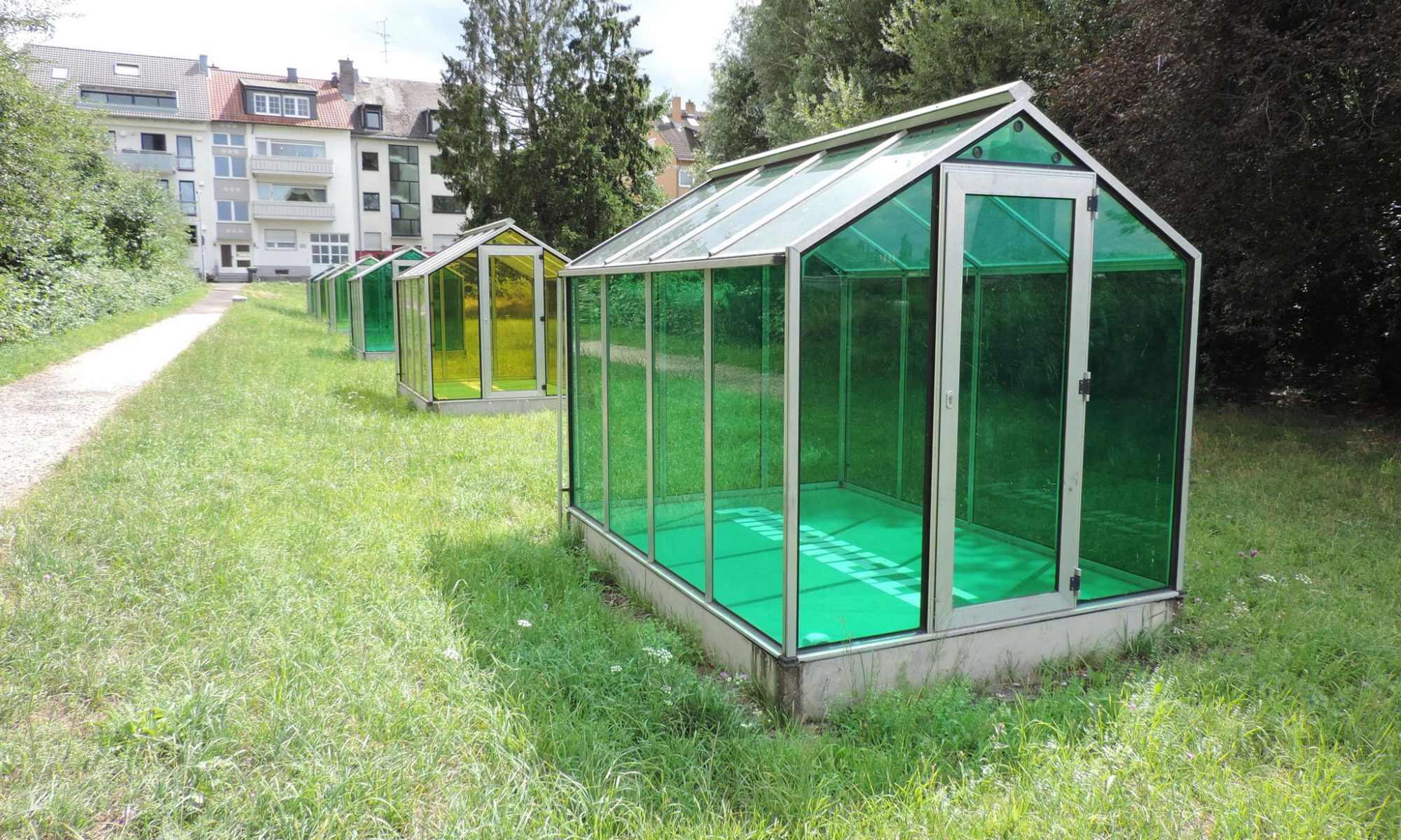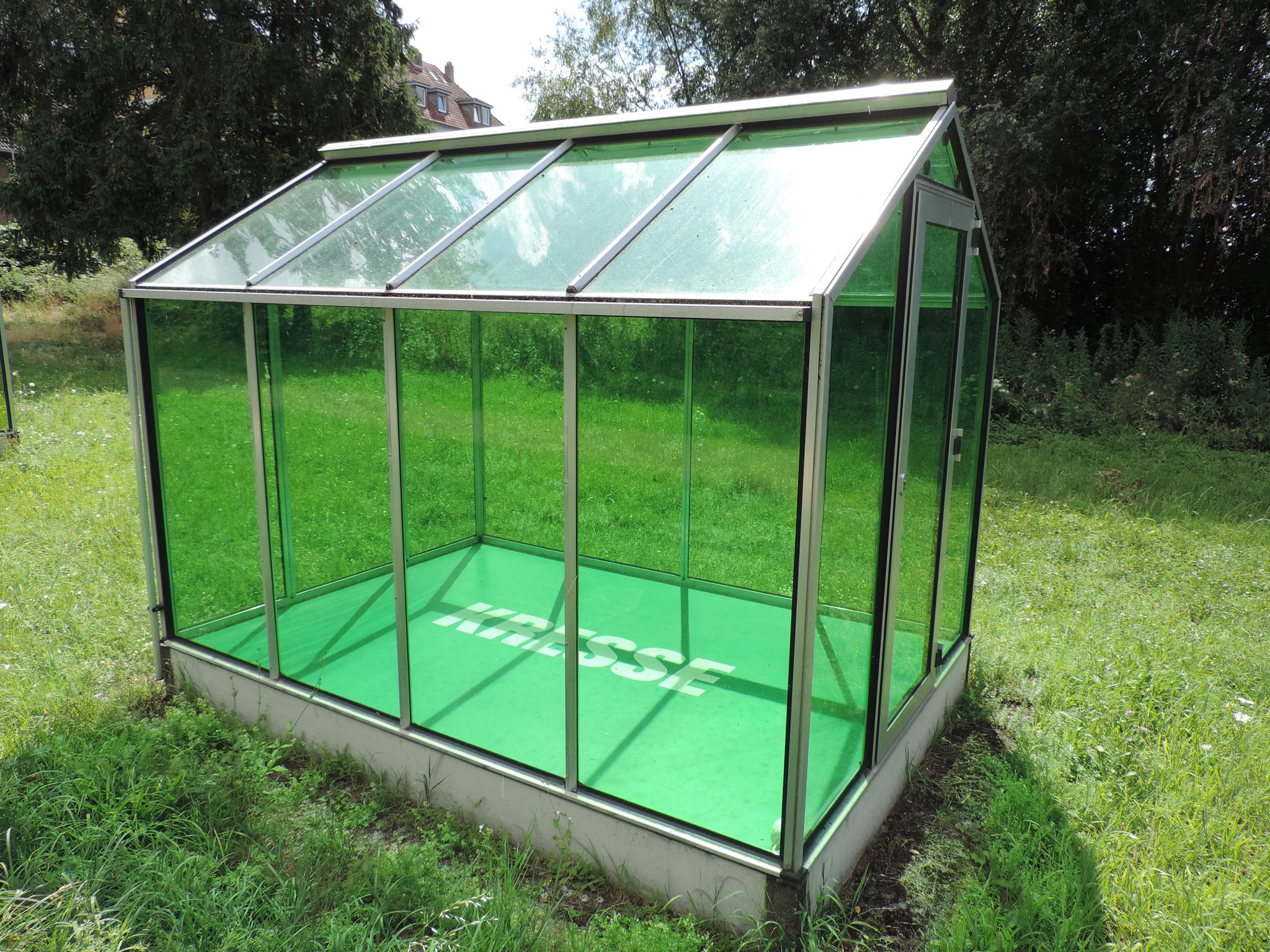 Who doesn’t know the Frankfurt specialty, „Grüne Soße“, or in English „Green Sauce“? It has been memorialized at the place of its origin. The seven herbs that traditionally go into the famous sauce have been grown here in the fields of Oberrad for generations. The design for the monument was created by OLGA SCHULZ. Seven greenhouses in different shades of green stand for the seven herbs of the green sauce: Borretsch, Kerbel, Kresse, Schnittlauch, Sauerampfer, Pimpinelle und Petersilie. In English: Borage, Chervil, Cress, Chives, Sorrel, Burnet and Parsley. Each house honors one herb – filled only with its name. Please also honor the green sauce, do not pick herbs from the fields and do not let your dogs run into the fields!