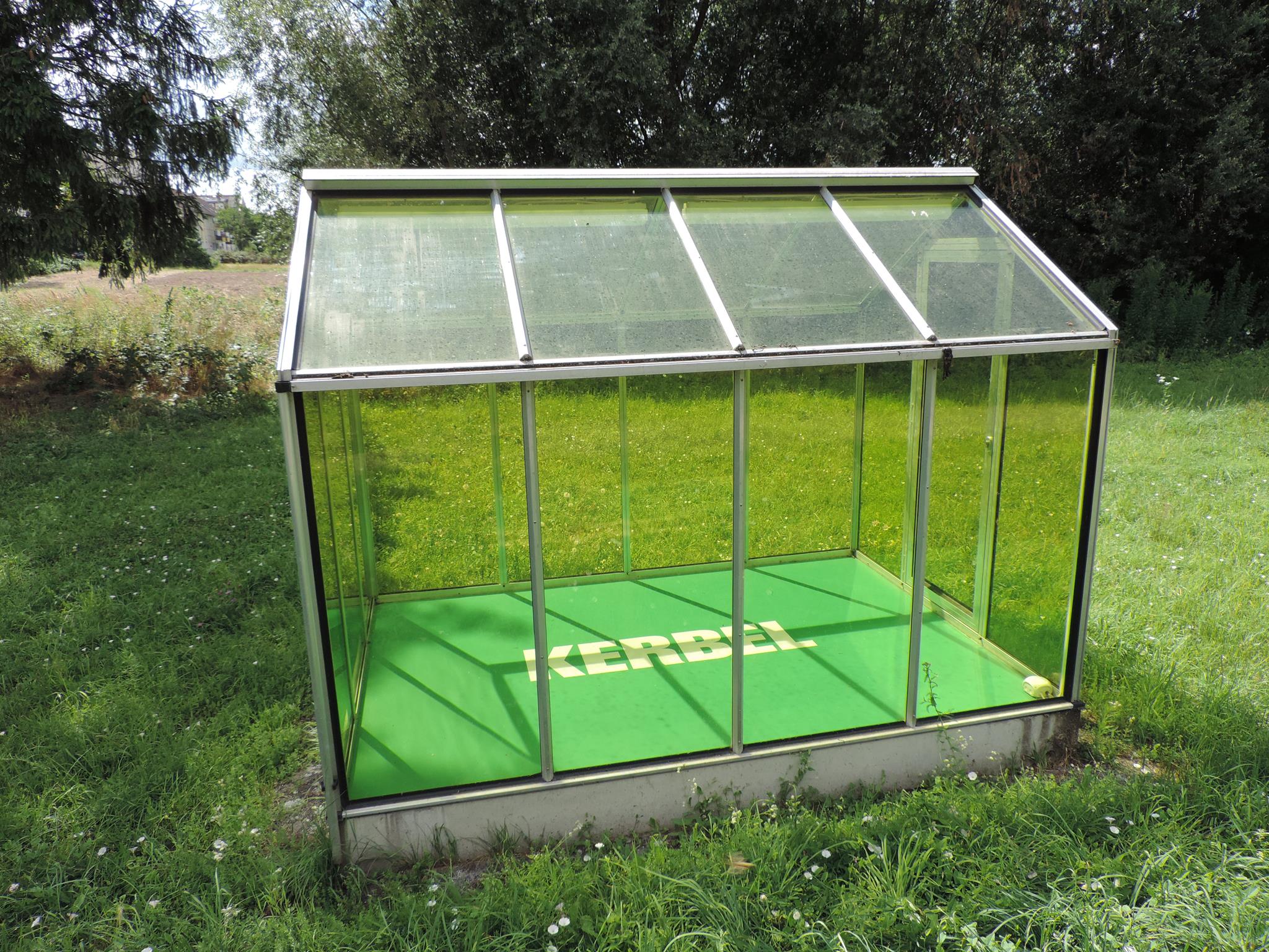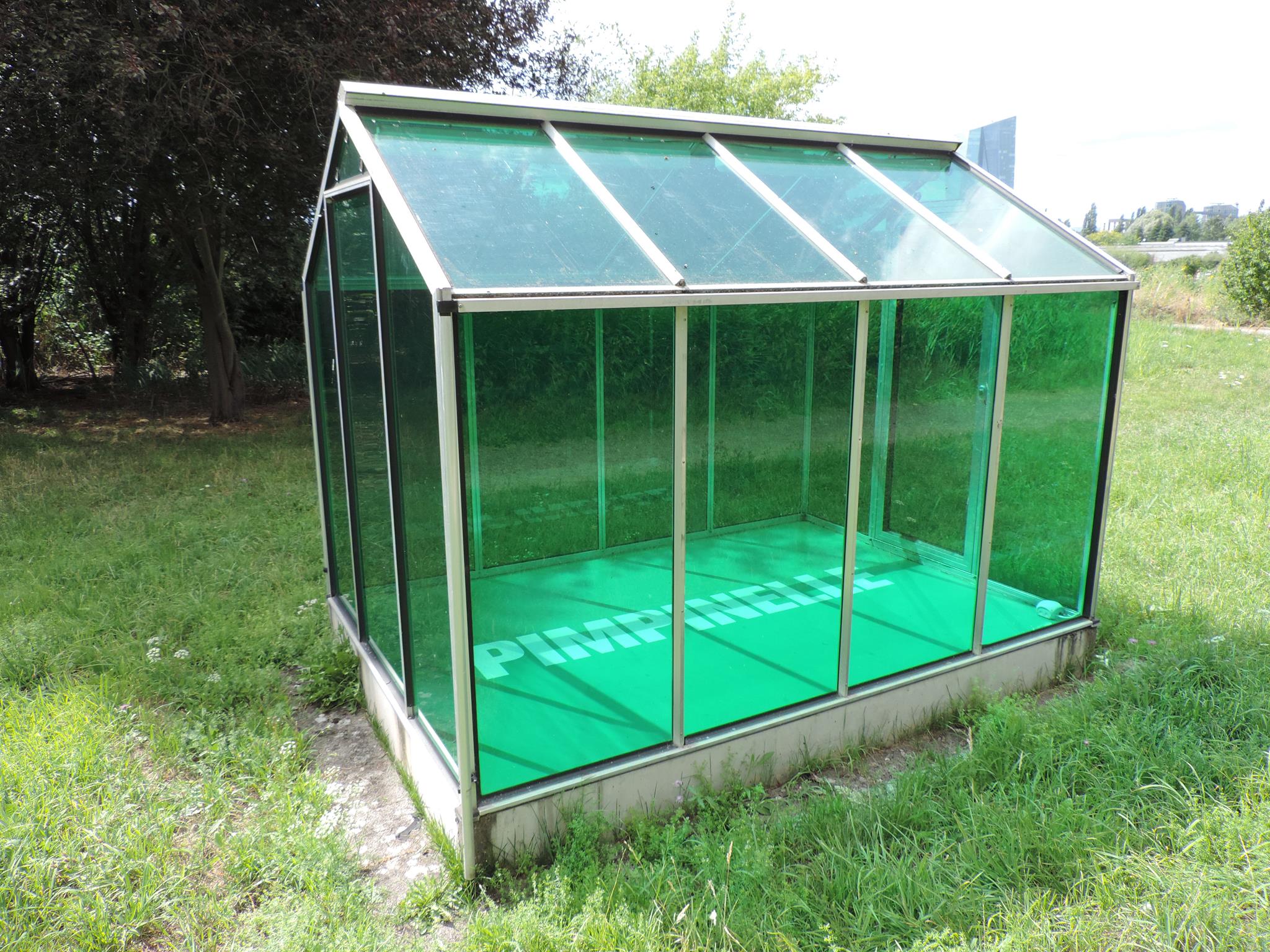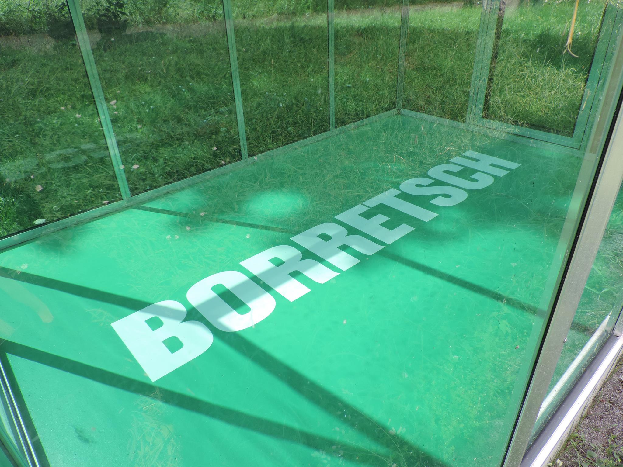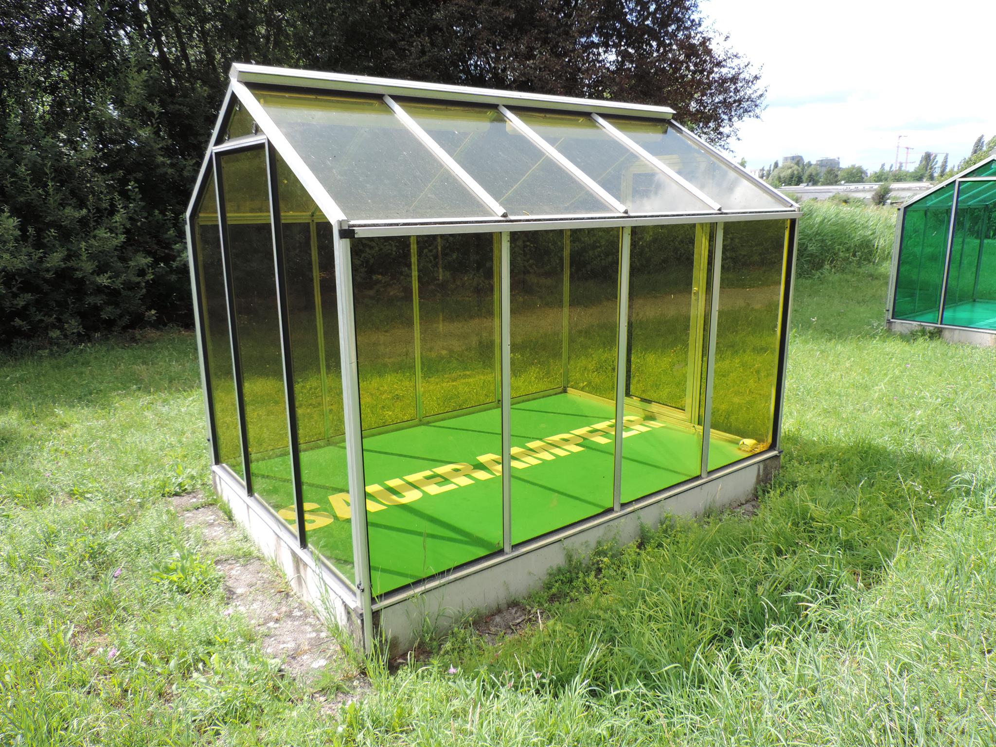 Who doesn’t know the Frankfurt specialty, „Grüne Soße“, or in English „Green Sauce“? It has been memorialized at the place of its origin. The seven herbs that traditionally go into the famous sauce have been grown here in the fields of Oberrad for generations. The design for the monument was created by OLGA SCHULZ. Seven greenhouses in different shades of green stand for the seven herbs of the green sauce: Borretsch, Kerbel, Kresse, Schnittlauch, Sauerampfer, Pimpinelle und Petersilie. In English: Borage, Chervil, Cress, Chives, Sorrel, Burnet and Parsley. Each house honors one herb – filled only with its name. Please also honor the green sauce, do not pick herbs from the fields and do not let your dogs run into the fields!