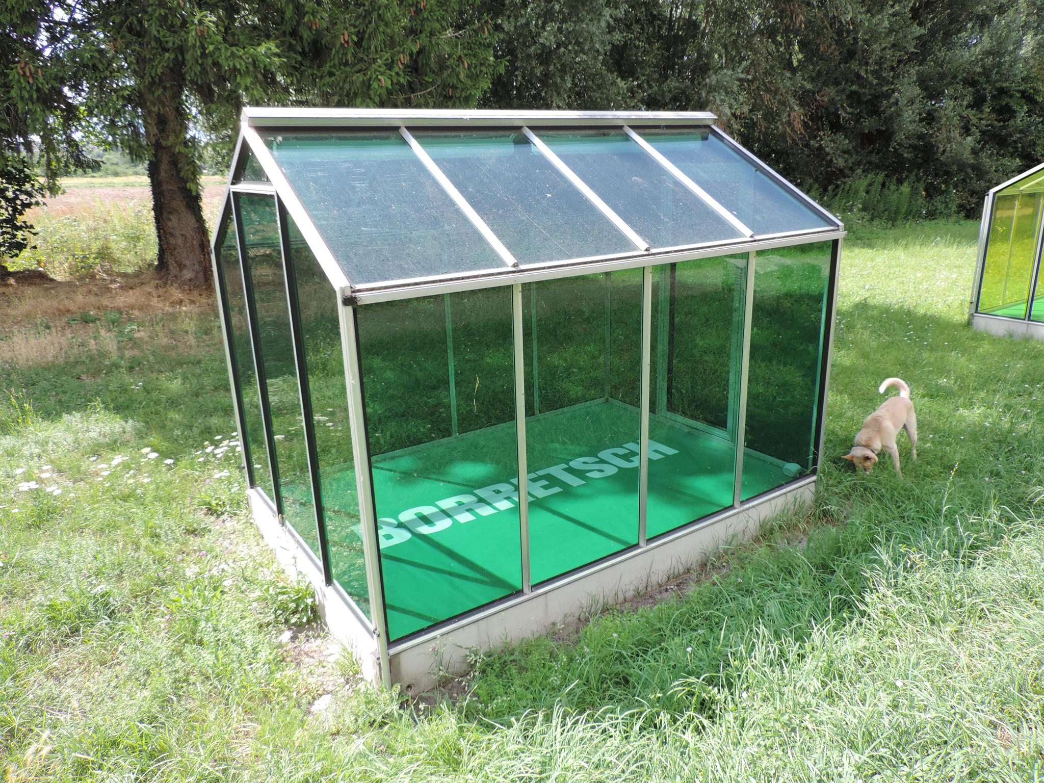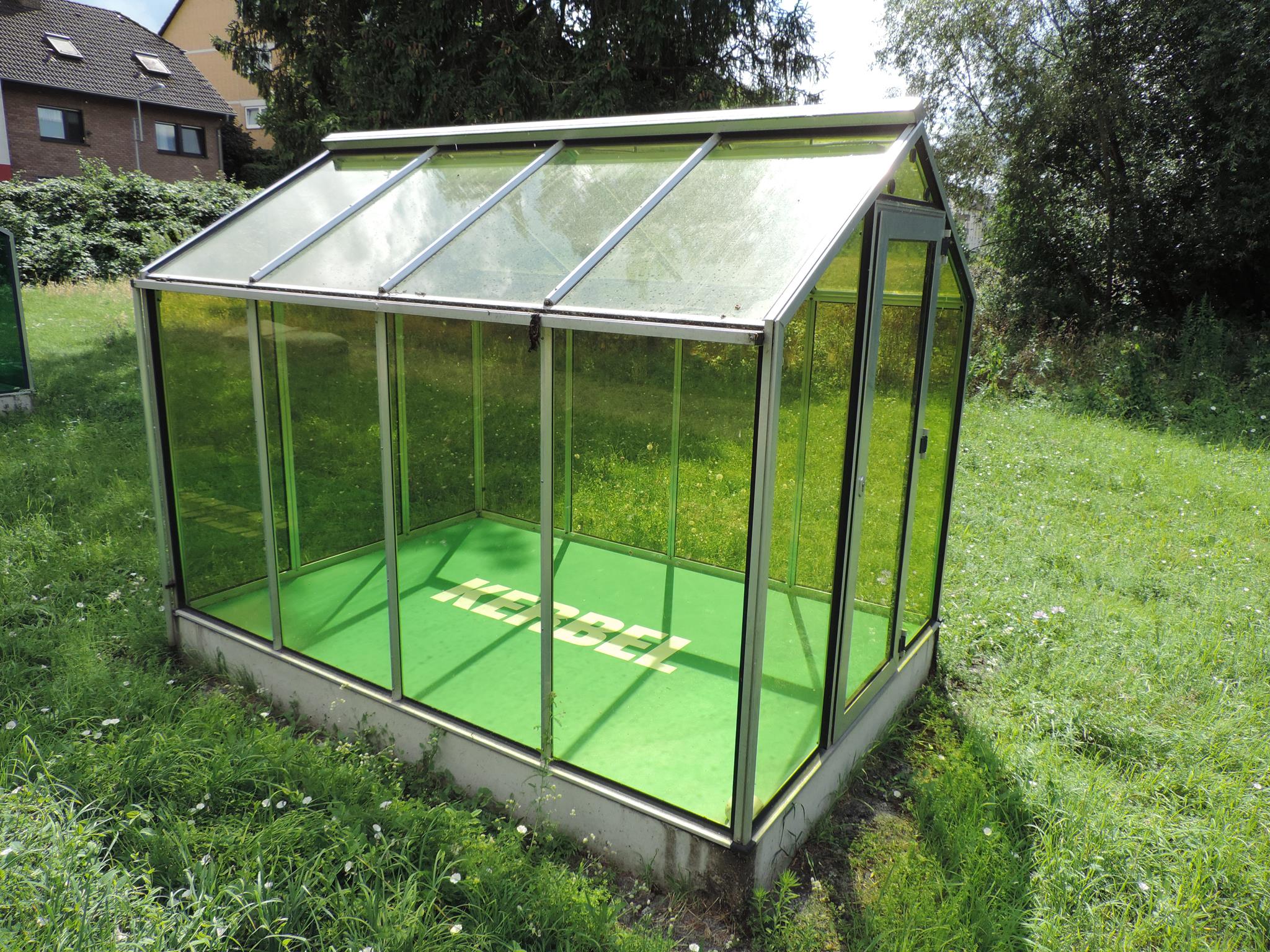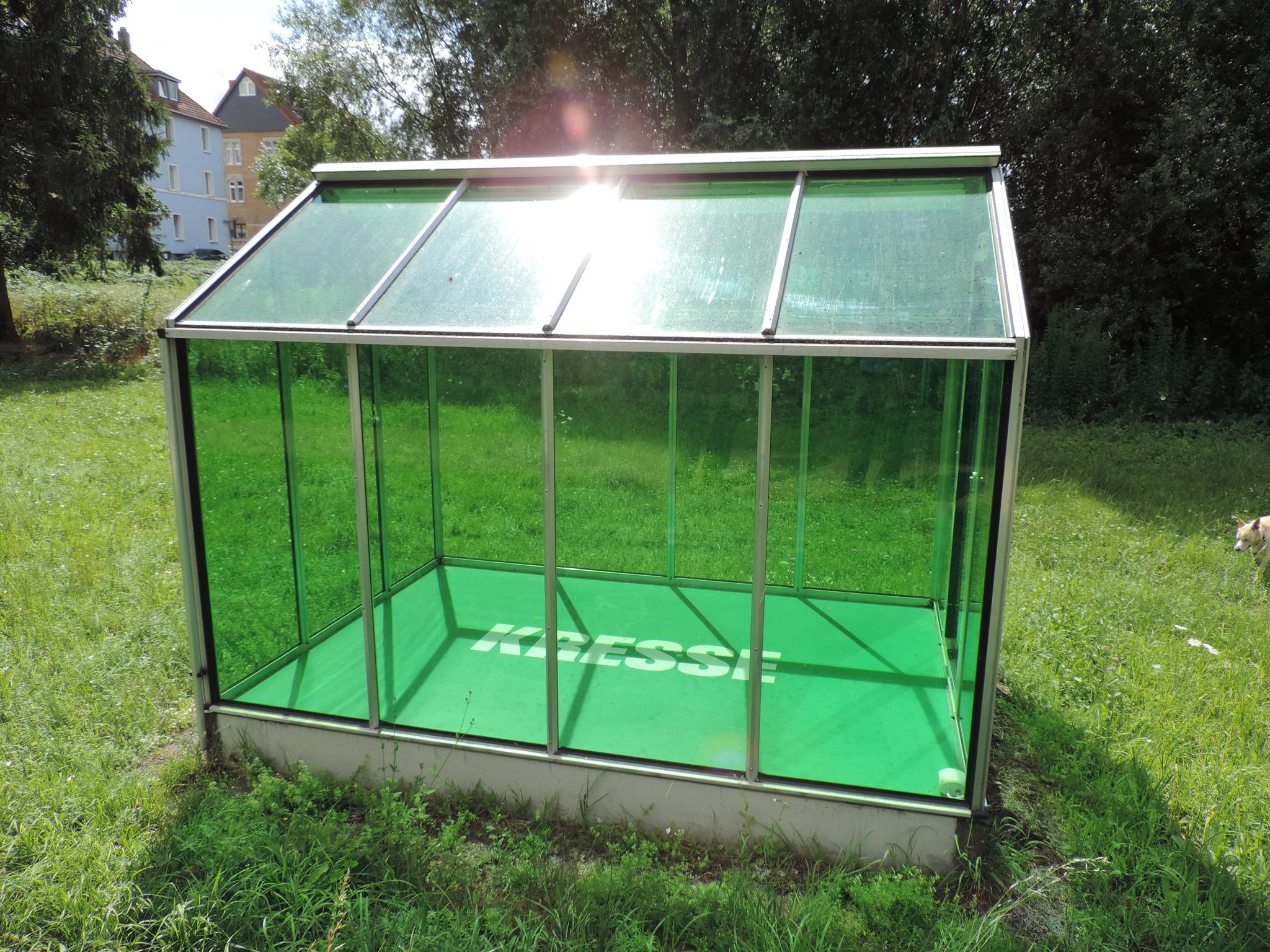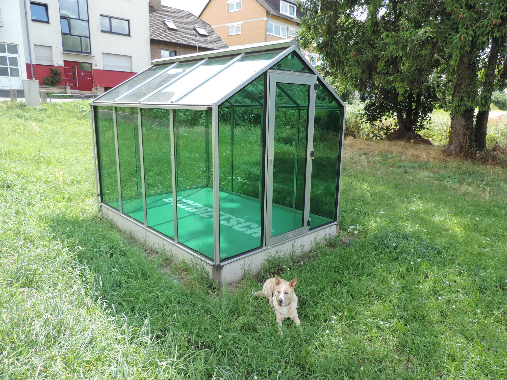 Who doesn’t know the Frankfurt specialty, „Grüne Soße“, or in English „Green Sauce“? It has been memorialized at the place of its origin. The seven herbs that traditionally go into the famous sauce have been grown here in the fields of Oberrad for generations. The design for the monument was created by OLGA SCHULZ. Seven greenhouses in different shades of green stand for the seven herbs of the green sauce: Borretsch, Kerbel, Kresse, Schnittlauch, Sauerampfer, Pimpinelle und Petersilie. In English: Borage, Chervil, Cress, Chives, Sorrel, Burnet and Parsley. Each house honors one herb – filled only with its name. Please also honor the green sauce, do not pick herbs from the fields and do not let your dogs run into the fields!