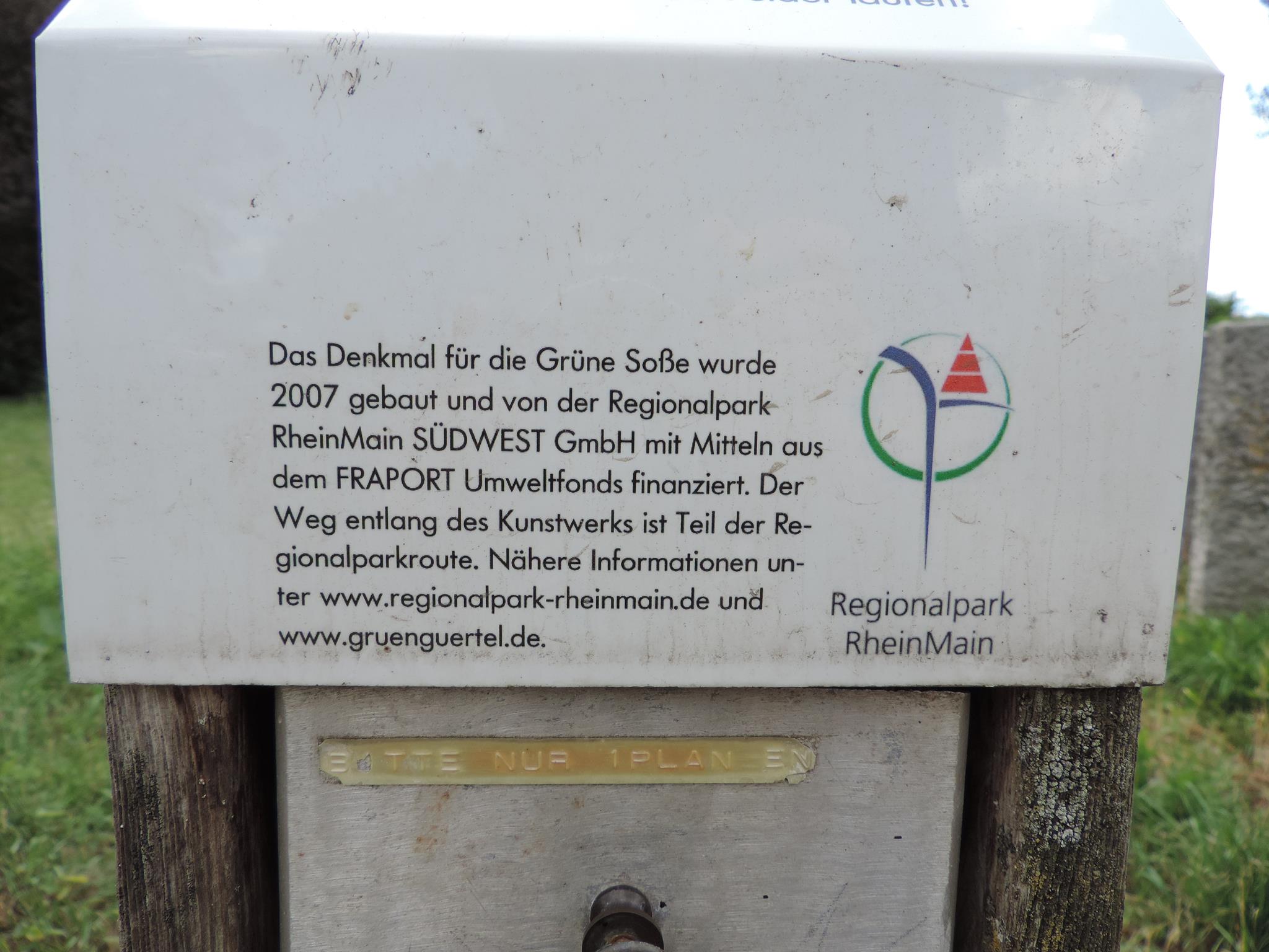 The monument to the Grüne Soße was built in 2007 and financed by Regionalpark RheinMain SÜDWEST GmbH with funds from the FRAPORT Environmental Fund. The path along the artwork is part of the regional park route. Further information can be found at regionalpark-rheinmain.de and gruenguertel.de.