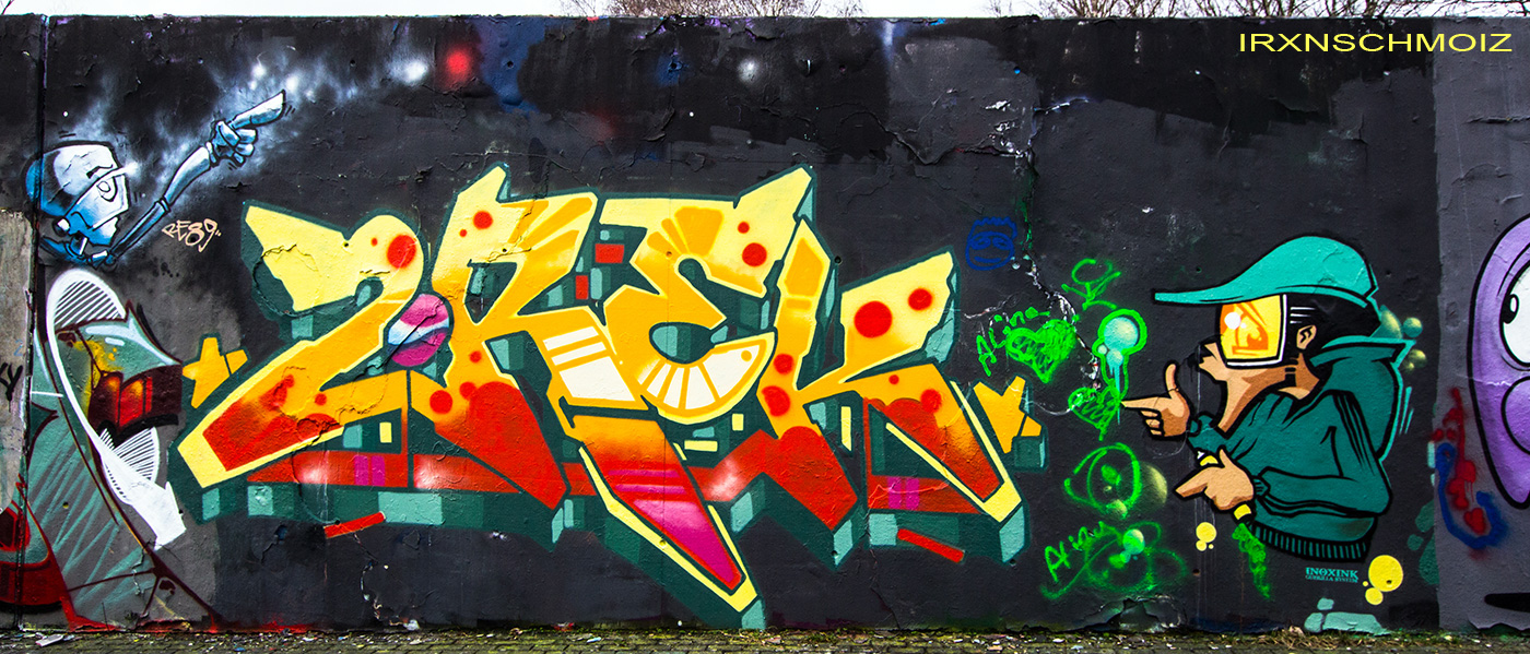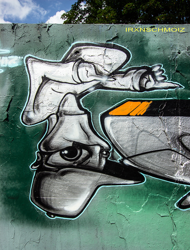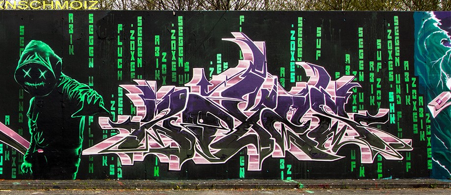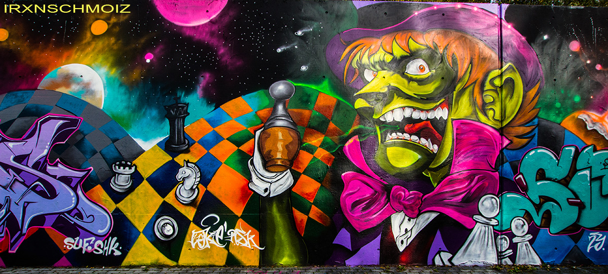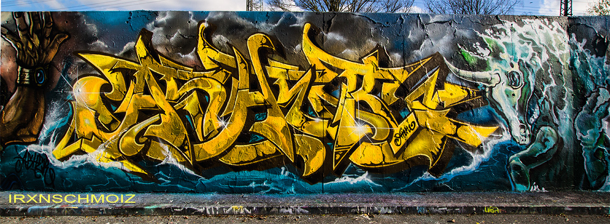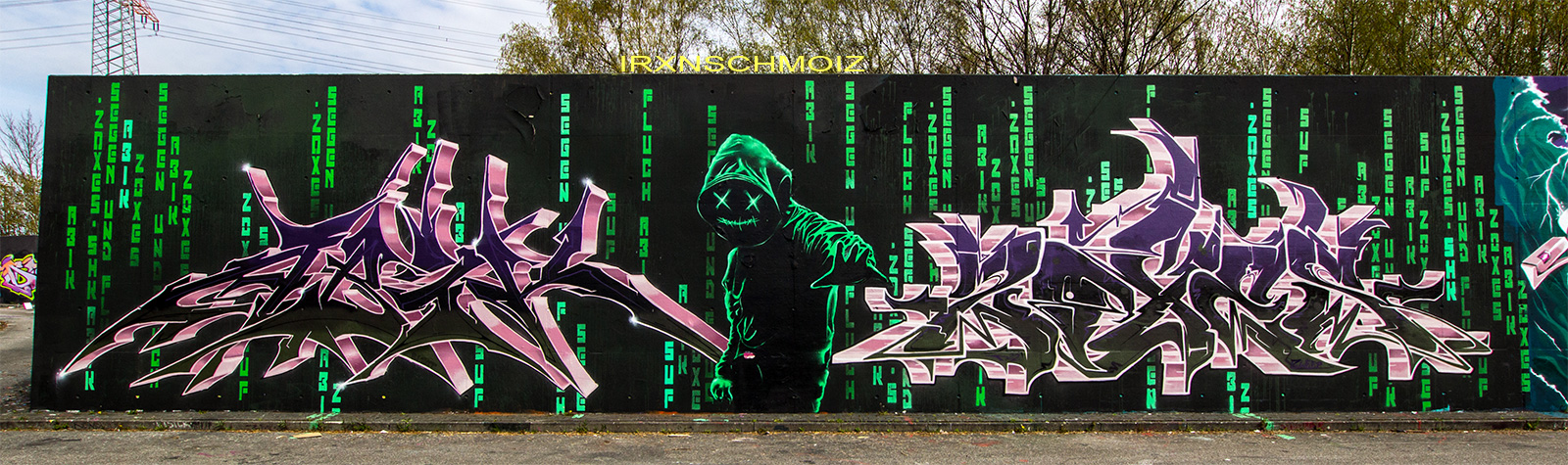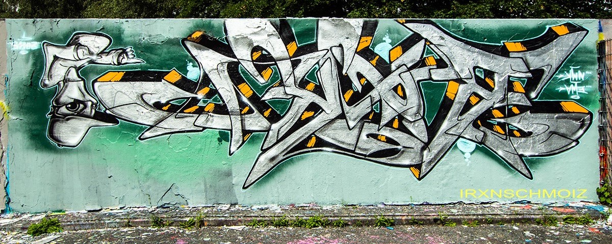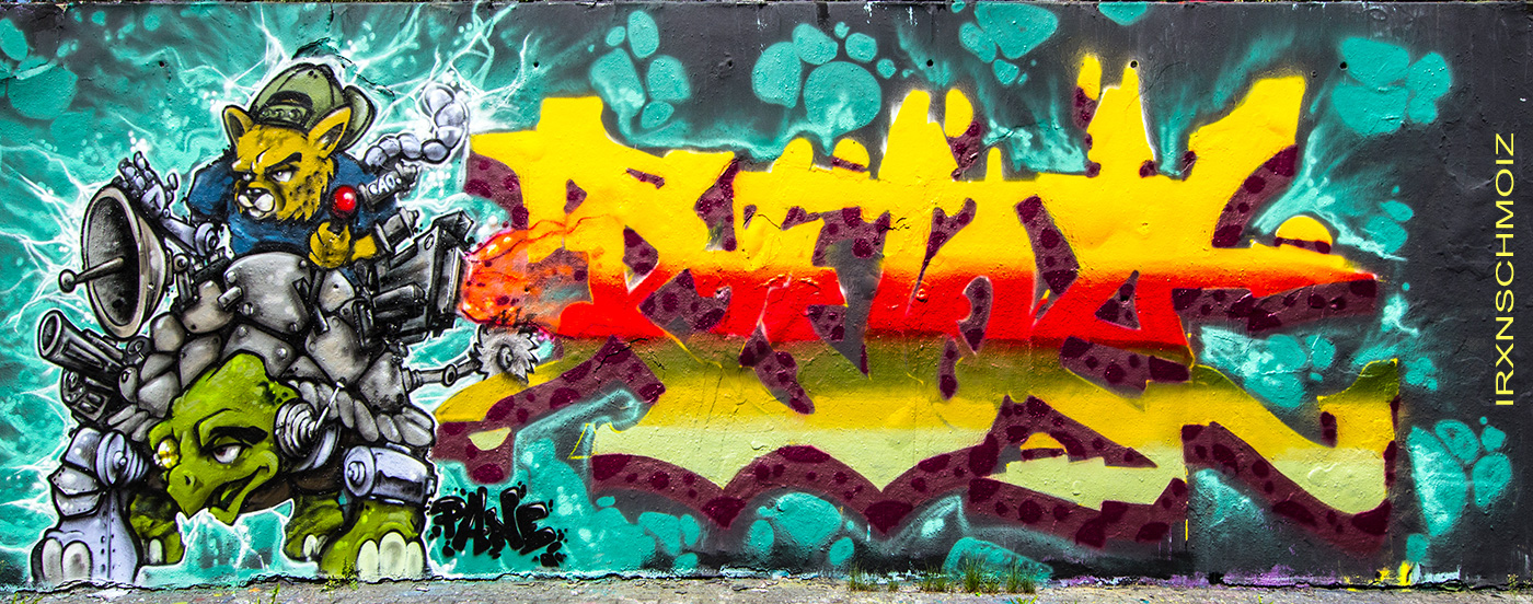Actually you need a permit to paint on the Heimfeld Hall of Fame which you can get via an online formular on the website of the GROSSSTADTRAUM art society. Spray Rules: Painting only with a valid permit – Do not use bitumen under any circumstances  –  Please dispose of waste in the waste garbage cans or take it with you  –  Please leave the garbage cans in place  –  Any changes to the wall, such as drilling, removing or gluing, are prohibited  –  Painting the floor, signs and other surfaces is prohibited  –  Treat each other, the local residents and nature with respect  –  Always paint over a picture or concept completely if possible  –  The wall is for everyone! Choose your area with consideration for others  –  Beginners should practise on the inner, small wall by the sloping dyke  –  Grosstadtraum e.V.