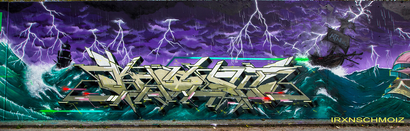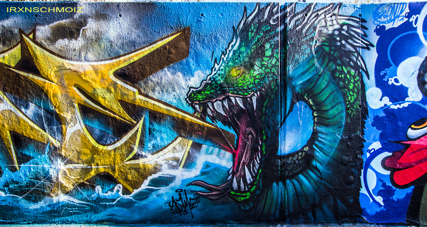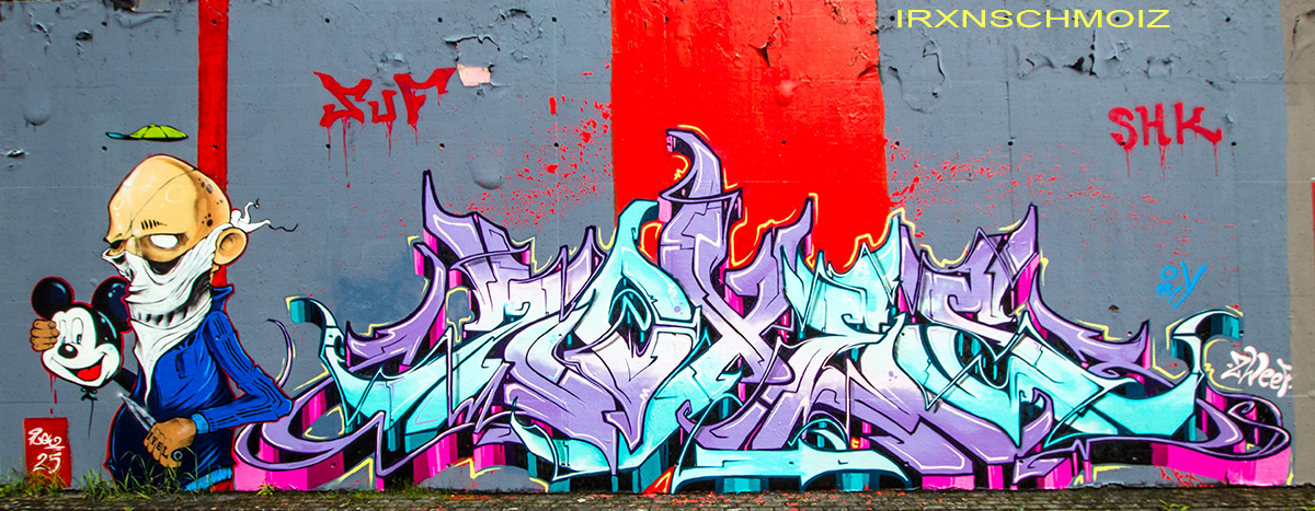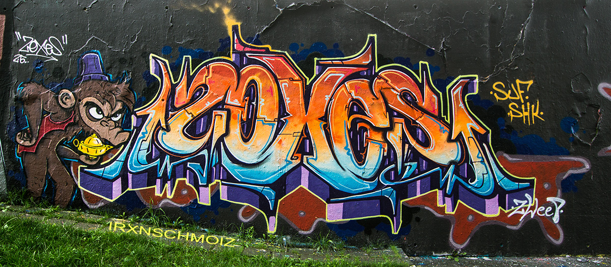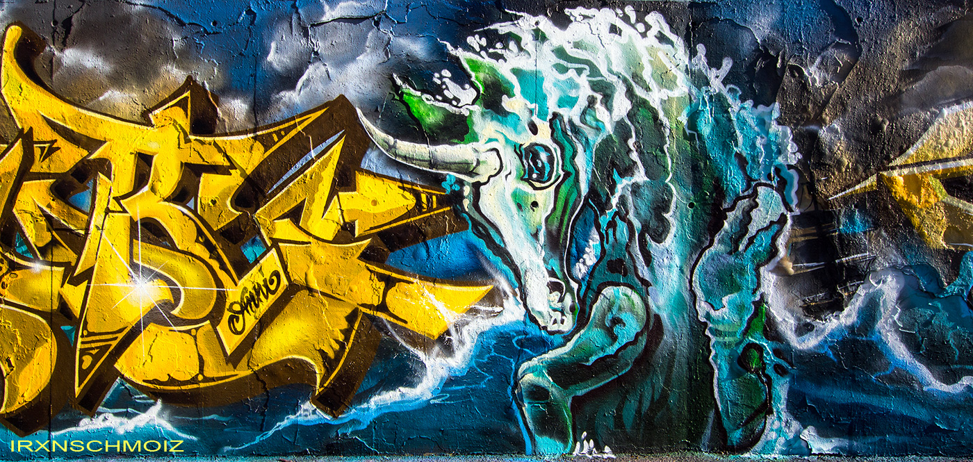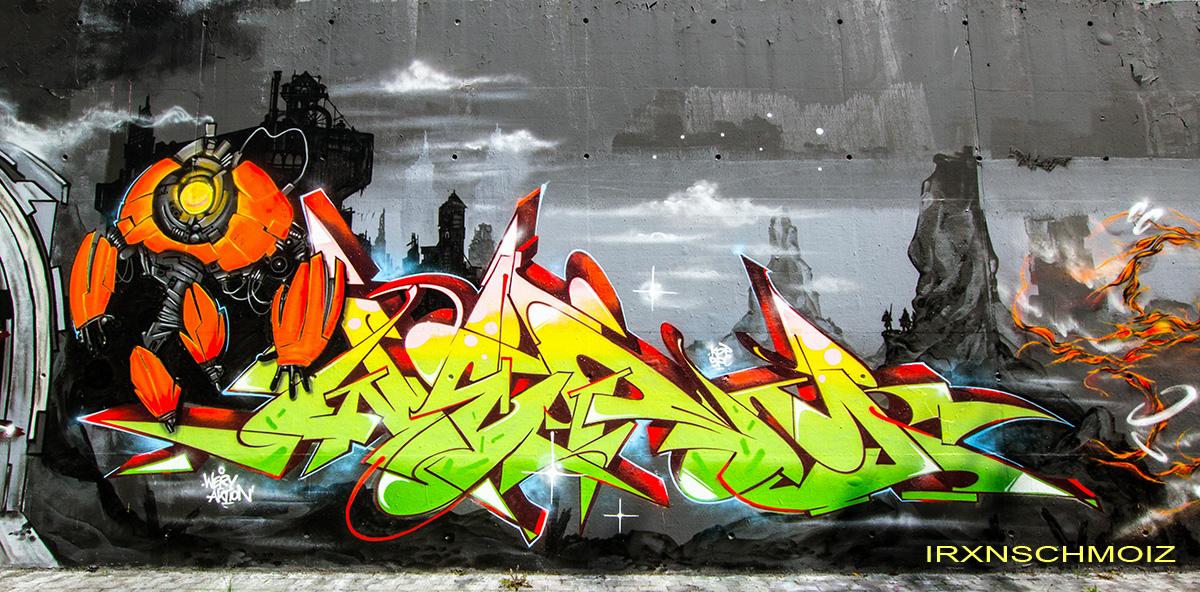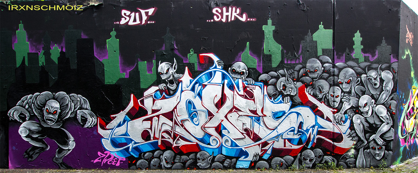 Actually you need a permit to paint on the Heimfeld Hall of Fame which you can get via an online formular on the website of the GROSSSTADTRAUM art society. Spray Rules: Painting only with a valid permit – Do not use bitumen under any circumstances  –  Please dispose of waste in the waste garbage cans or take it with you  –  Please leave the garbage cans in place  –  Any changes to the wall, such as drilling, removing or gluing, are prohibited  –  Painting the floor, signs and other surfaces is prohibited  –  Treat each other, the local residents and nature with respect  –  Always paint over a picture or concept completely if possible  –  The wall is for everyone! Choose your area with consideration for others  –  Beginners should practise on the inner, small wall by the sloping dyke  –  Grosstadtraum e.V.