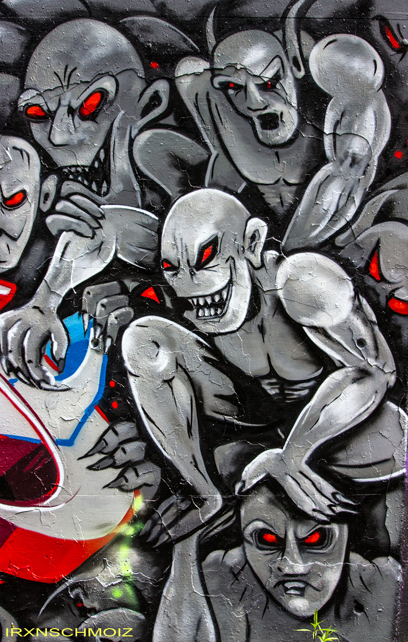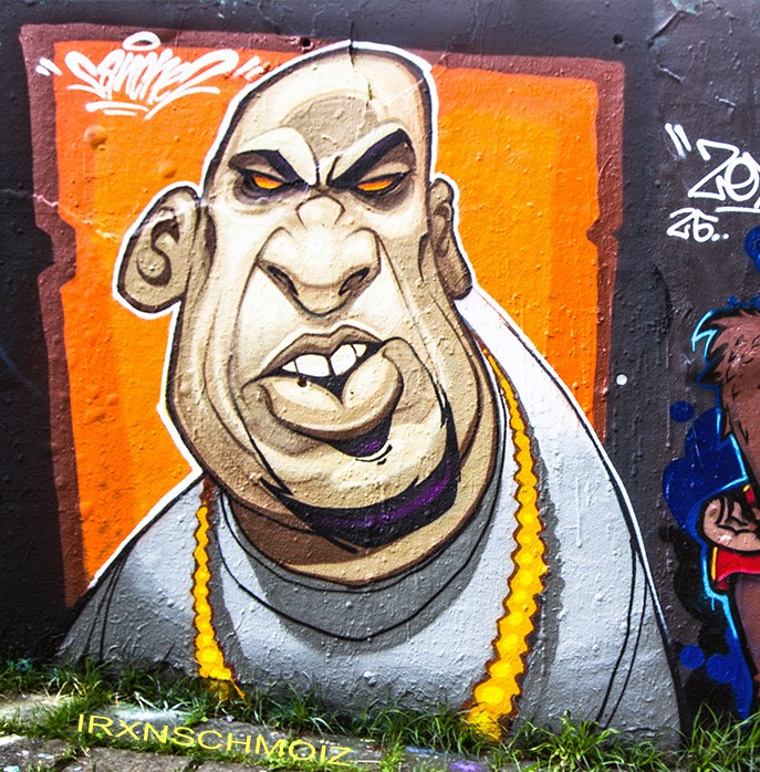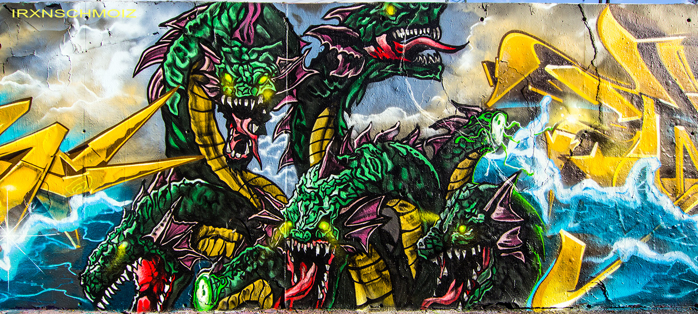 On this page are the photos of the South Side of the Eastern Section. The flood protection wall is around 255 meter long from (53.46984, 9.96960) to (53.46913, 9.97258). The south side can be divided into (a) the arched area from (53.46984, 9.96960) to (53.46946, 9.97085), where advanced writers and some kings work; (b) an elongated wall from (53.46946, 9.97085) to (53.46894, 9.97211), which is probably withheld from Kings with their masterpieces; (c) a dyke section from (53.46894, 9.97211) to (53.46914, 9.97258), which lies qualitatively between (4a) and (3). The wall parts (3) and (4) together form the actual “Heimfeld-Hall” – probably the largest legal and most significant hall in northern Germany. In the following are the urban artworks in chronological order only from the walls facing South. Check out as well the artworks on the East Wall North, West Wall North, West Wall South and the huge artists archive on the Heimfeld Hall Main Page.