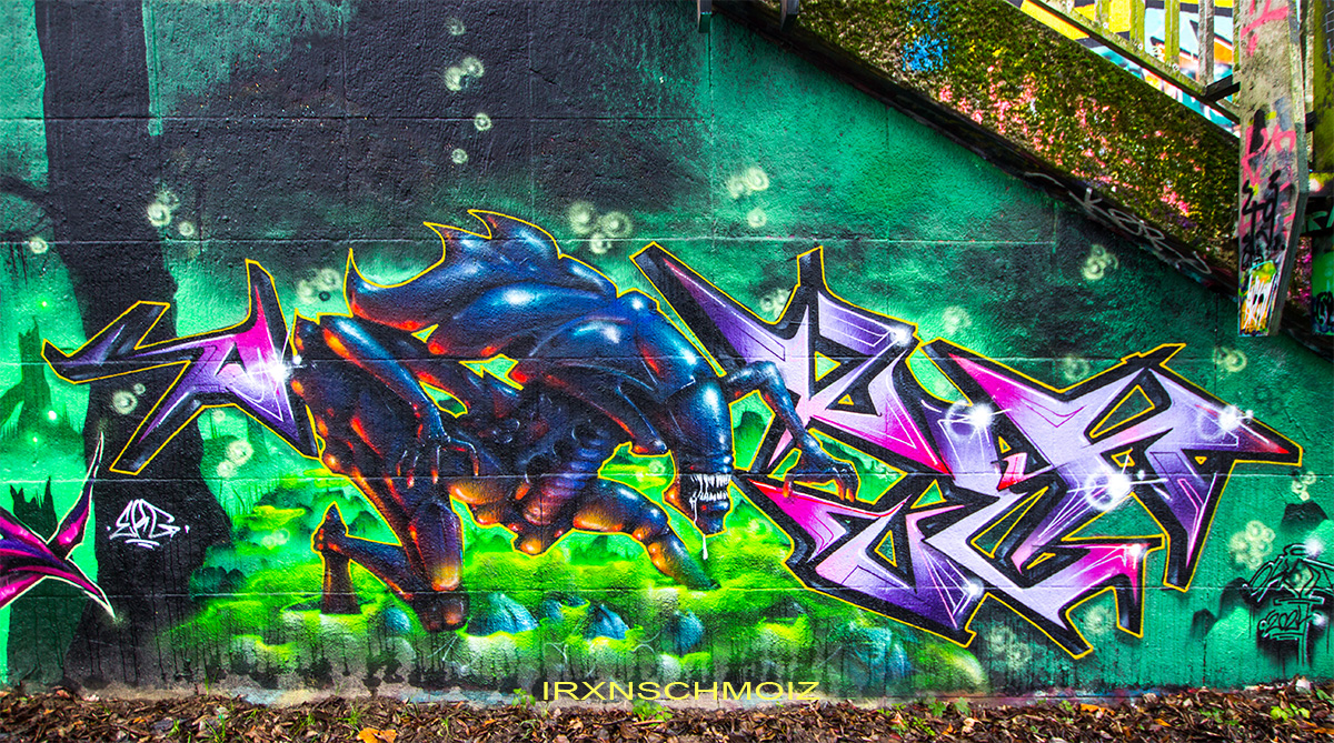 This concept collaboration wall in „Alien vs Predator“ theme was created by ZETUR, SOBER and OKULT. The graffiti above on the right is from TUMS and the graffti parts on the upper left are some remnants of the URBAN NATURE festival in 2024 with the title „Galaktische Zeit“, which means in English „Galactic Time“.