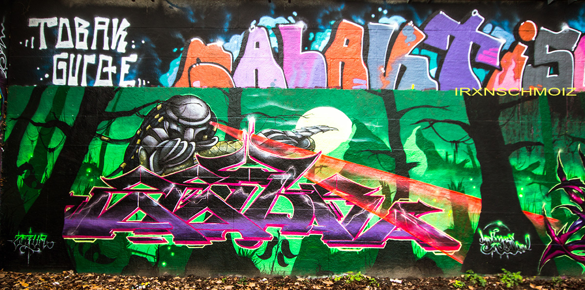 This concept collaboration wall in „Alien vs Predator“ theme was created by ZETUR, SOBER and OKULT. The graffiti above on the right is from TUMS and the graffti parts on the upper left are some remnants of the URBAN NATURE festival in 2024 with the title „Galaktische Zeit“, which means in English „Galactic Time“.