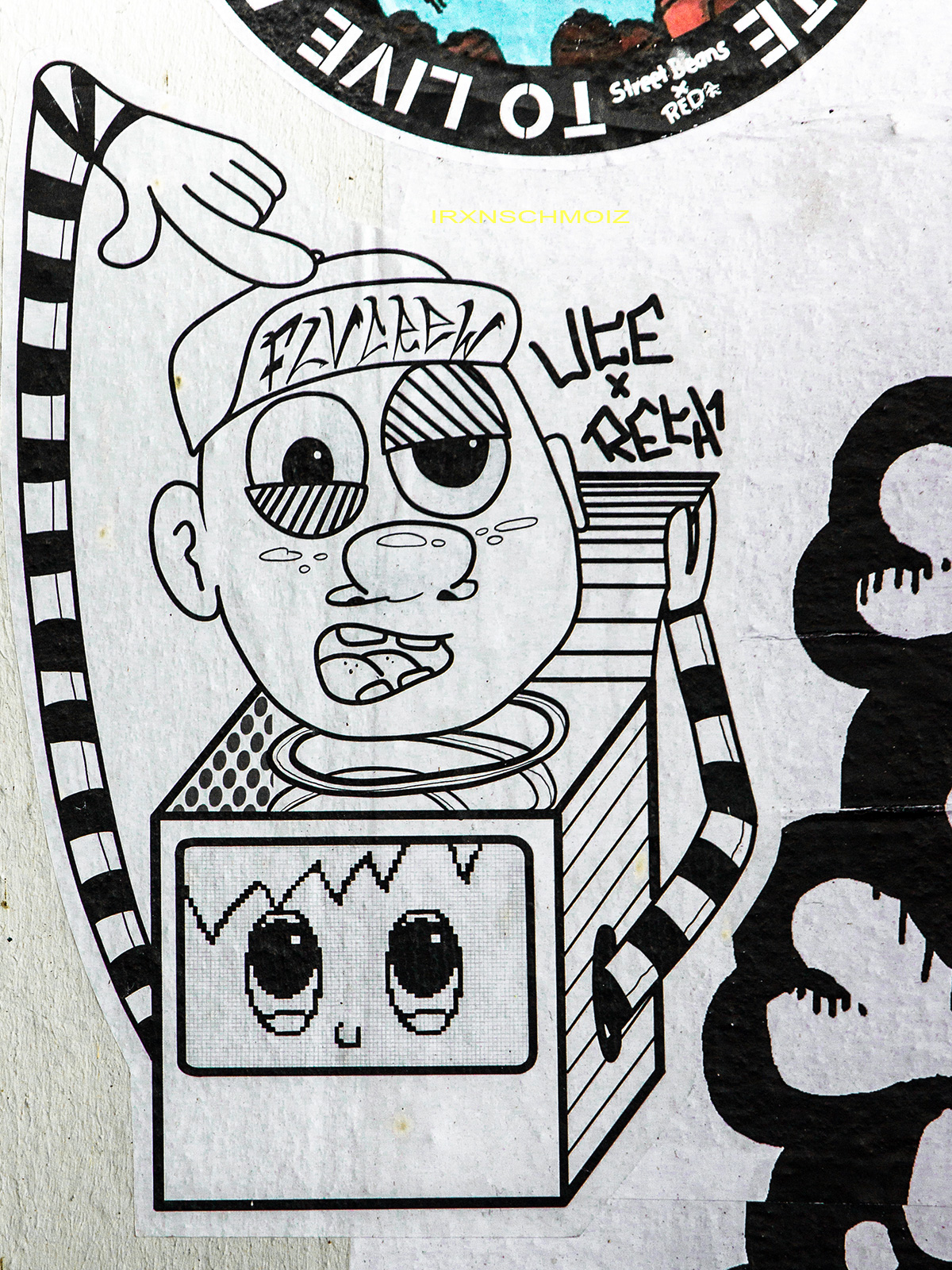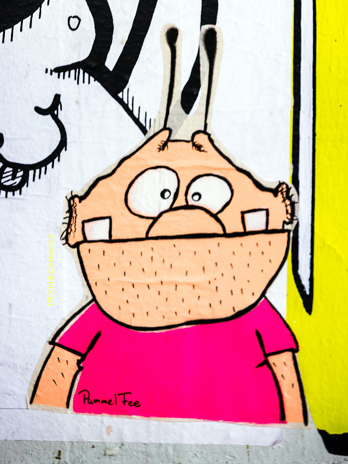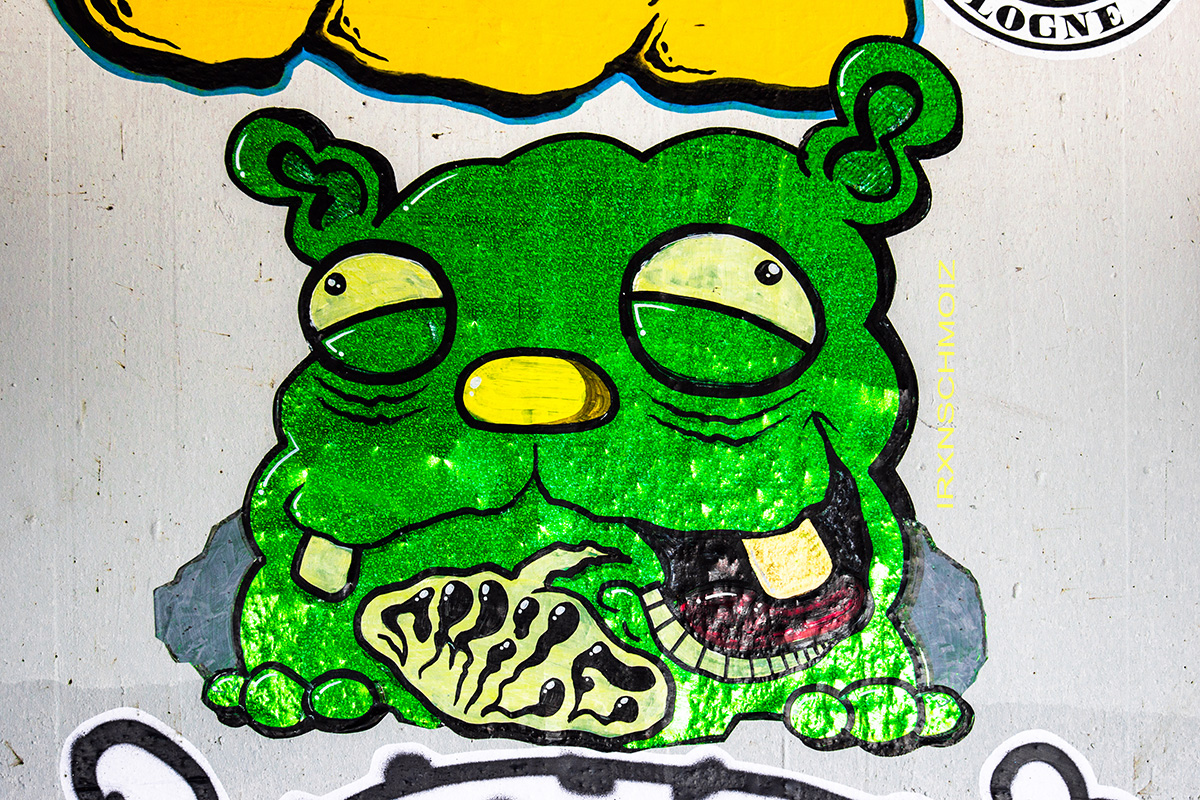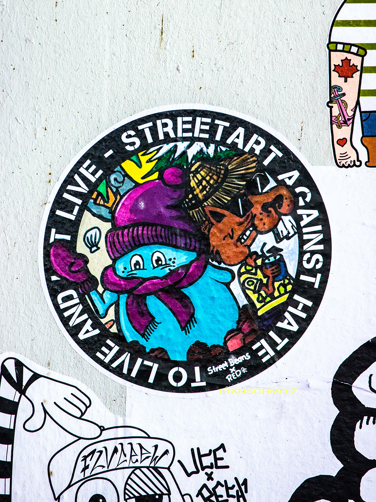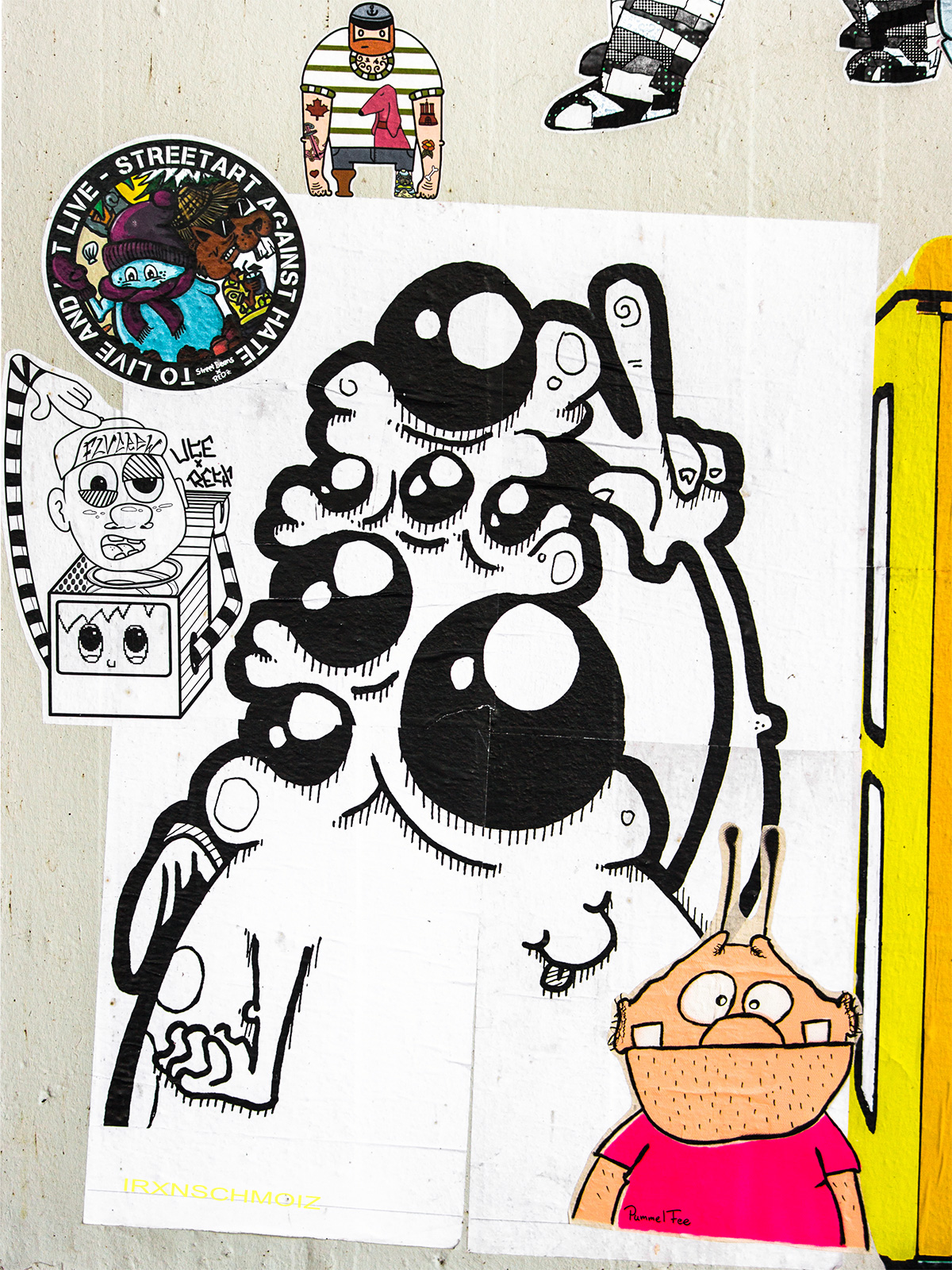 During the great URBAN NATURE festival in 2023 there were also separate panels for paste up and sticker artworks. Three colorful walls with numerous works were created. This campaign was organized by the artists SMILE, TUMA and STREETBEANS, to whom other artists could send works. The panels were then covered with the many great submissions on a sticking day and of course with their own creations. We have broken down the collages into individual works, here are the pieces from the third panel. Take also a look at Panel (1) and Panel (2) just around the corner.