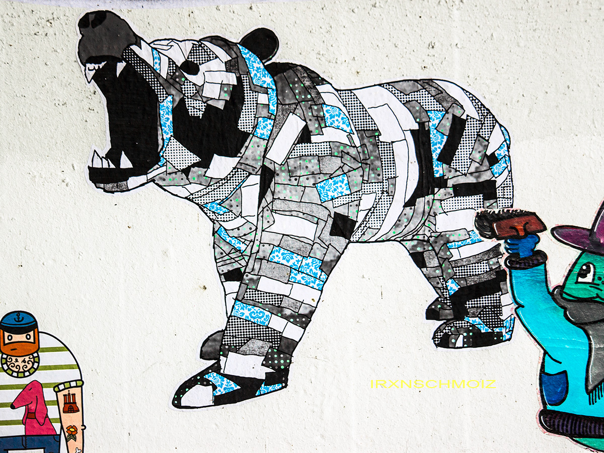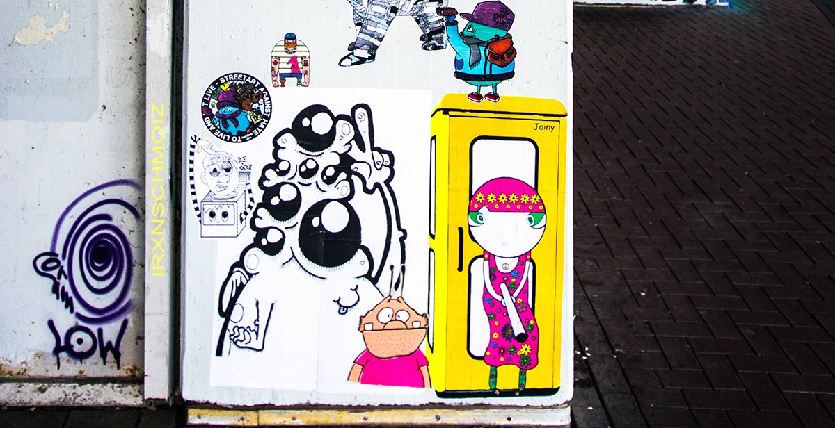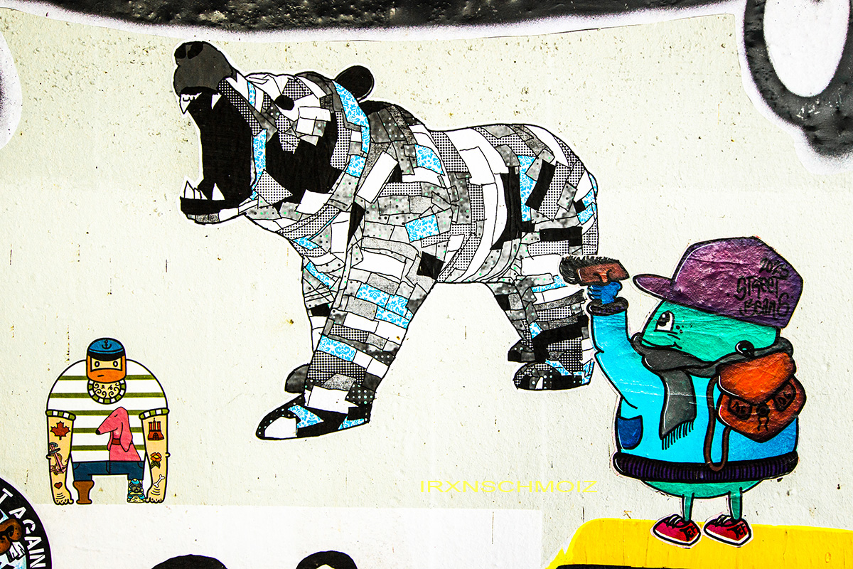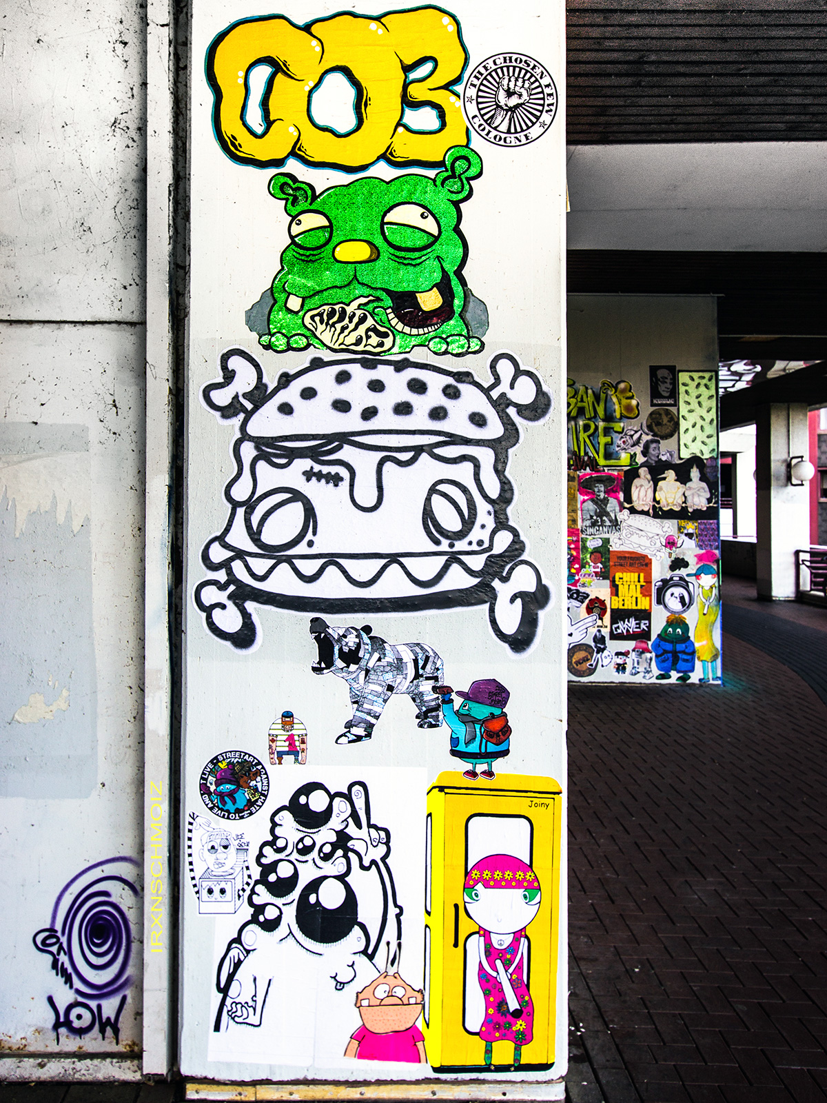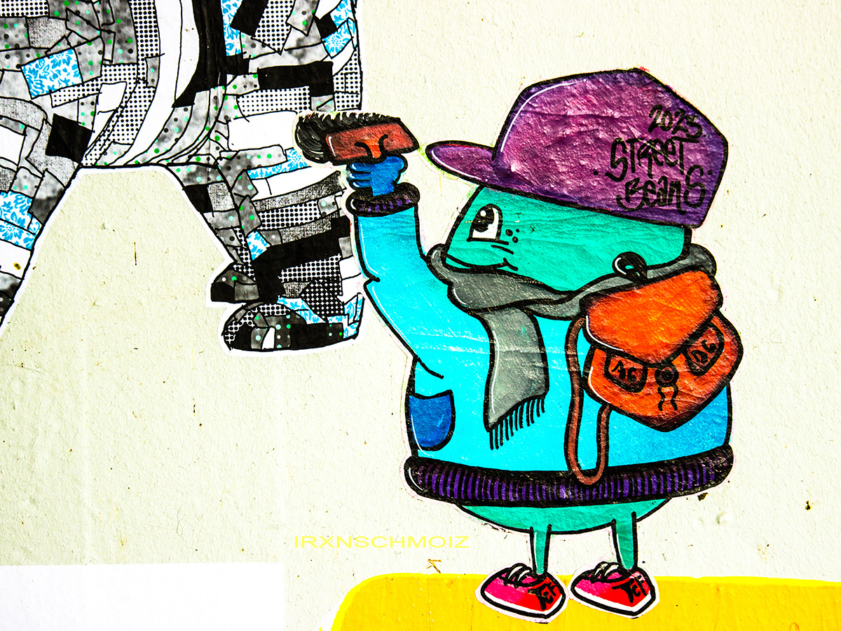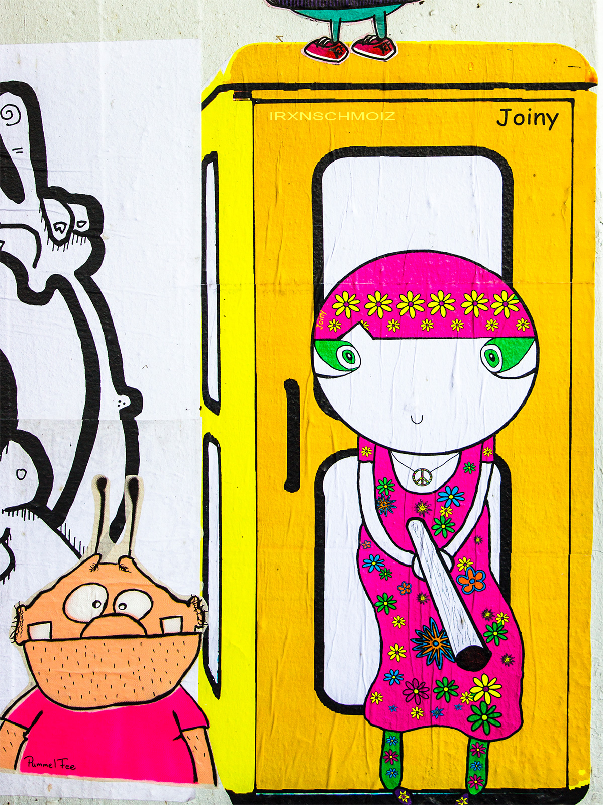 During the great URBAN NATURE festival in 2023 there were also separate panels for paste up and sticker artworks. Three colorful walls with numerous works were created. This campaign was organized by the artists SMILE, TUMA and STREETBEANS, to whom other artists could send works. The panels were then covered with the many great submissions on a sticking day and of course with their own creations. We have broken down the collages into individual works, here are the pieces from the third panel. Take also a look at Panel (1) and Panel (2) just around the corner.