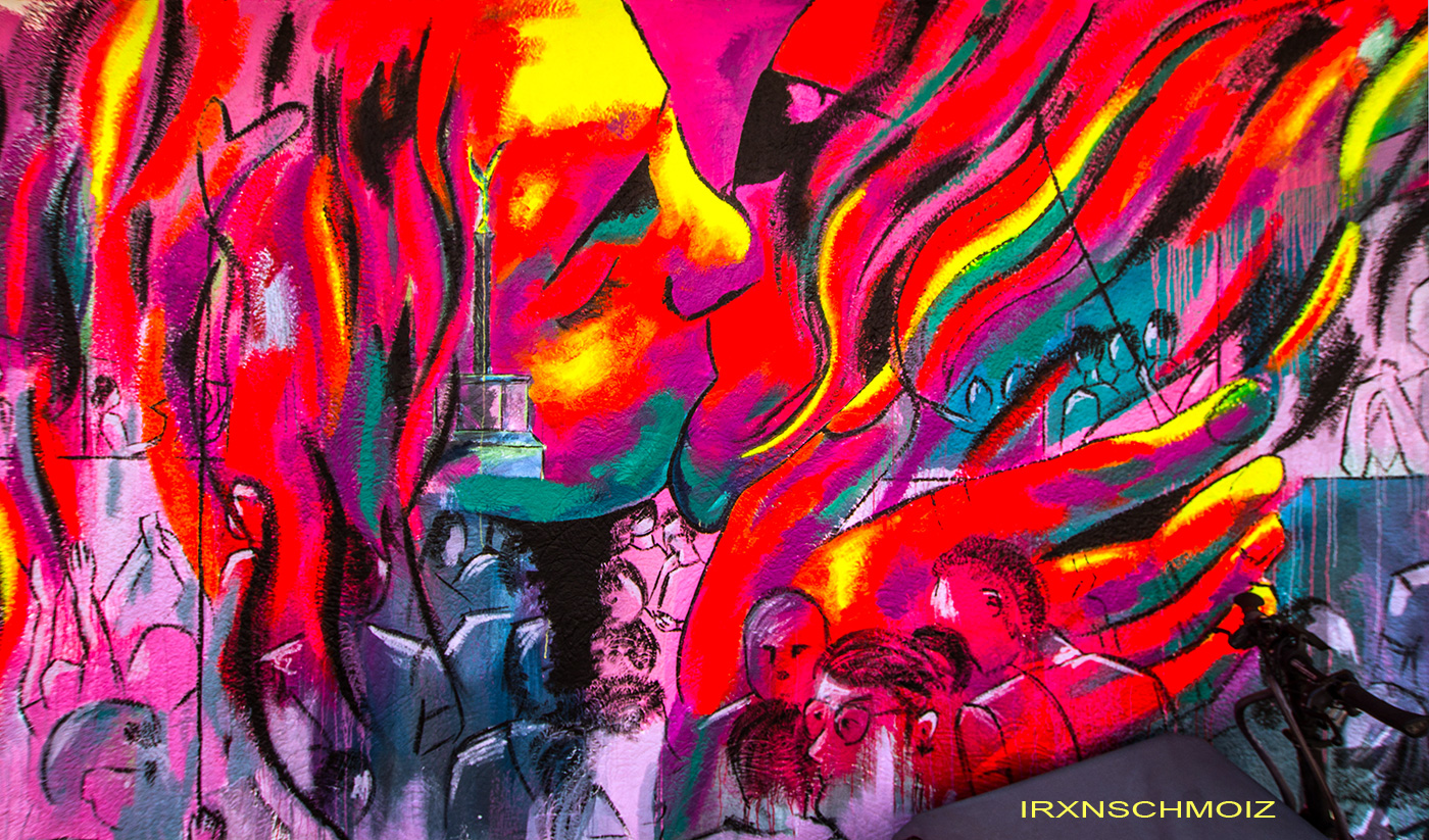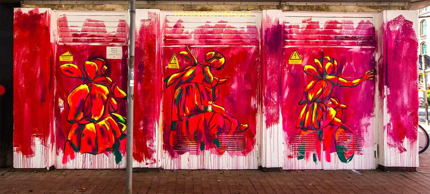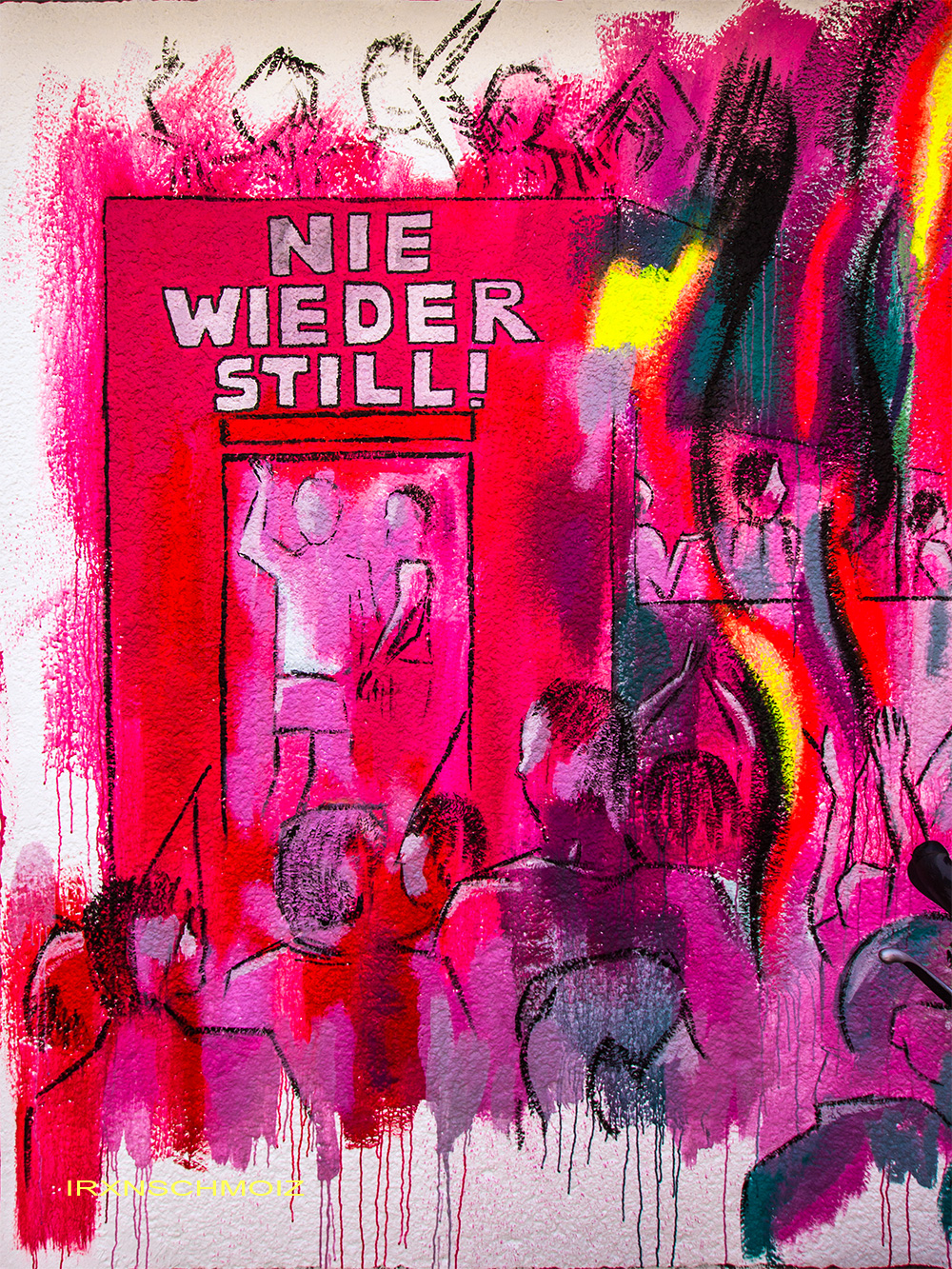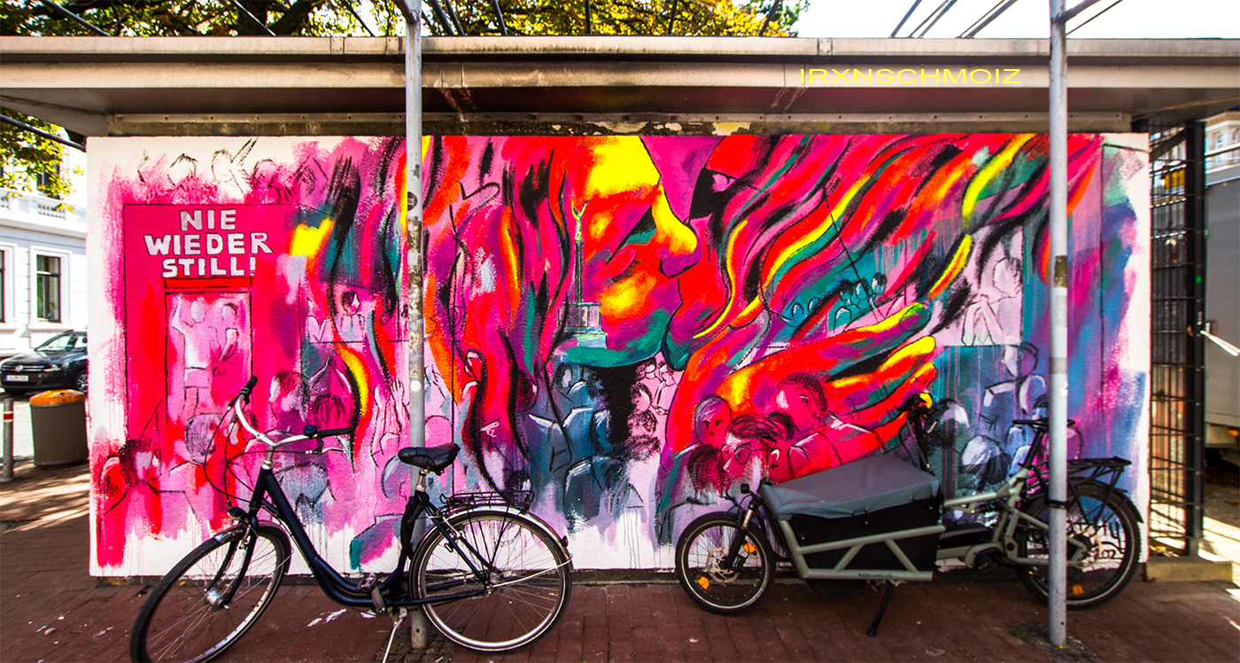 This electro transformer station at Weißekreuzplatz was designed by Hamburg artist KIM PHOEBE for the festival edition in 2025. The work’s theme was „Tolerance. Solidarity. Love. Togetherness“. The phrase „Nie wieder still!“ means „Never silent again!“ in English. This project is a collaboration with the local energy provider enercity.