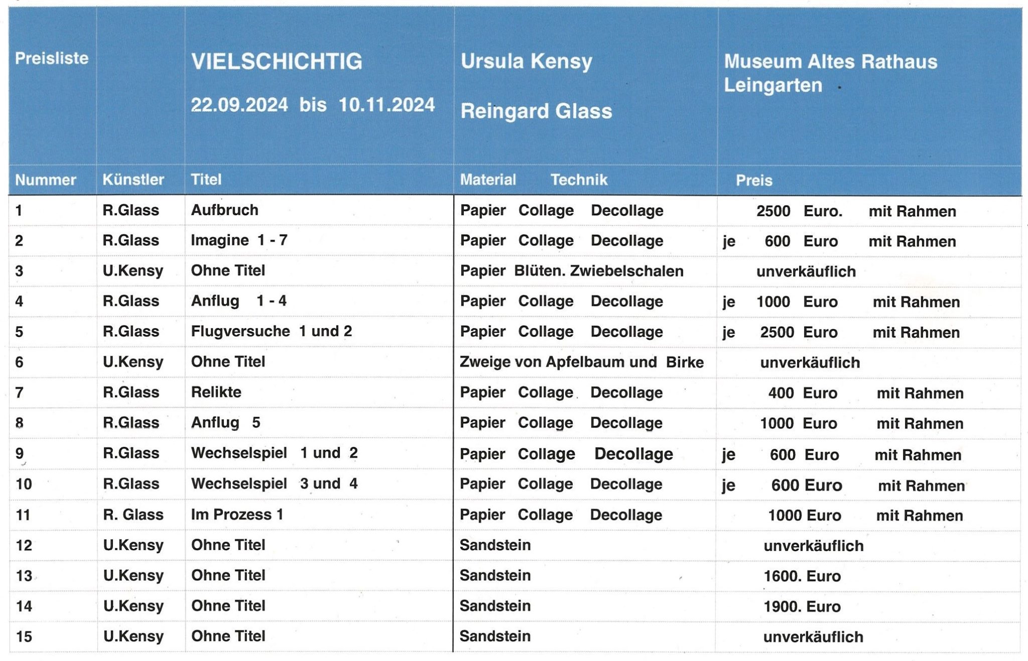 From September 22 to November 10, 2024, the KULTURMARKT LEINGARTEN presented another exhibition worth seeing in the MUSEUM ALTES RATHAUS at Eppinger Straße 150 under the title „vielschichtig“. The title „vielschichtig“ means „multi-layered“ in English. The spotlight was on sculptures created by Künzelsau sculptor URSULA KENSY and paper collage and decollage works by Bad Mergentheim-based artist REINGARD GLASS. Art historian and Neckarsulm museum director NATHALIE SCHEERLE-WALZ spoke at the opening.