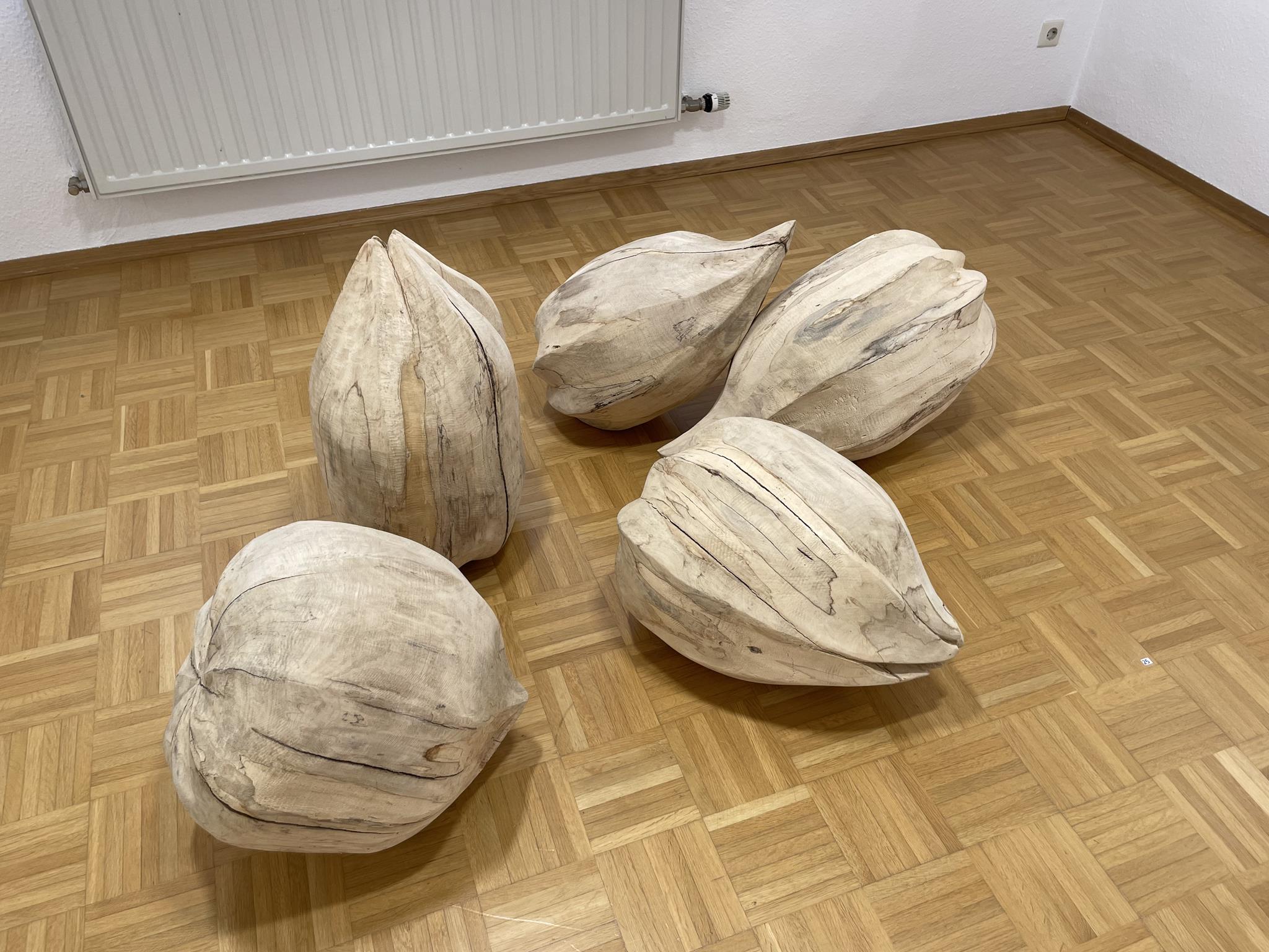 URSULA KENSY, born in Salem on Lake Constance in 1956, is an artist member of the Hohenloher Kunstverein and has been working as a freelance sculptor since 1983. From 1979 to 1983, she studied at the Freie Kunstschule Nürtingen. The artist works with stone, bronze, natural materials and paper. Her sculptures, with their inexhaustible variety of seed and fruit shapes, are reminiscent of botanical archetypes and seem like echoes from the garden.