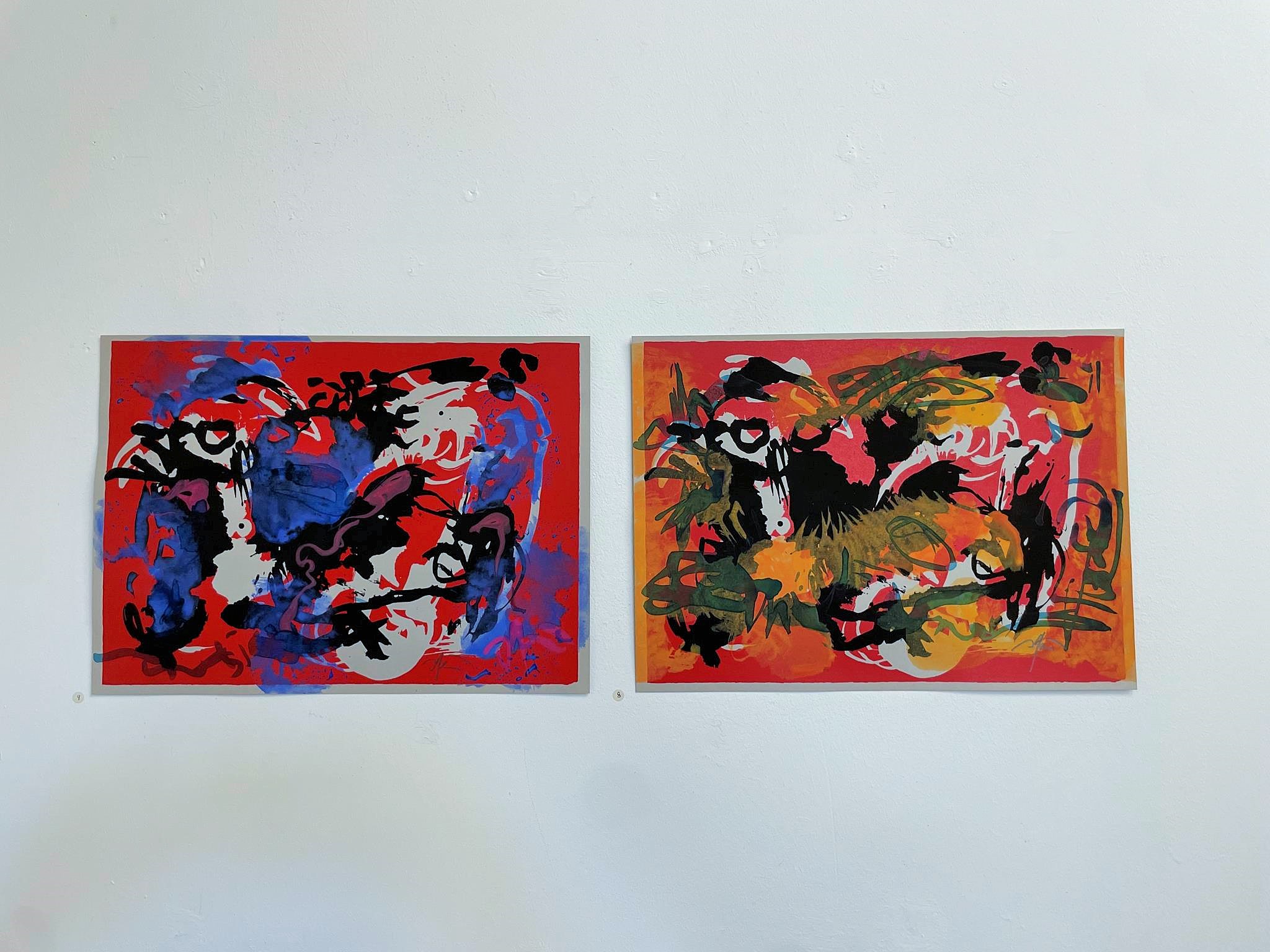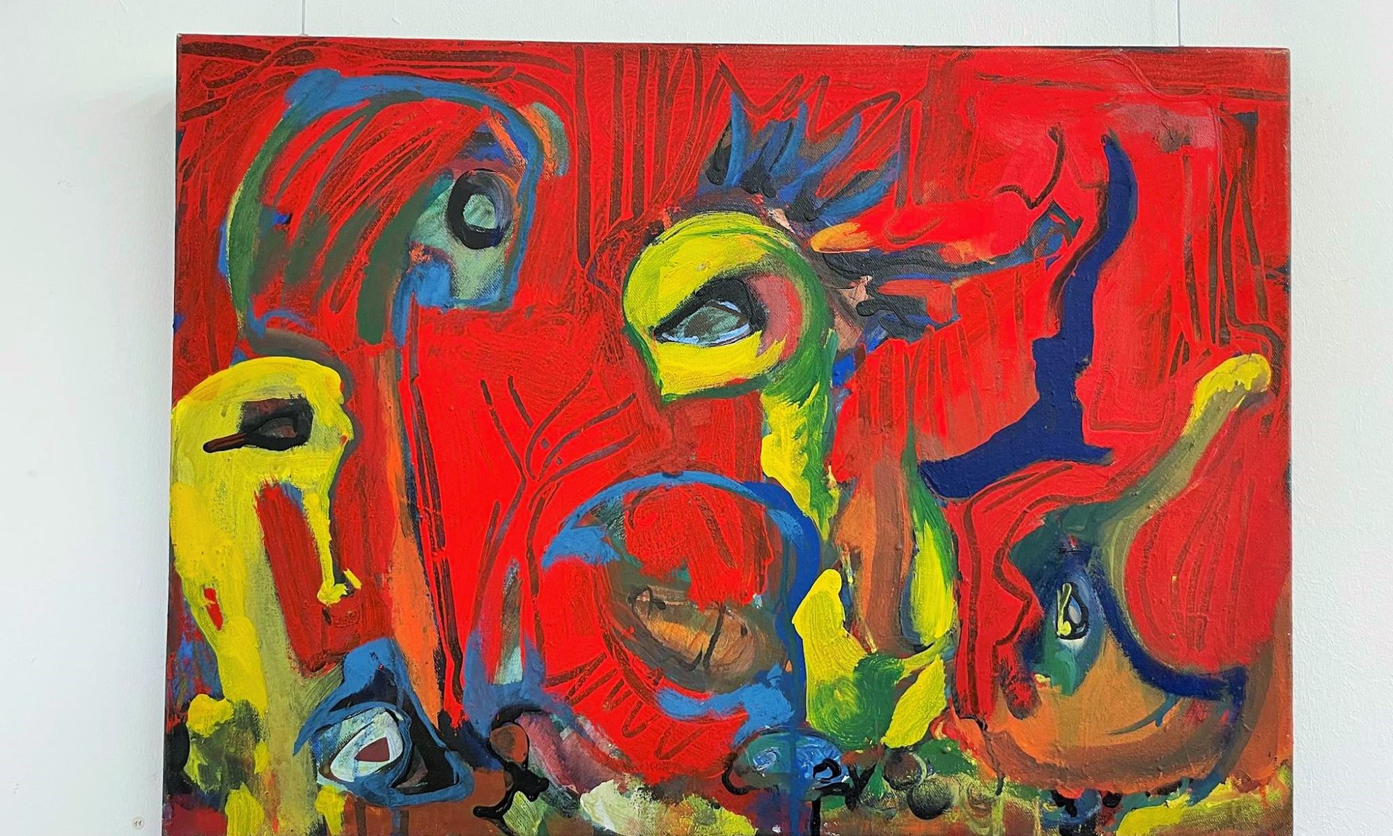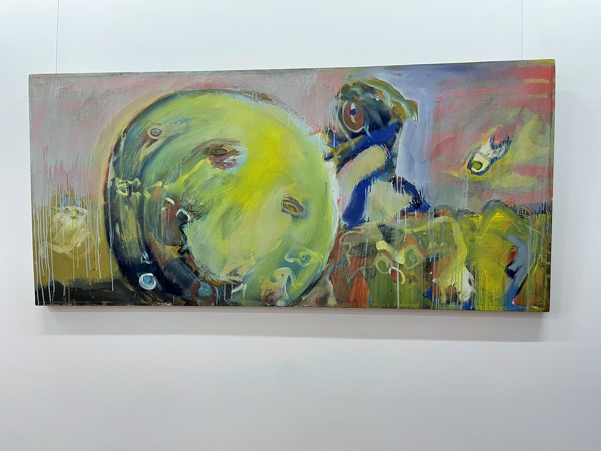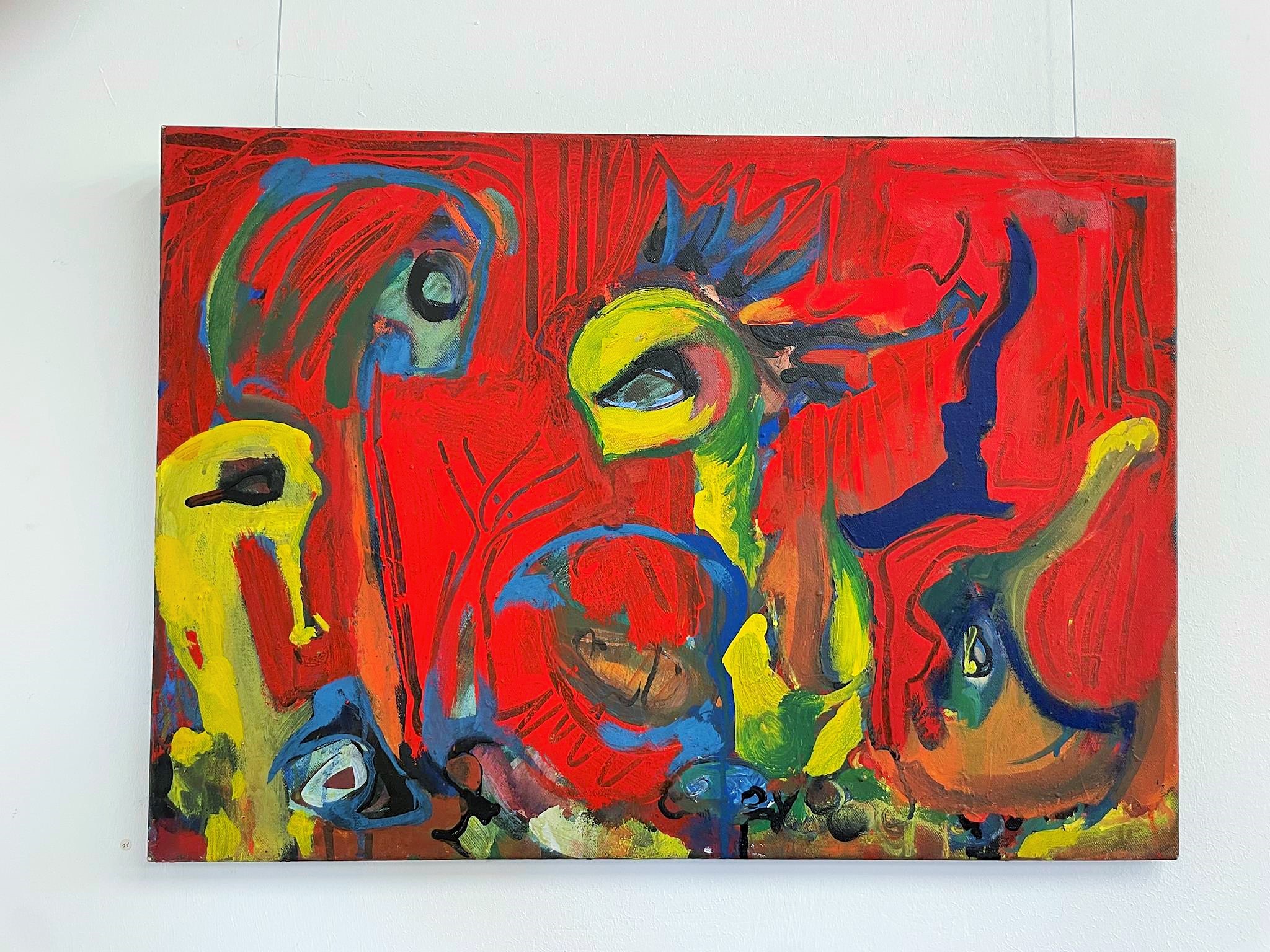 This is also evident in the works spanning almost 40 years gathered in the Nordheim barn. Anyone who approaches them wonders whether they could actually have been created by one and the same artist. Each work has its own expression. Each stands on its own. Thus, Sisyphus, rolling his yellow ball, penetrating blue, down the mountain in the earthy green painting „Happily Ever After“ from 1988, still appears clearly as a clearly recognizable male figure. The two yellow and the blue „Prophets,“ painted in the spirit of fantastic realism on a fiery red ground at the end of his studies, appear more enigmatic. They demand significantly greater empathy, a greater capacity for imagination, and a more vivid fantasy. In his medium-format oil painting „Im Bach nur Trout,“ painted in 1990/91, a good two years later during his time as a master student, Heil relies on dark red and violet and chooses an even stronger abstraction. If you look at the image for a while, you’ll see a face reminiscent of African sculptures and blue- and white-rimmed pupils, searching for the trout in the stream announced in the title. But the trout have apparently hidden themselves.