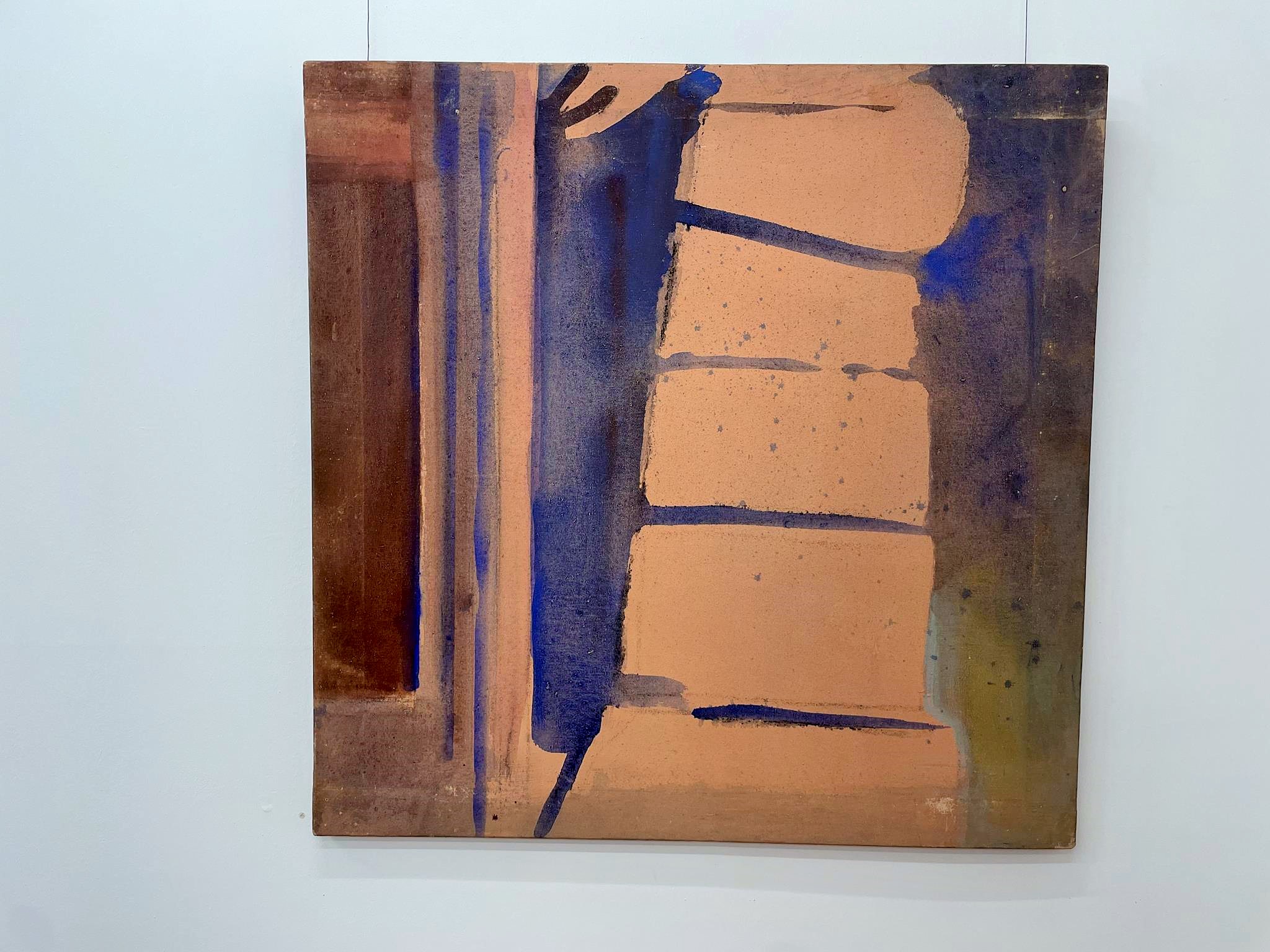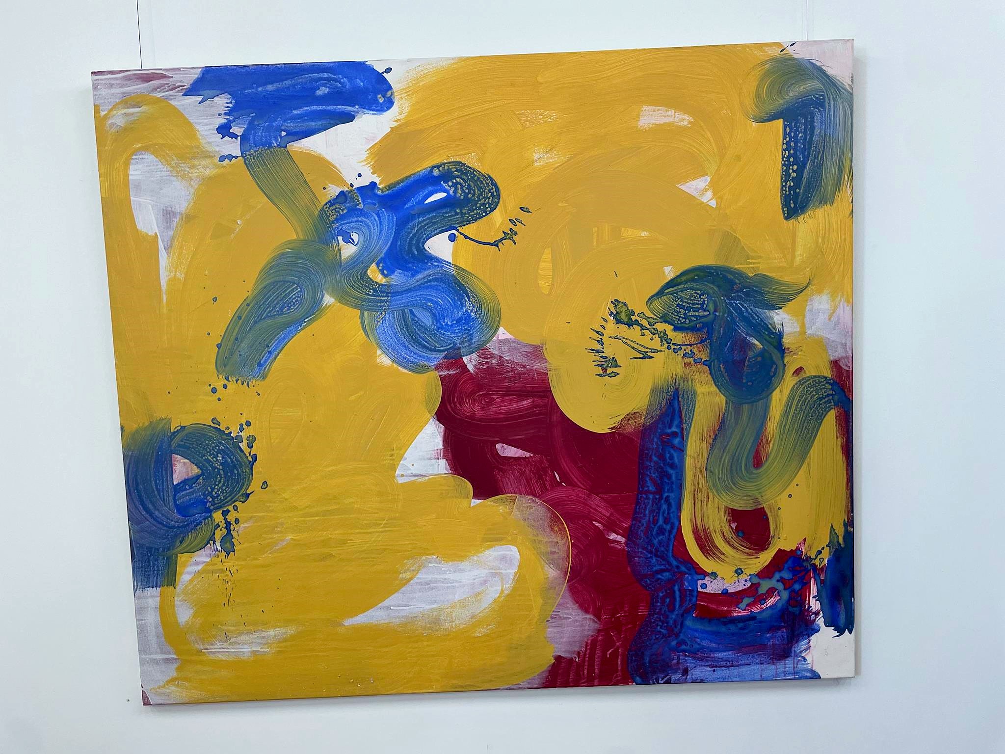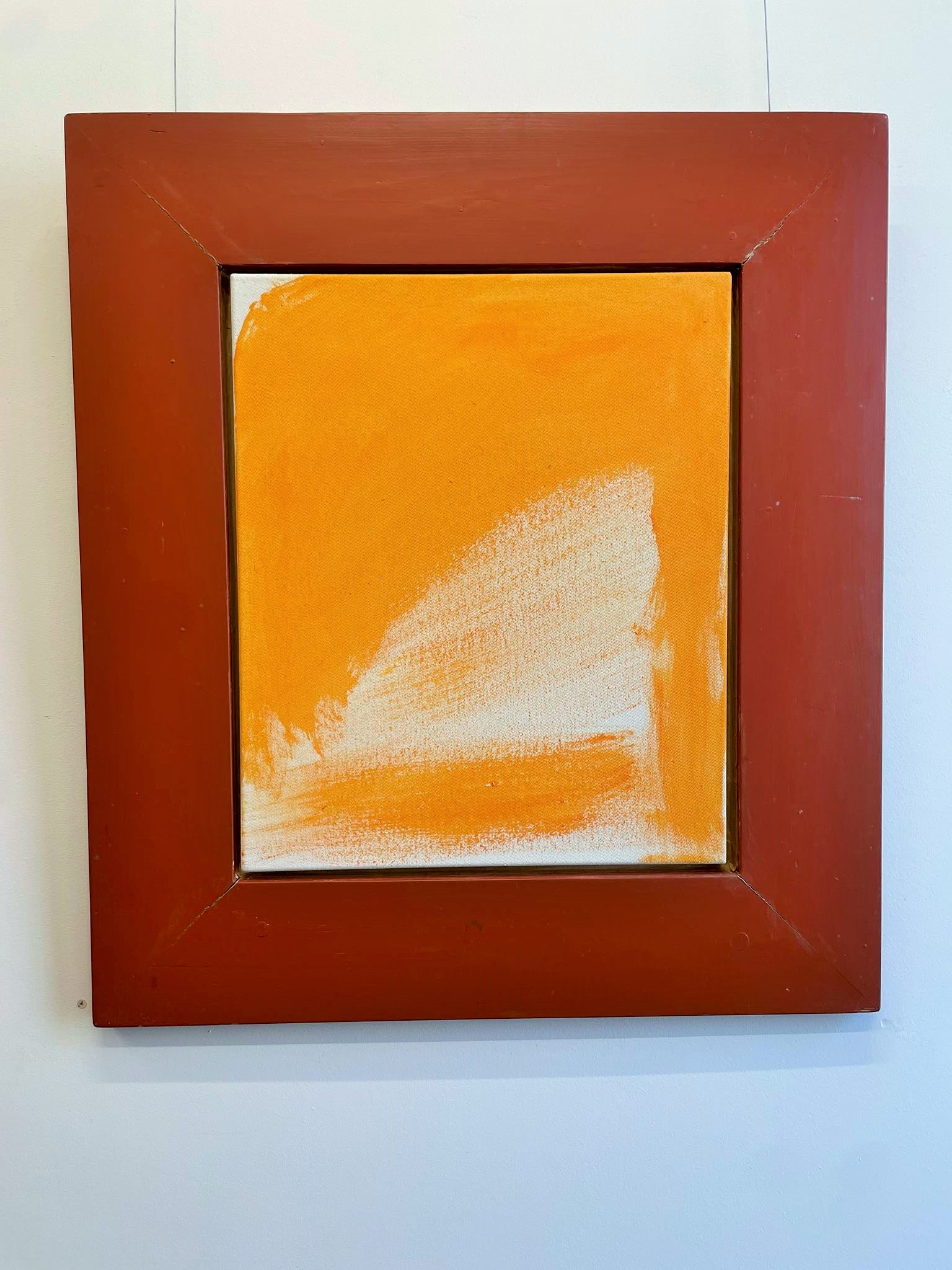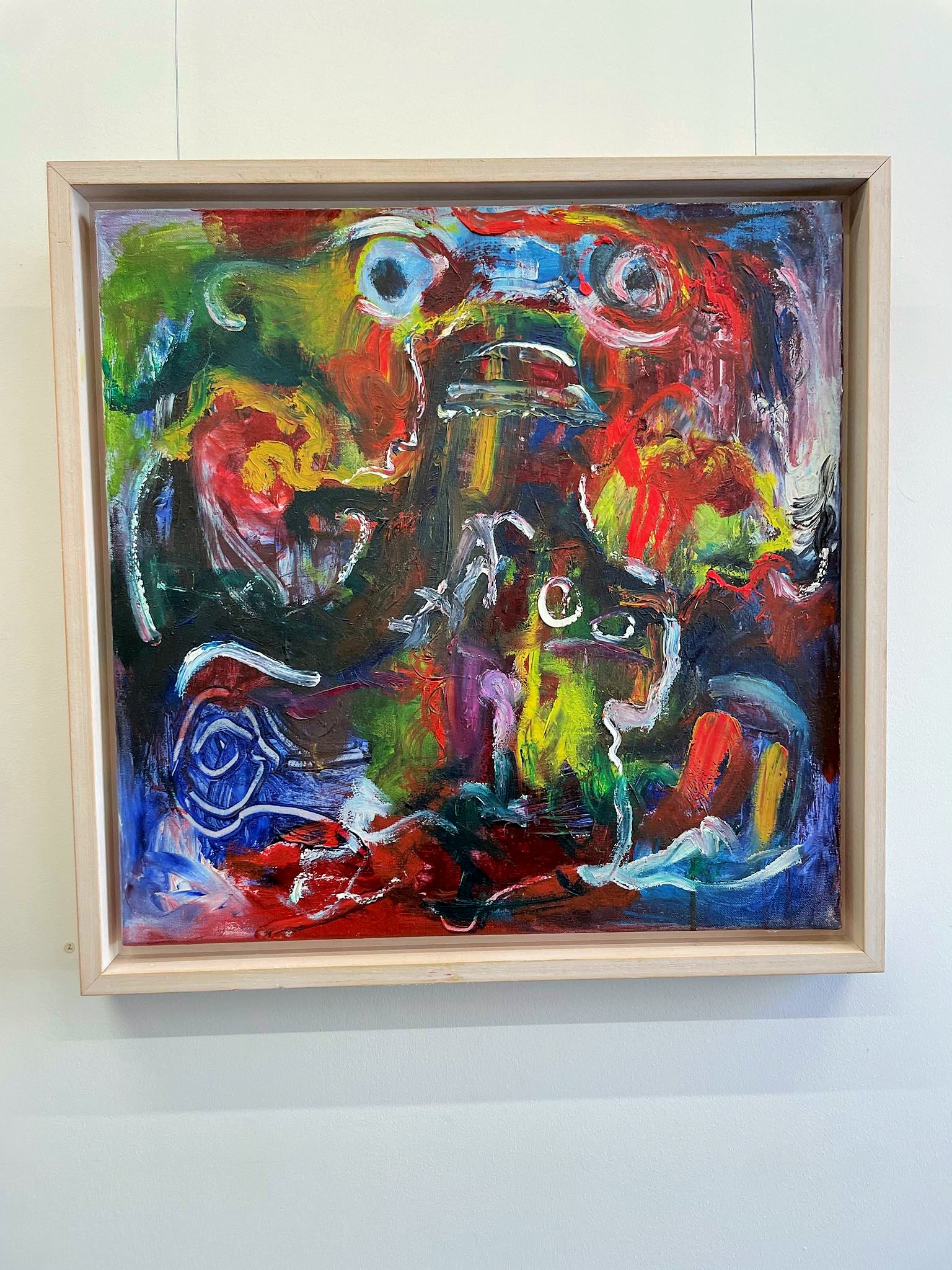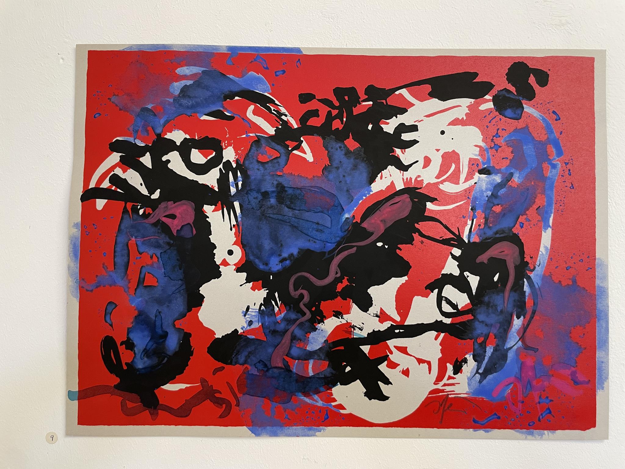 This is also evident in the works spanning almost 40 years gathered in the Nordheim barn. Anyone who approaches them wonders whether they could actually have been created by one and the same artist. Each work has its own expression. Each stands on its own. Thus, Sisyphus, rolling his yellow ball, penetrating blue, down the mountain in the earthy green painting „Happily Ever After“ from 1988, still appears clearly as a clearly recognizable male figure. The two yellow and the blue „Prophets,“ painted in the spirit of fantastic realism on a fiery red ground at the end of his studies, appear more enigmatic. They demand significantly greater empathy, a greater capacity for imagination, and a more vivid fantasy. In his medium-format oil painting „Im Bach nur Trout,“ painted in 1990/91, a good two years later during his time as a master student, Heil relies on dark red and violet and chooses an even stronger abstraction. If you look at the image for a while, you’ll see a face reminiscent of African sculptures and blue- and white-rimmed pupils, searching for the trout in the stream announced in the title. But the trout have apparently hidden themselves.