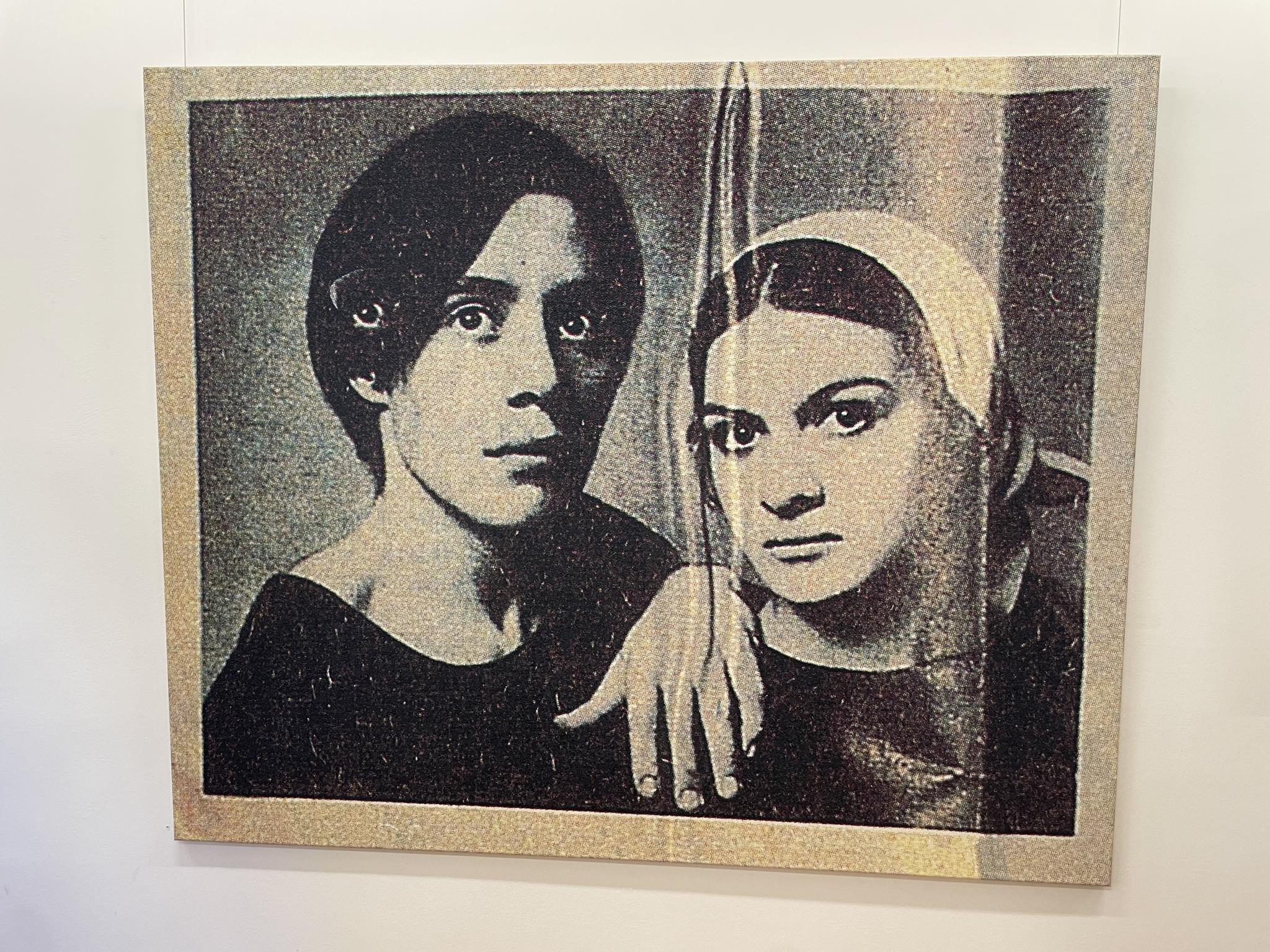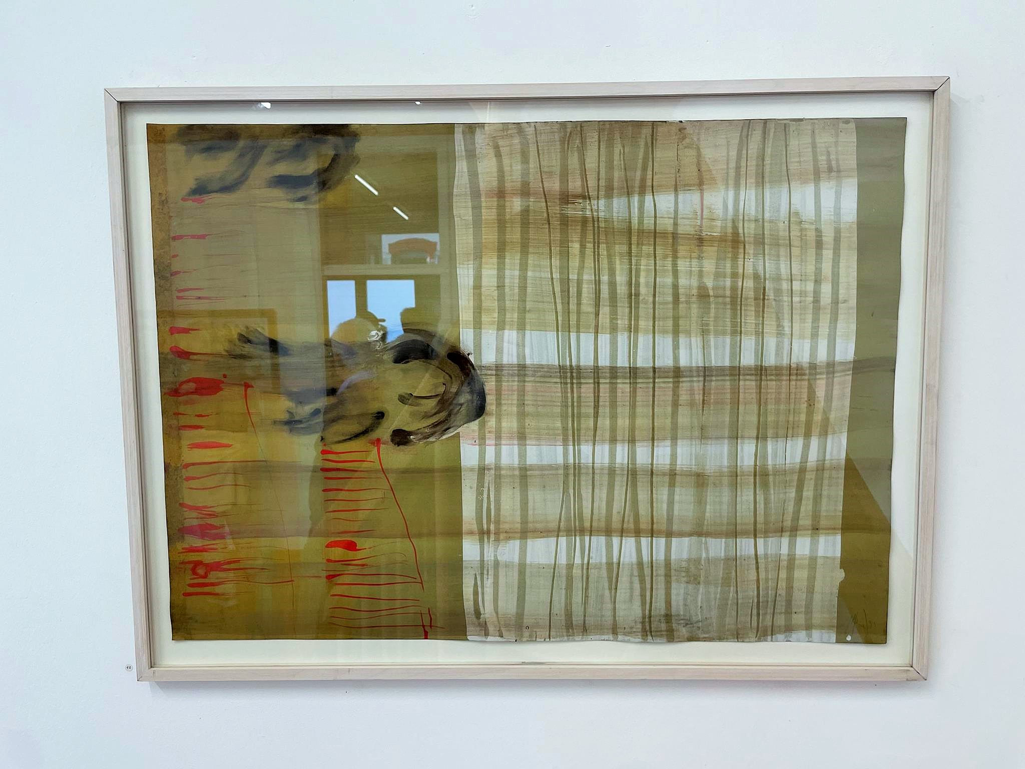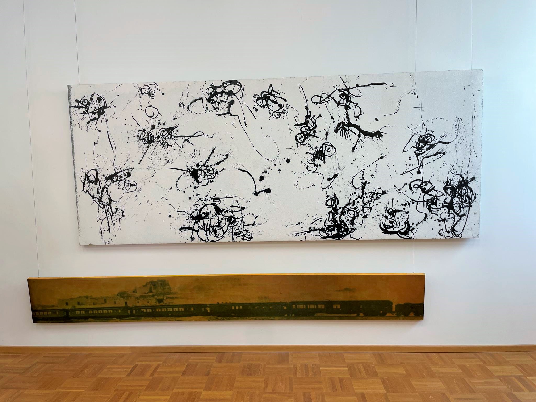 With the ochre-colored tempera painting „North Beach (Oahu)“ from 1997, Heil lands on abstraction. After a long period of practice, he appears to have placed it in three or four brushstrokes, filling the picture space, in the 48 x 40 cm portrait format, which flows into the extra-wide dark brown frame. Picture and frame are interdependent. They belong together. „The New Frontier (for H.F.)“ from 2008, under „Floraison des éclairs,“ transfers the train, photographed in Portugal and used for Western scenes in Western films, onto the cotton using an emulsion process. In „Brothersisterfather“ from 2009, Heil starts with a black-and-white newspaper photograph of Pablo Picasso’s children Paloma and Claude. He wets it, thereby blackening the photograph, and folds it like a curtain. On the computer, he collages Pablo Picasso’s eye into the original photo, transforming the black dot pattern of the photograph into a red-yellow-blue one. The original is then printed on canvas using a kind of spray-paint technique.