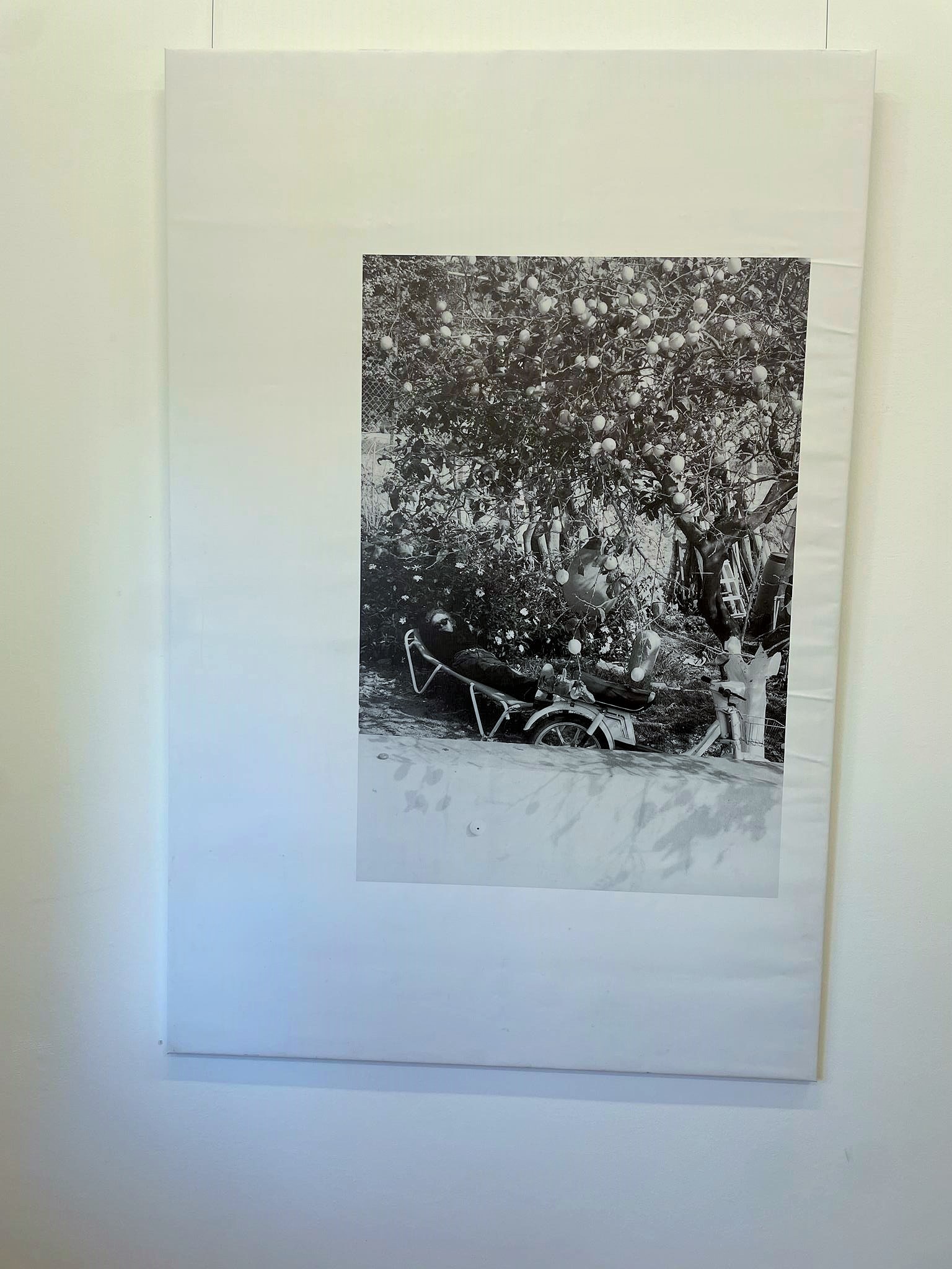 The sculpture „La petite chèvre“ (The Little Goat), composed of a fork, a two-pronged fork, and a saddle, references Picasso’s „Tête de taureau,“ the bull’s skull, which he invented in 1941 and cast in bronze in 1942. The skull was assembled from a bicycle saddle and handlebars. In the Surrealist scene, this sculpture has become a symbol of the gliding back and forth between worlds. Axel Heil found and purchased his goat’s head at a flea market in Paris. His little goat illustrates another variant of artistic transfer. Axel Heil himself would be best advised to explain how the photograph of the Mallorcan lemon tree came to be on the white plastic sheet of the work „Lemon Tree“ from 1995/2021, as well as the questions of what distinguishes his work as a professor for experimental transfer processes from his work as a professor for artistic research, and what interests him so much about Aby Warburg’s Mnemosyne that he has devoted over a decade of his artistic and professorial life to it. – Curator Helmut Albert Müller