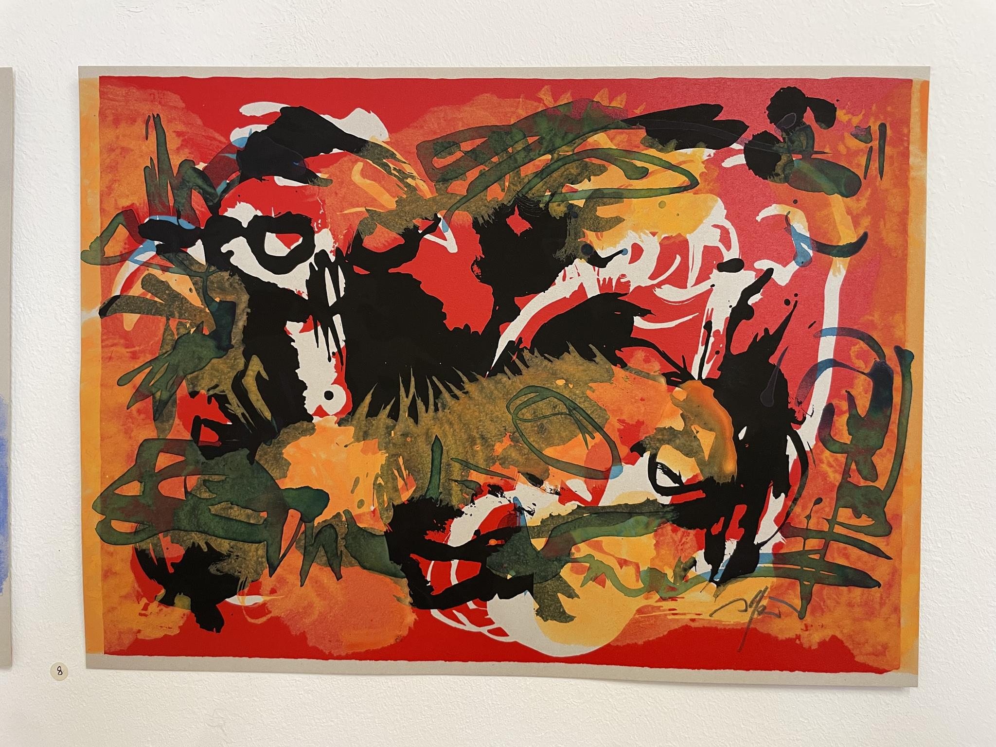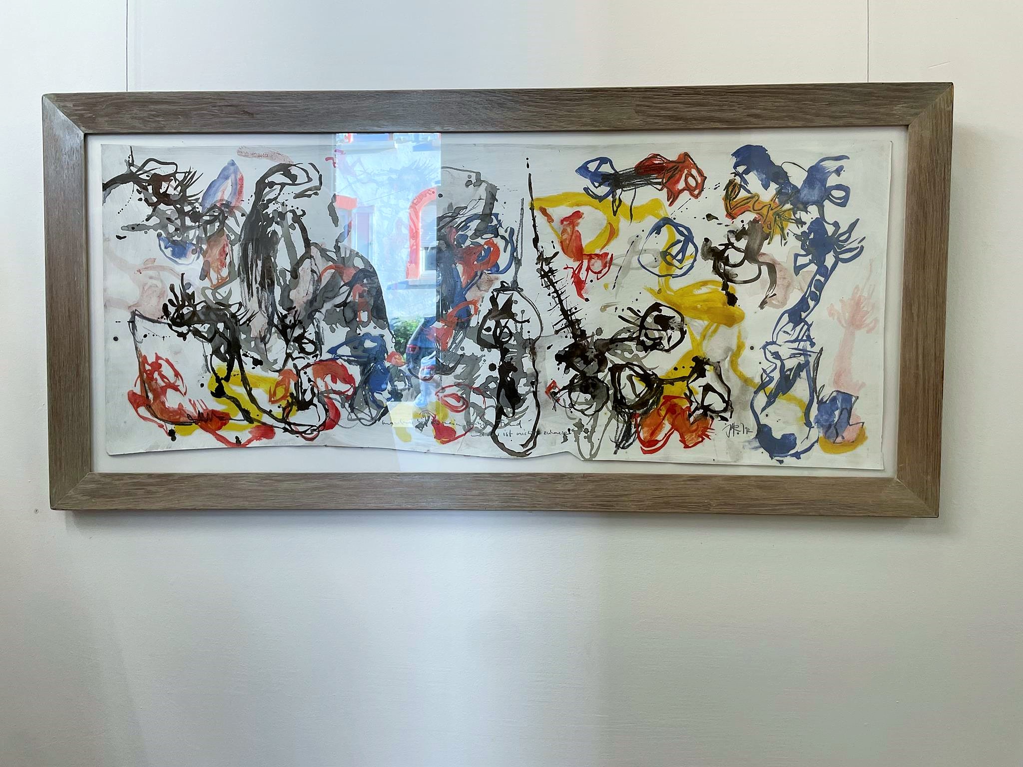A good year later, Heil found a taste for Art Informel in his 1992 landscape painting „Sometimes I’m my only friend and he’s not at home.“ With this work, painted in egg tempera, graphite, and ink on leatherboard, Heil seemingly abandoned figuration and classical form and composition, opting for free and spontaneous painting. In the dynamic scenery of brick-red, lemon-yellow, black, gray, and blue painterly abbreviations, one can nevertheless recognize a pair of lovers, a rider with erect hair, an eagle, a stork, a giraffe, and a mouse.